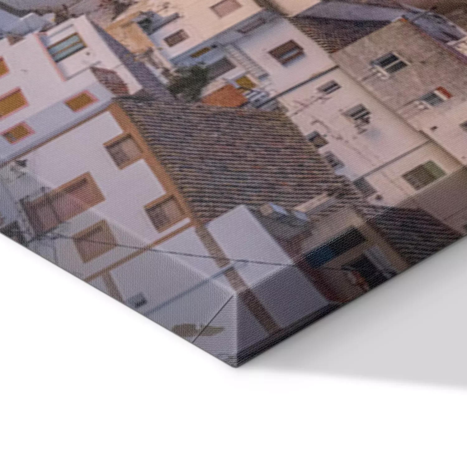 Tableau : Sunset aerial panorama view of Alcala del Jucar medieval historic village with white washed houses and a castle on a rock in Albacete Spain