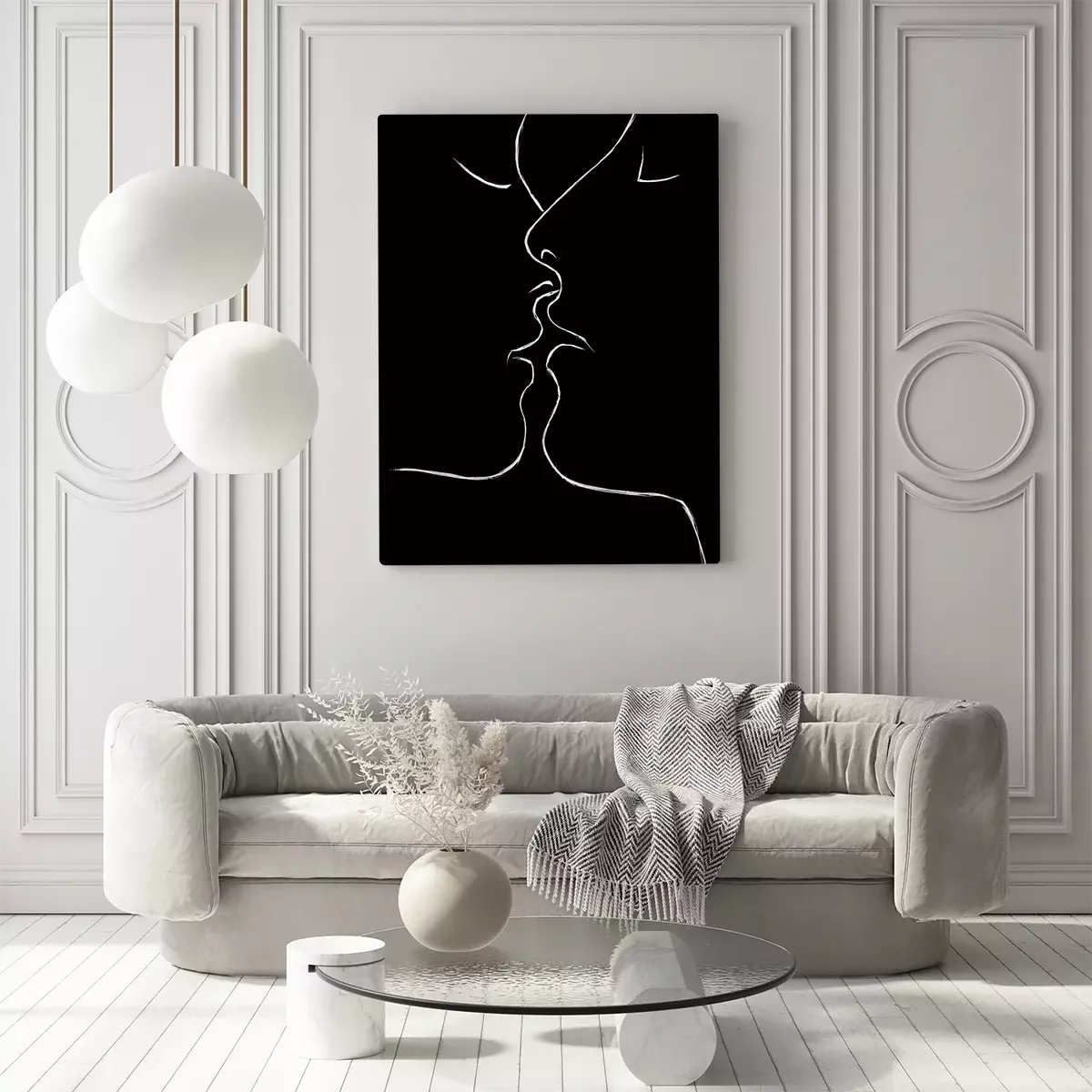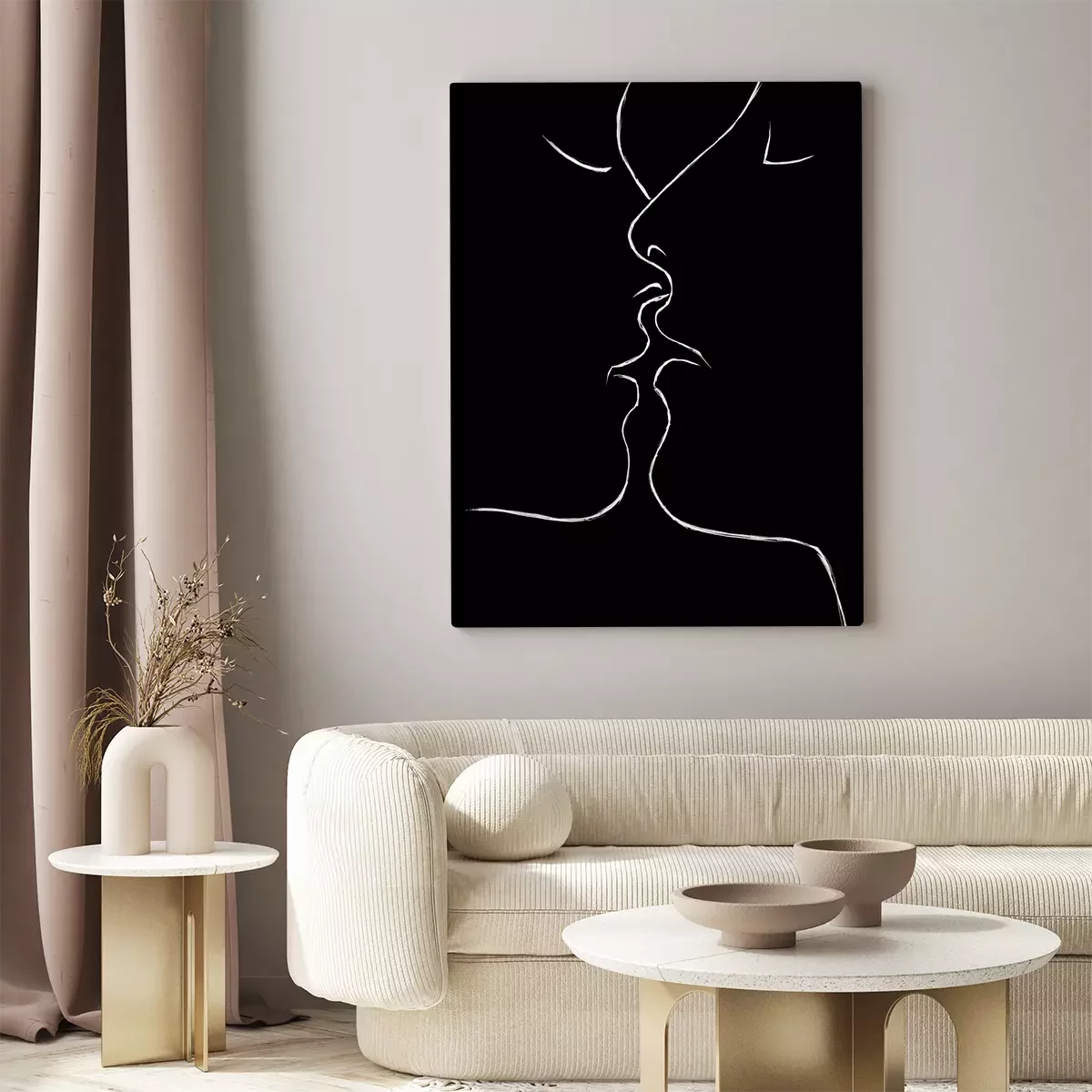 Sur fond noir, les contours lumineux de deux visages qui s'embrassent.