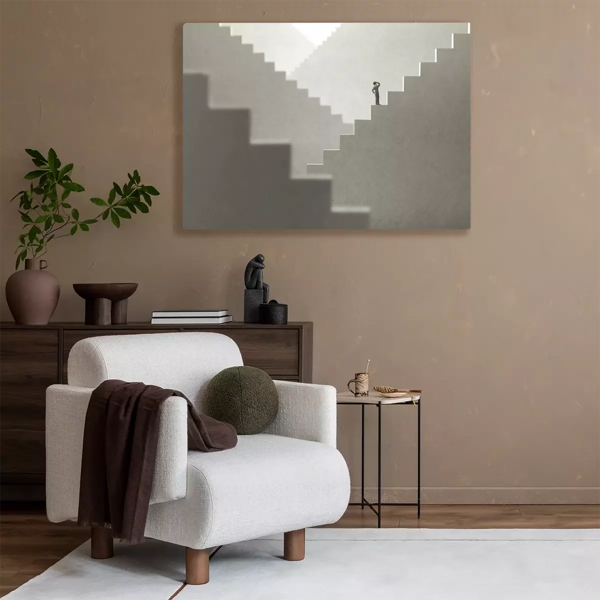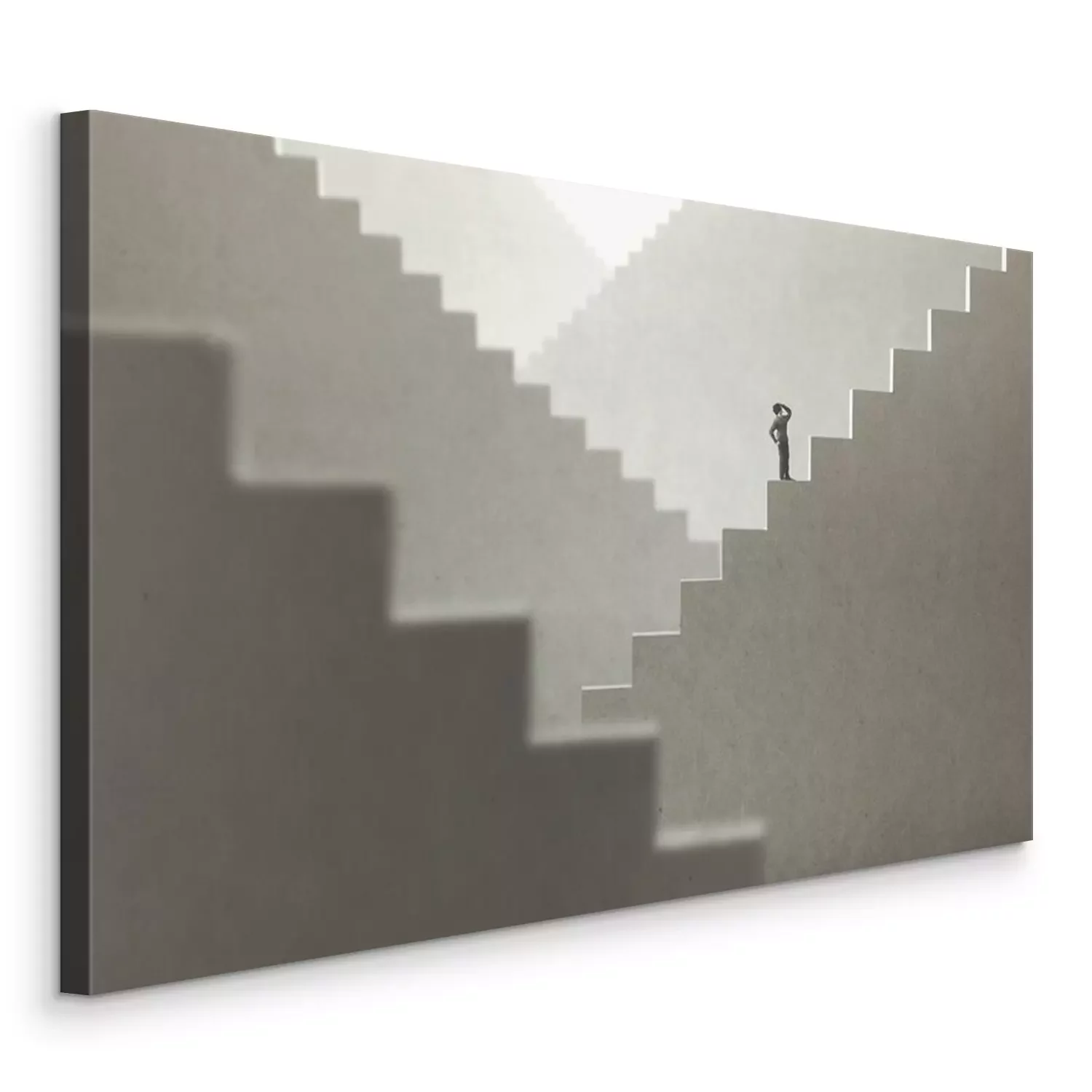 Tableau  surreal concept of a man rising stairs to try to reach the top