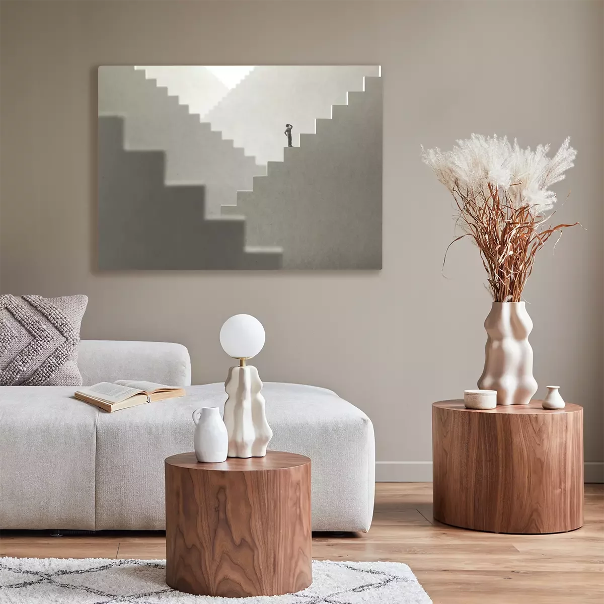 Tableau : surreal concept of a man rising stairs to try to reach the top