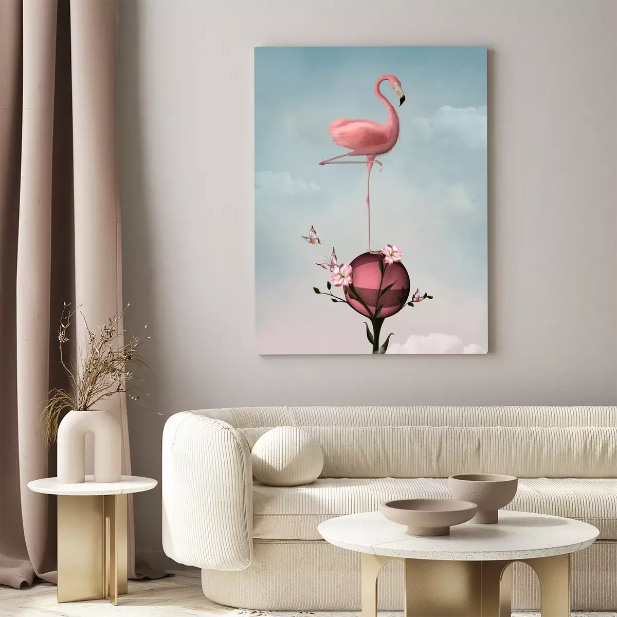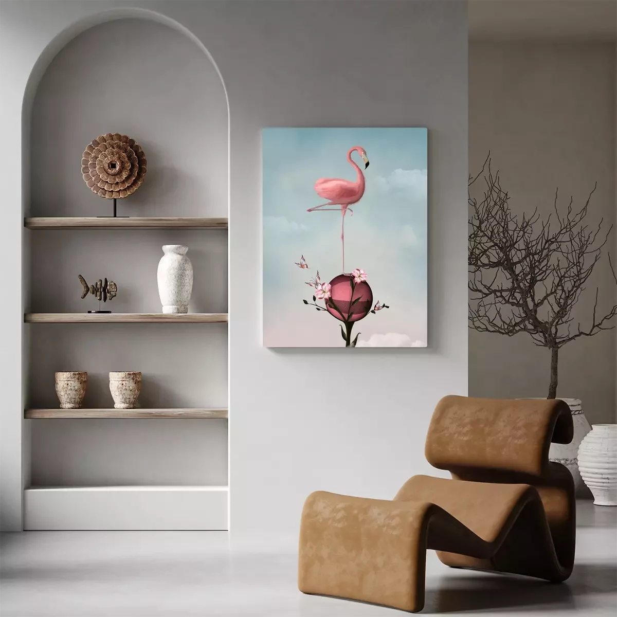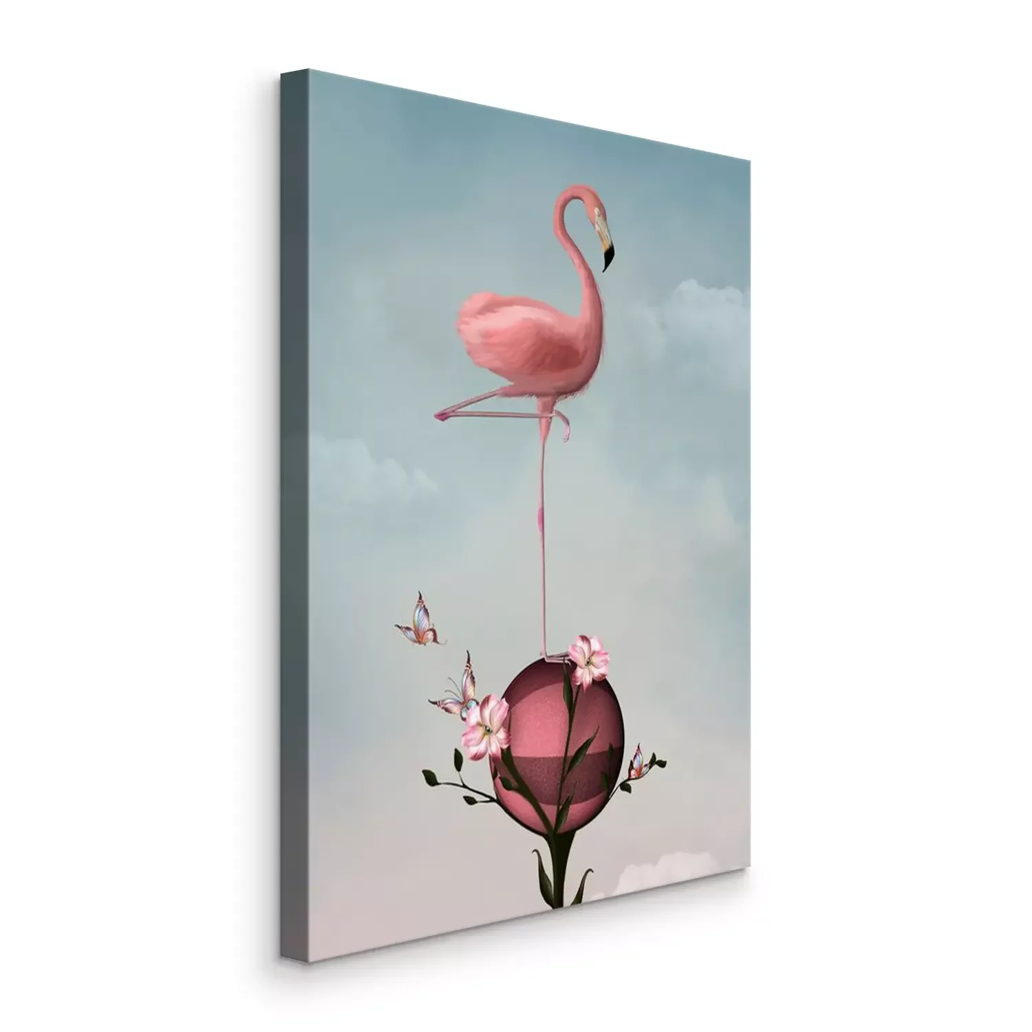 Tableau : Surréaliste, composition, flamant, fleurs