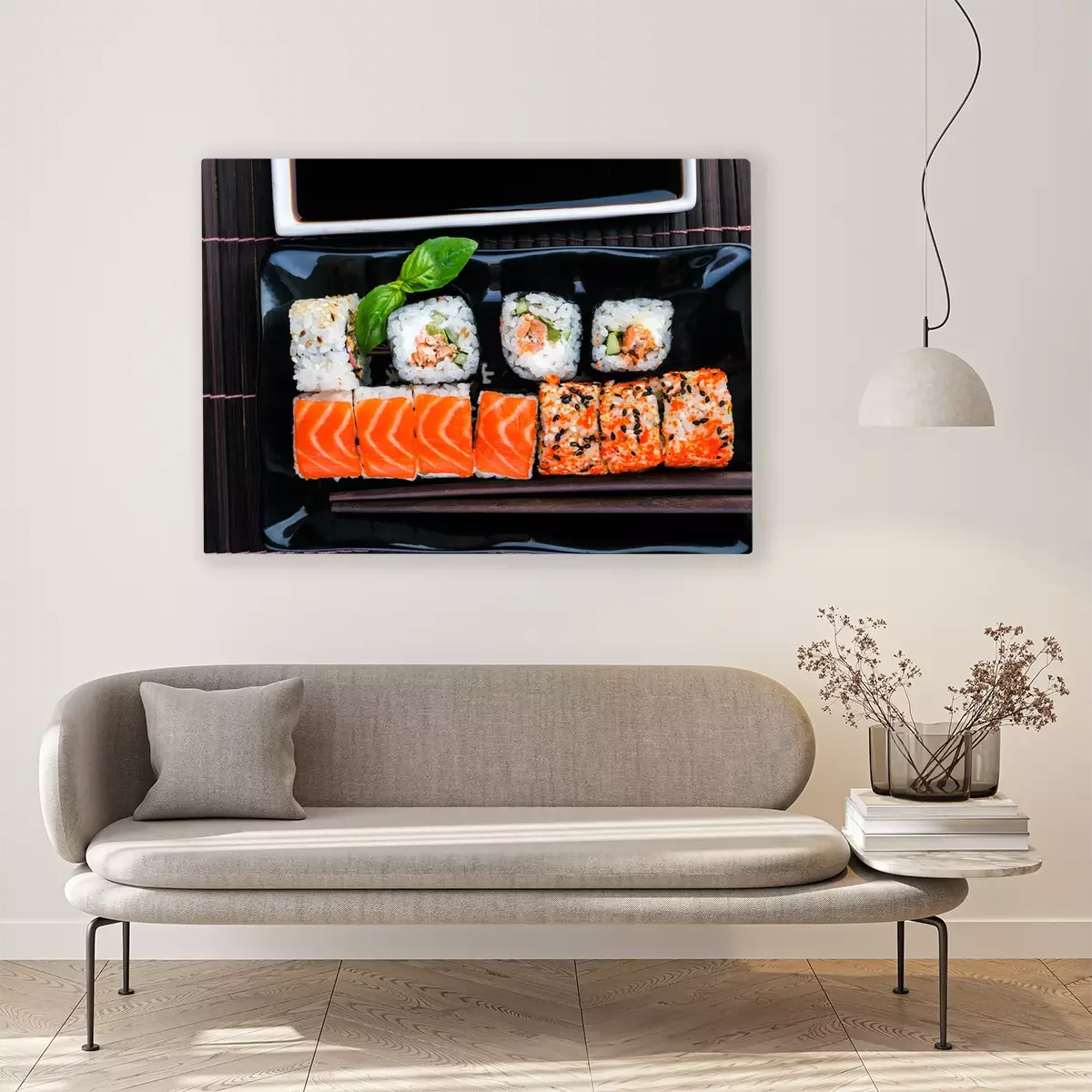 Tableau : sushi roule assortiment sur plaque noire et des baguettes. Rouleaux traditionnels sur le plat.
