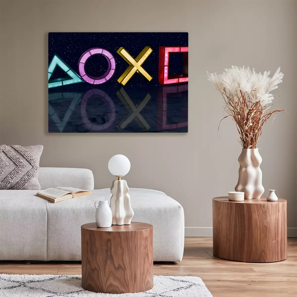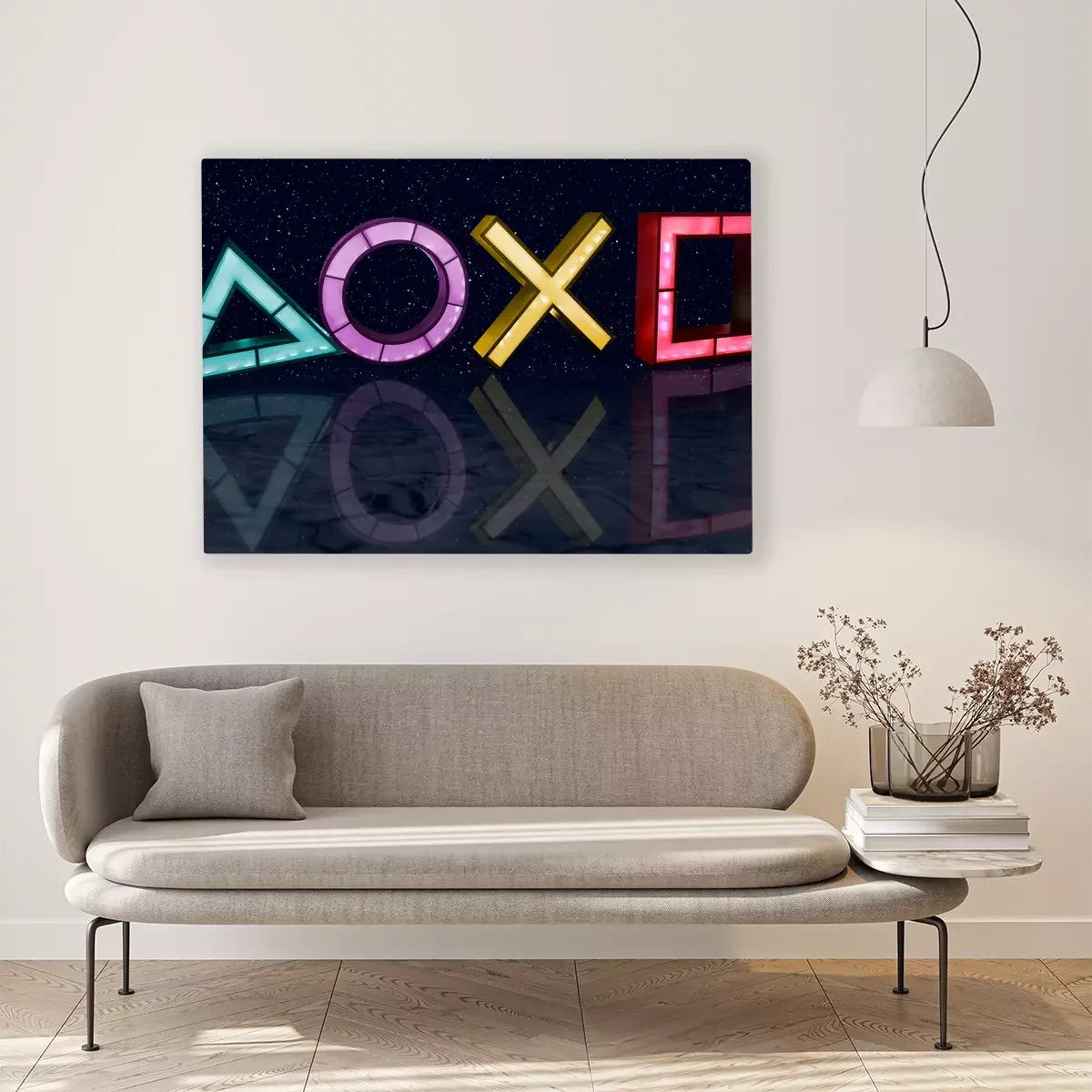 Symboles de jeux vidéo néon se reflétant sur le sol