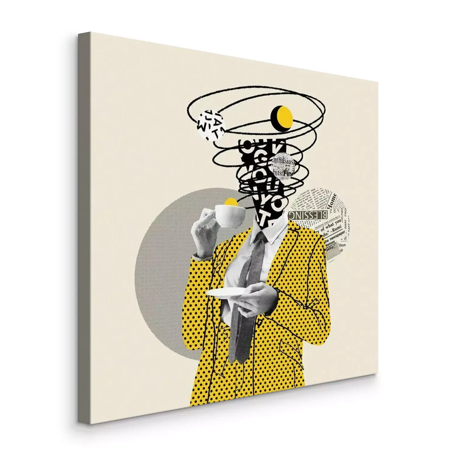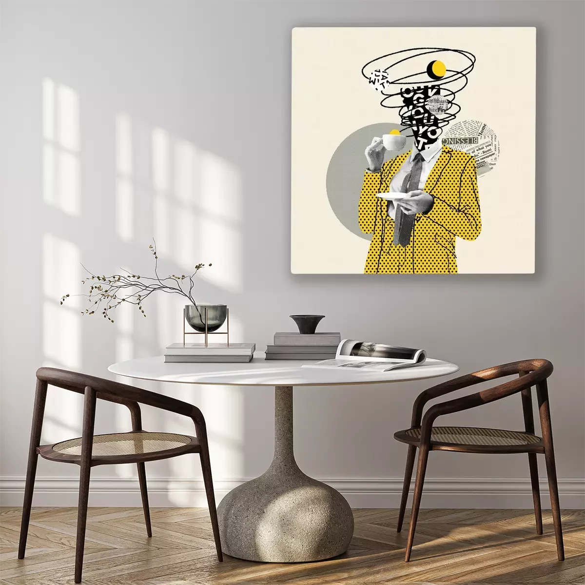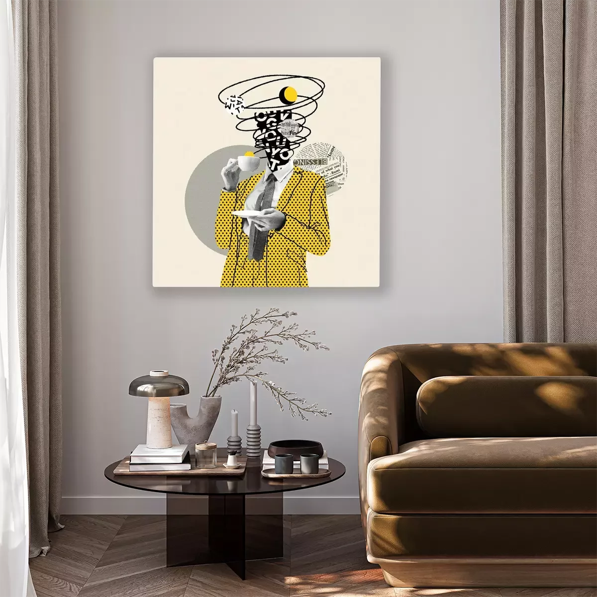 Tableau : Taking a break. Comics styled yellow dotted suit. Modern design, contemporary art collage. Inspiration, idea concept, trendy urban magazine style. Negative space to insert your text or ad.