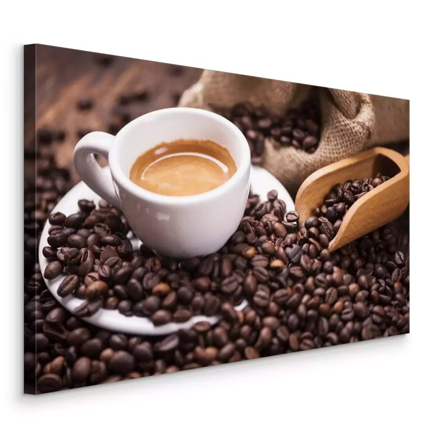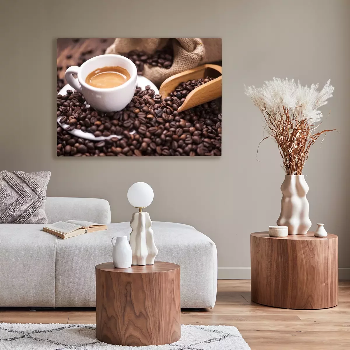 Tableau  Tasse à café close-up sur des grains de café grillés noirs