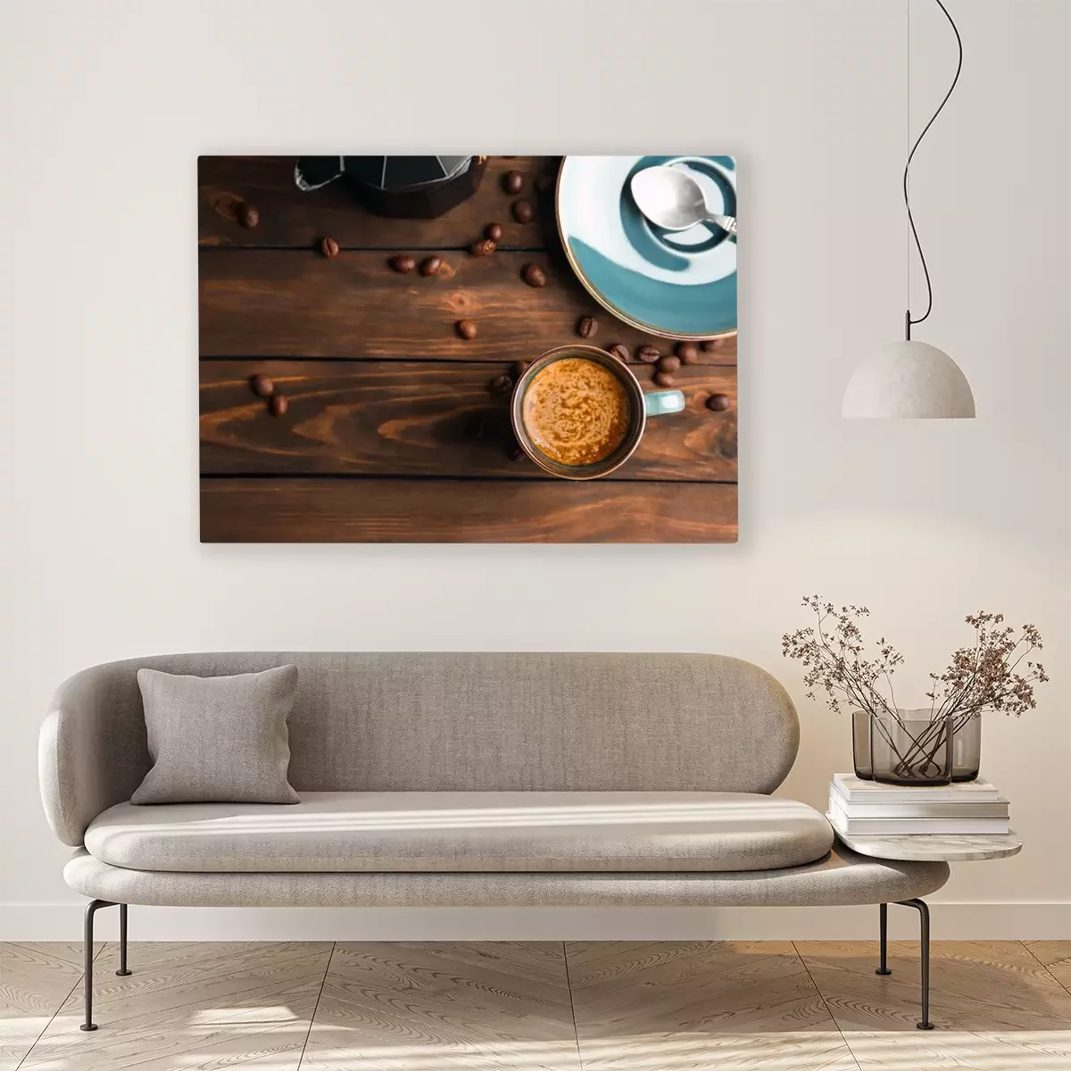 Tableau  Tasse de café chaud aromatique et haricots sur table en bois, vue de dessus