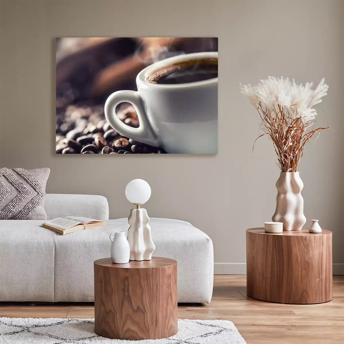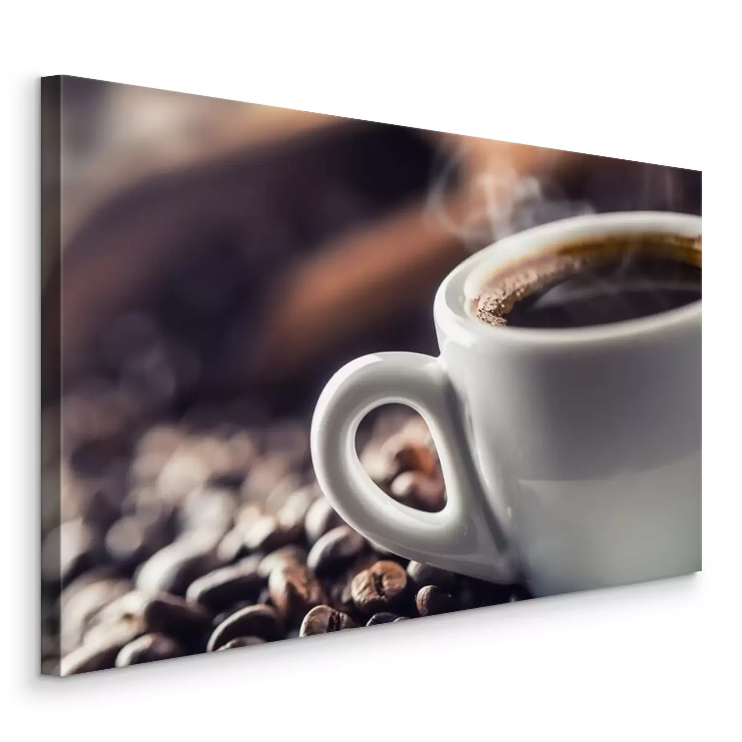 Tableau : Tasse de café noir avec des haricots sur une table en bois