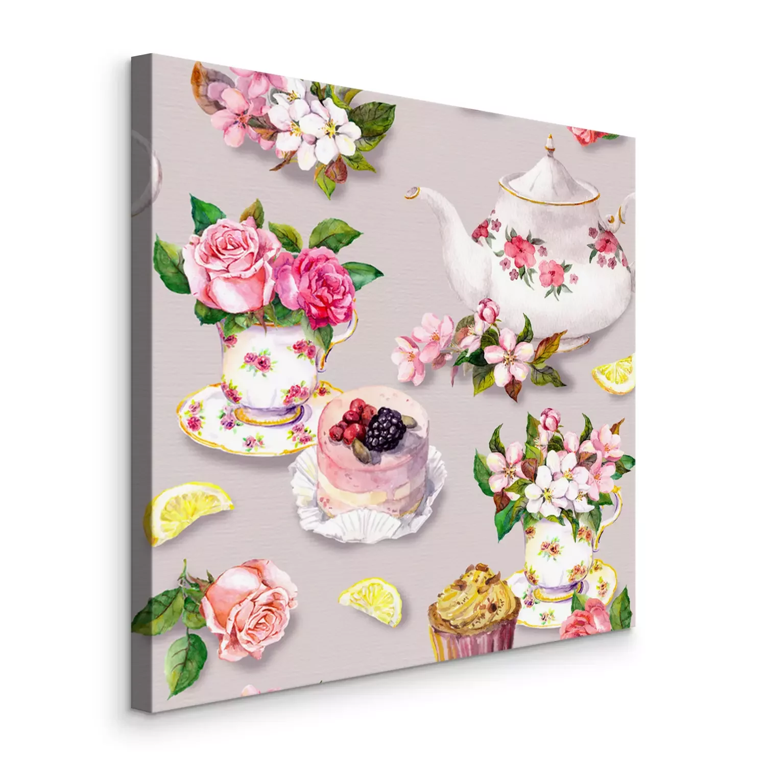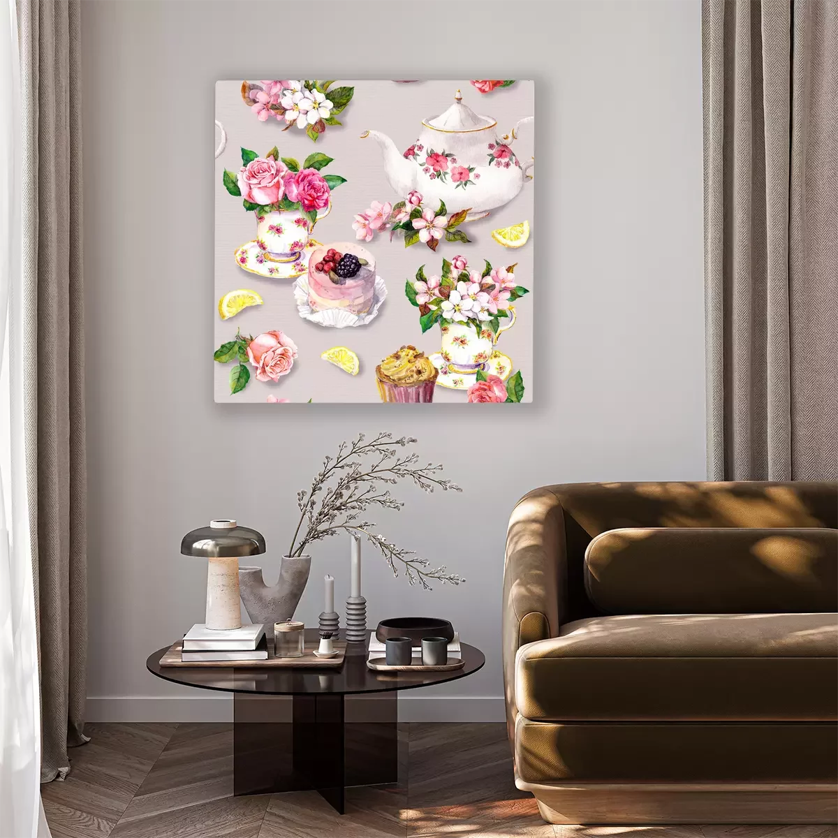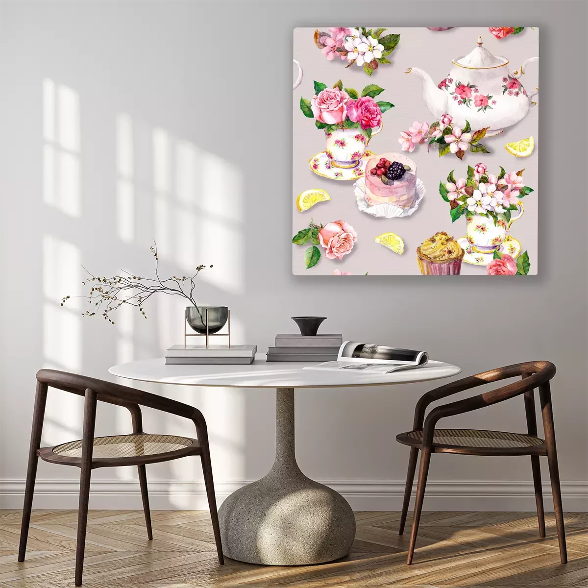 Tableau  Teatime motif: fleurs, tasse à thé, gâteau, théière. Aquarelle. Seamless, fond