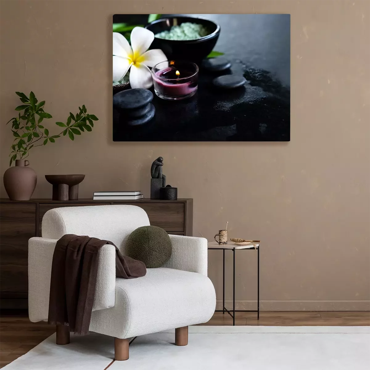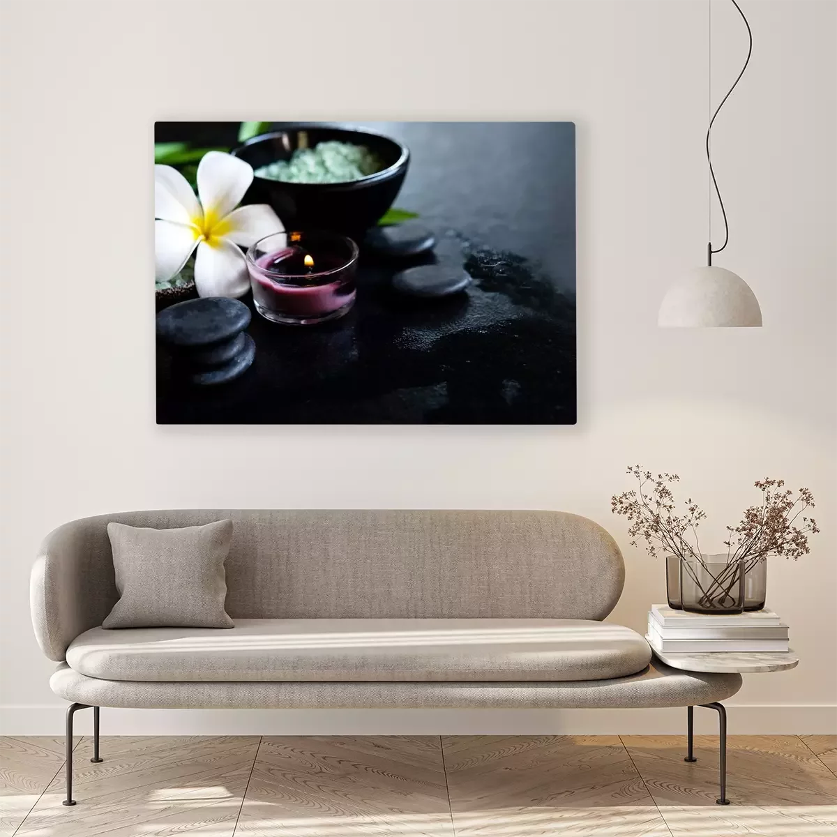 Tableau  Thai Spa.  Top view of white Plumeria flower setting for massage treatment and relax on concrete blackboard with copy space.  Green leaf with black stones pile for spa therapy. Healthy Concept.