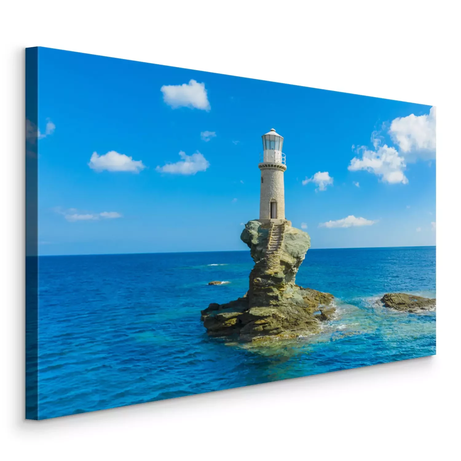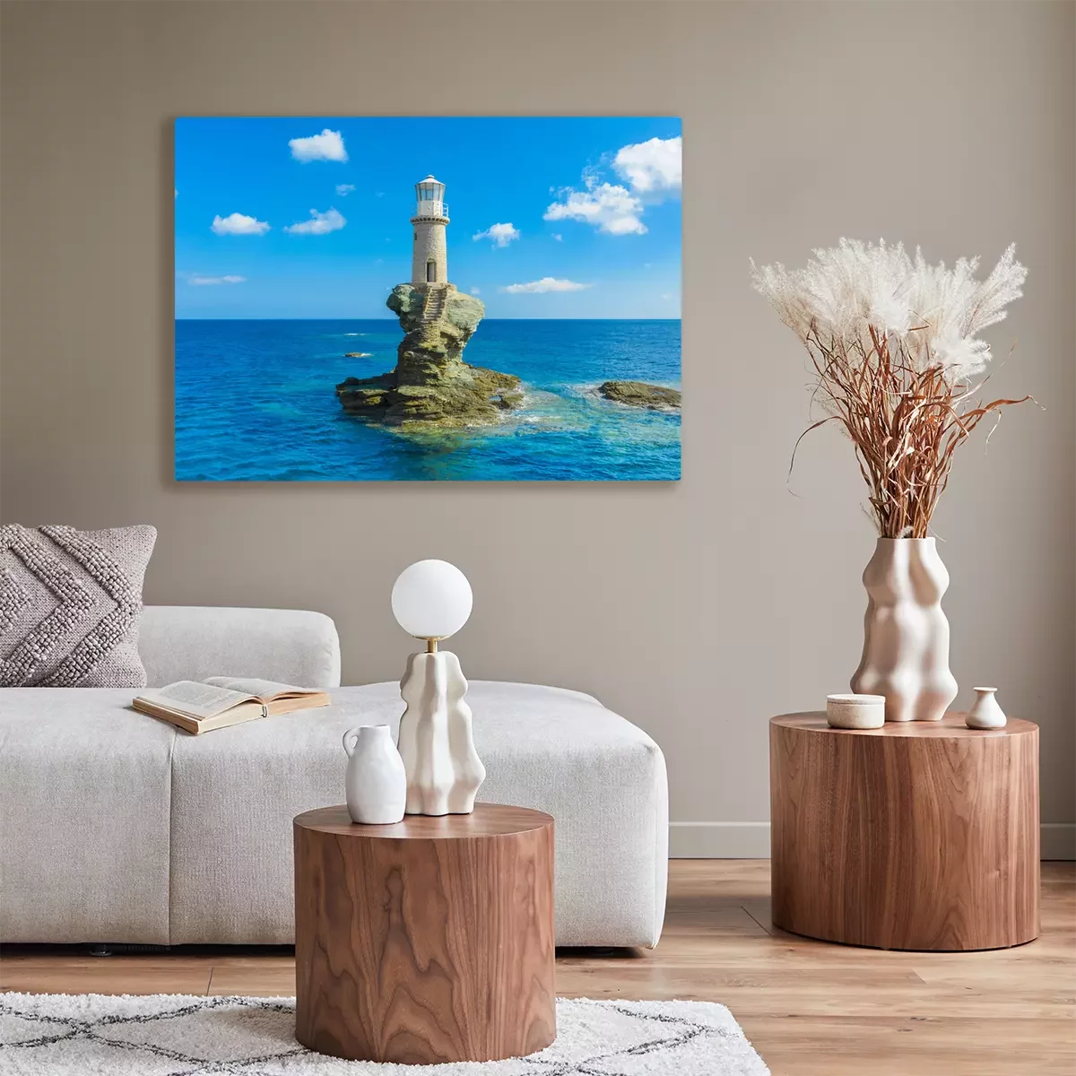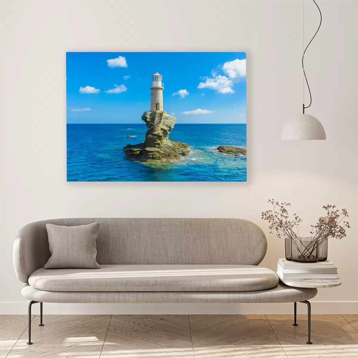Tableau  The beautiful Lighthouse Tourlitis of Chora in Andros island and a seagull, Cyclades, Greece