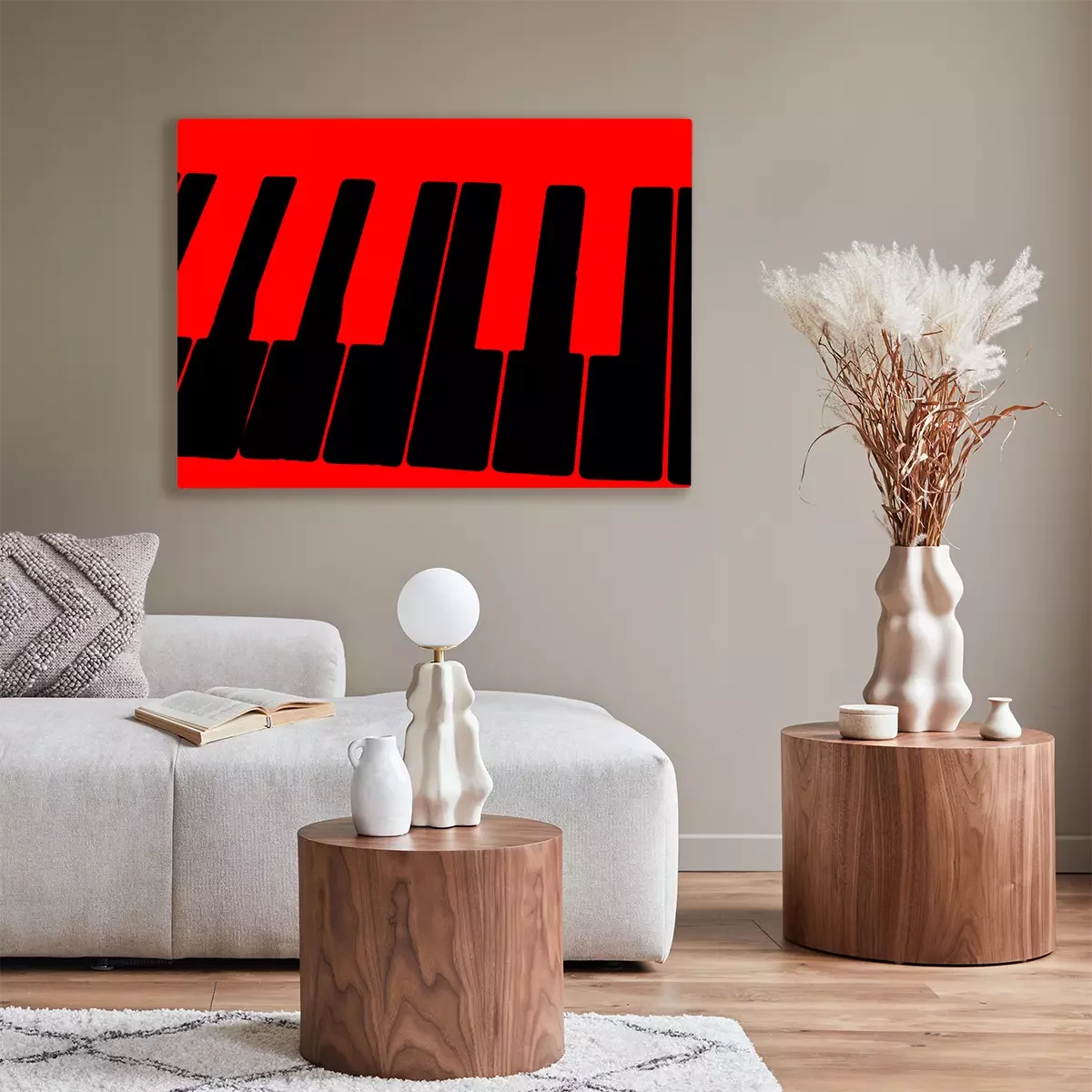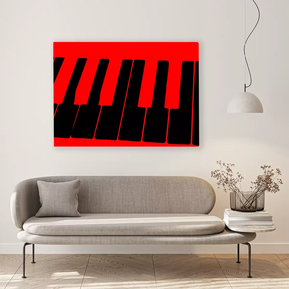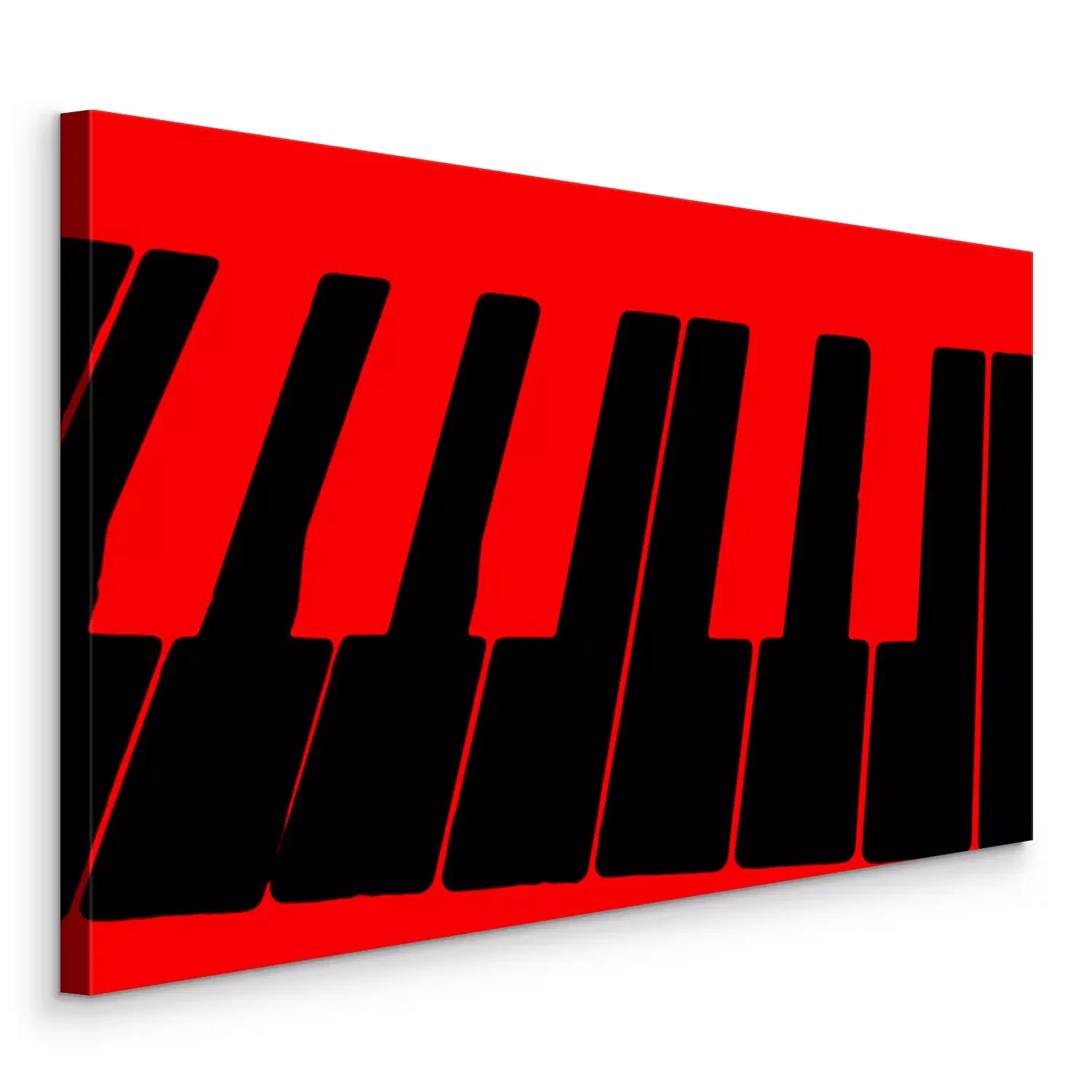 Tableau  The schematic image of the keys of a musical instrument on a bright red background.