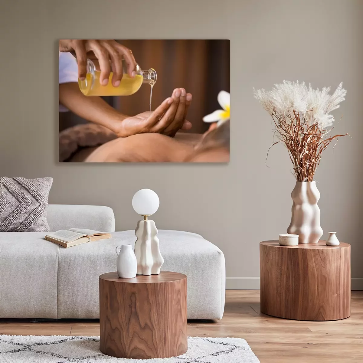 Tableau : Thérapeute versant de l'huile de massage au spa