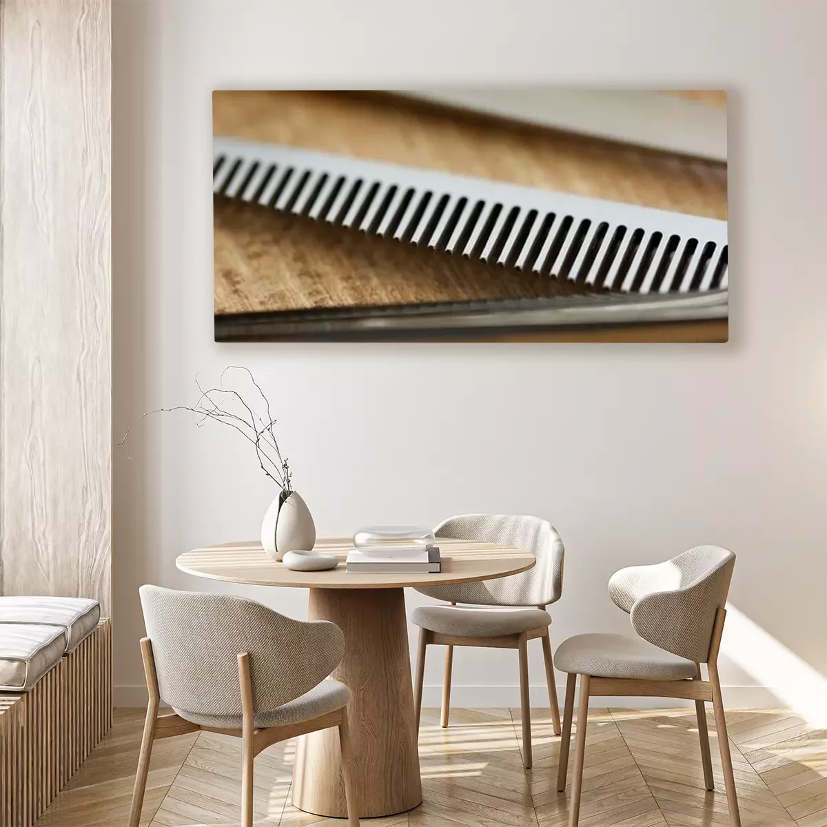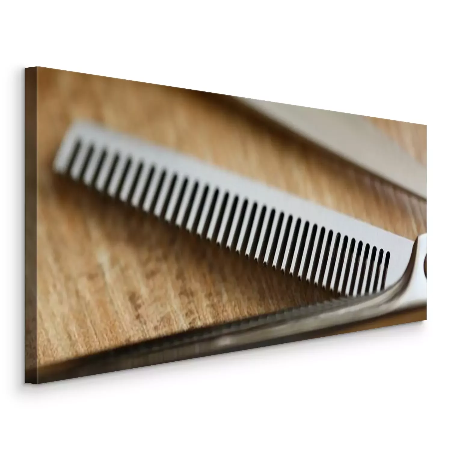 Tableau  Thinning shears lie on wooden table in hair salon closeup. Stylish hairstyle concept background.