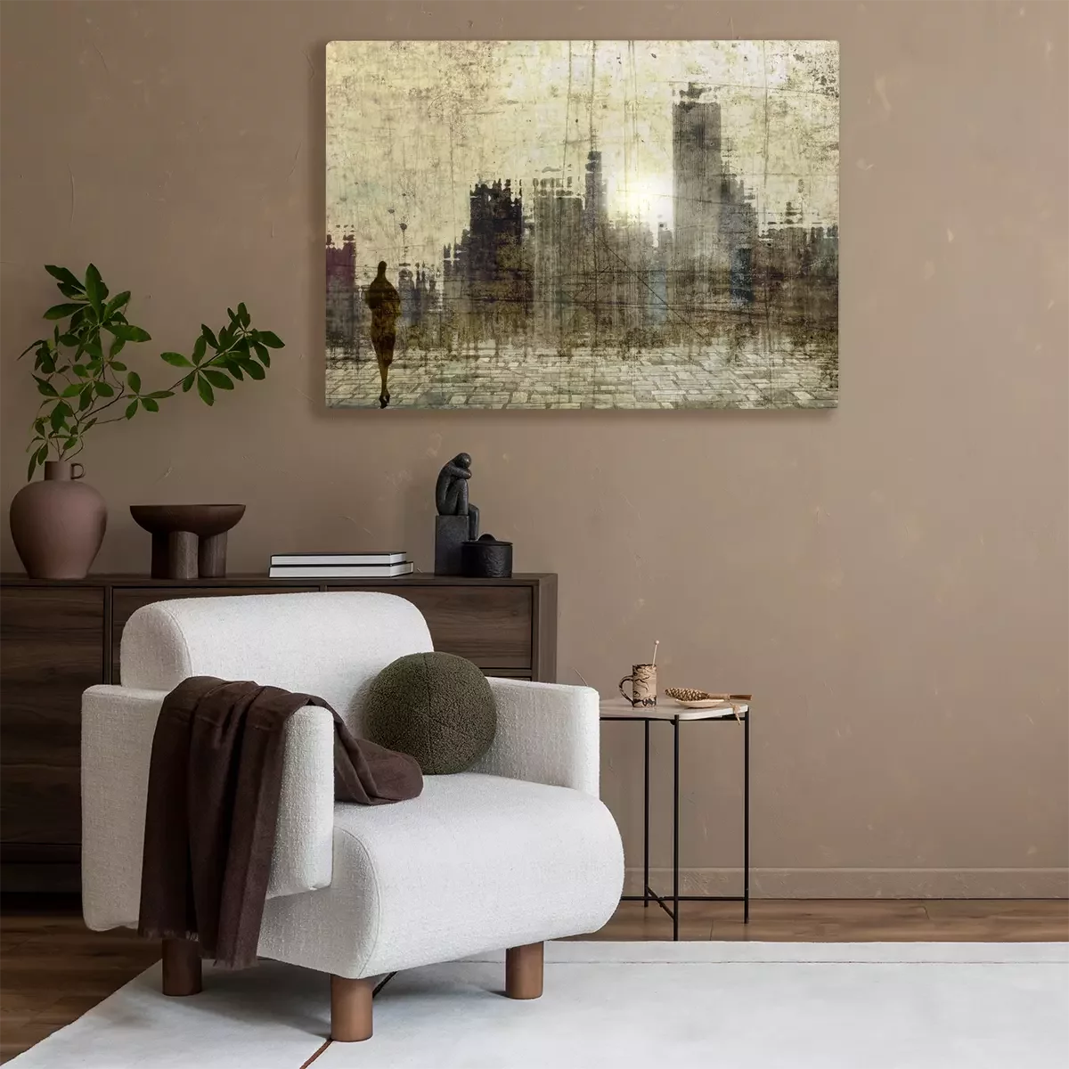 Tableau : Toits de la ville ancienne avec petite figure féminine