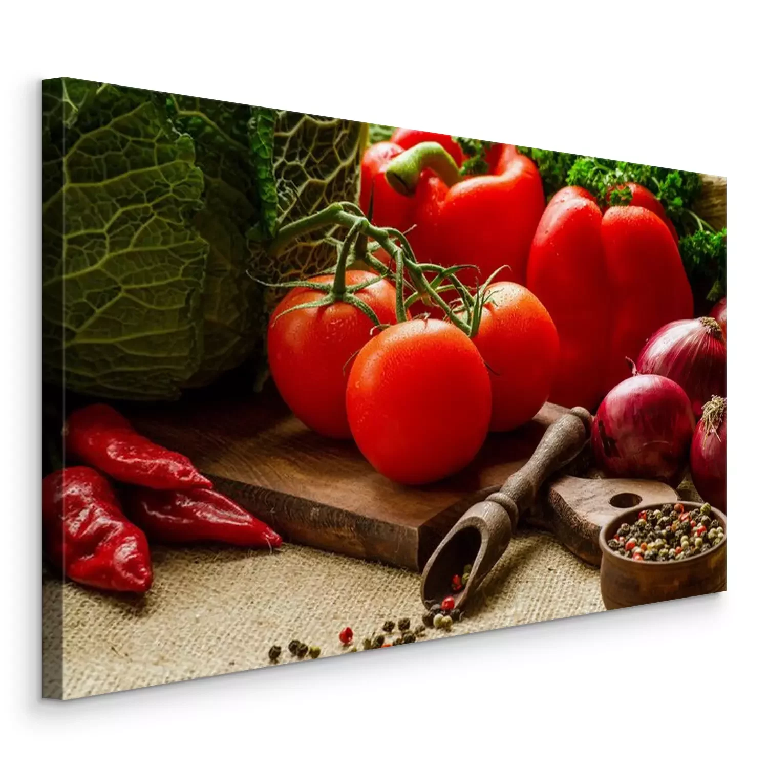 Tableau : Tomates, poivrons, choux, oignons, persil et épices sur le ki