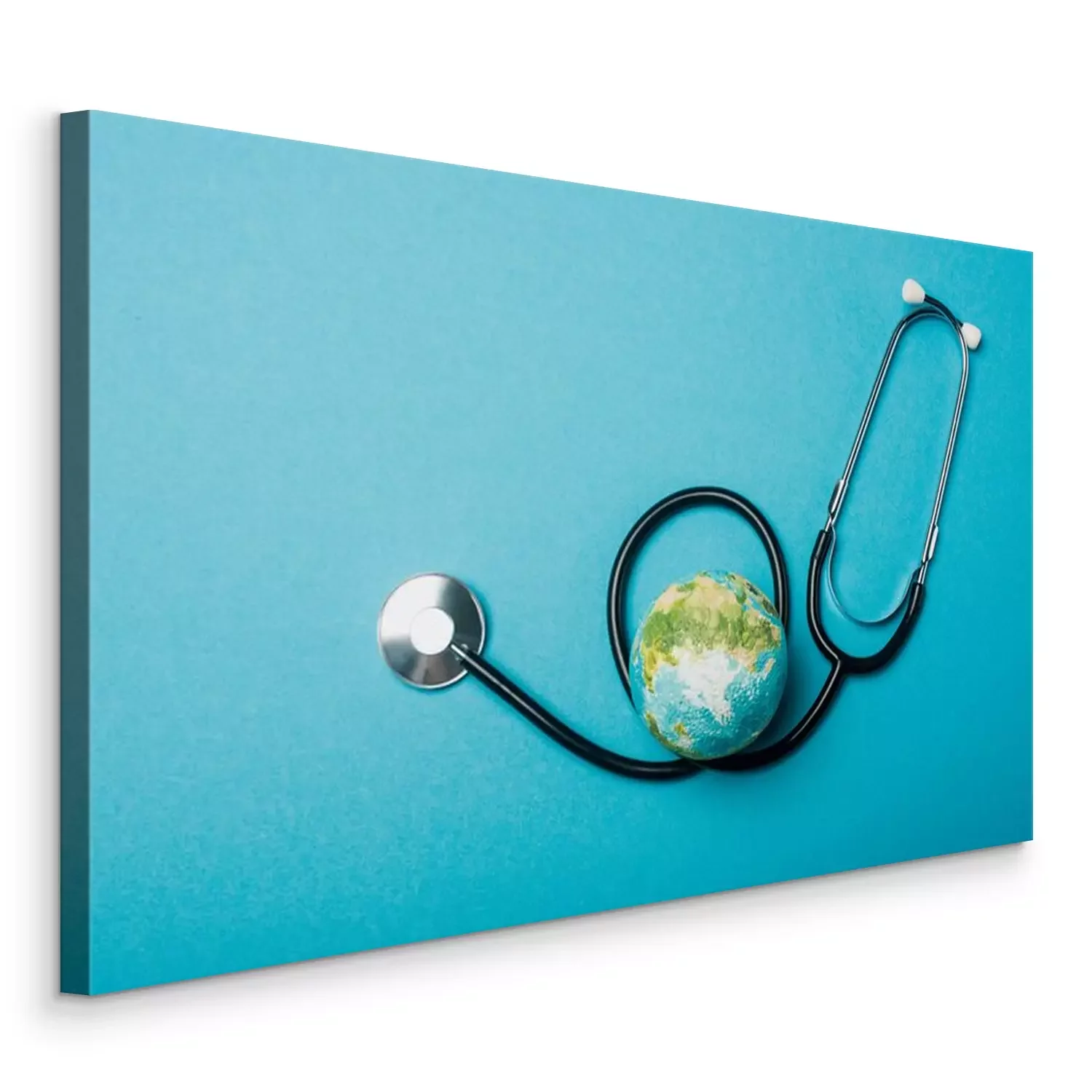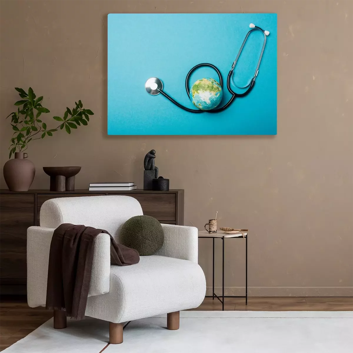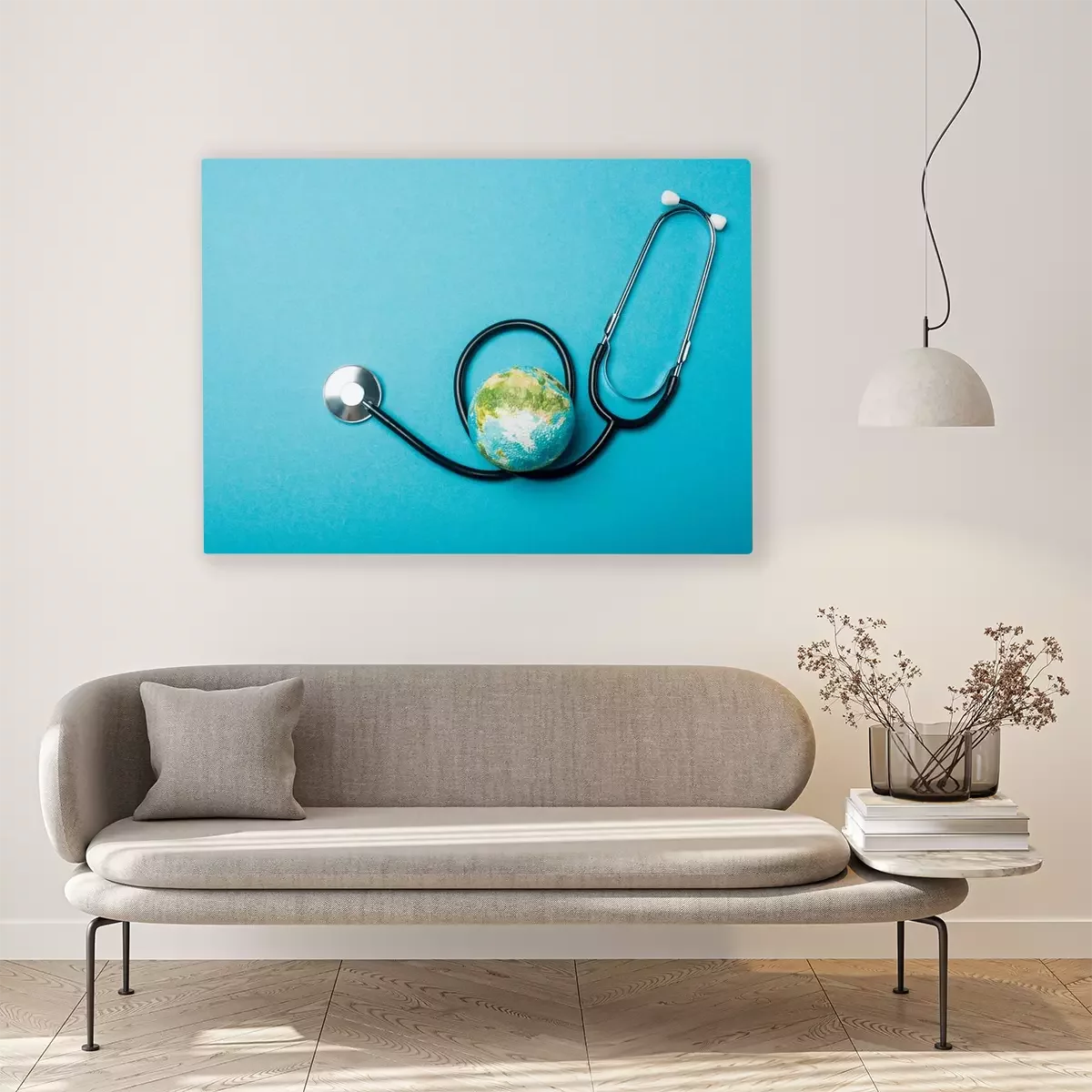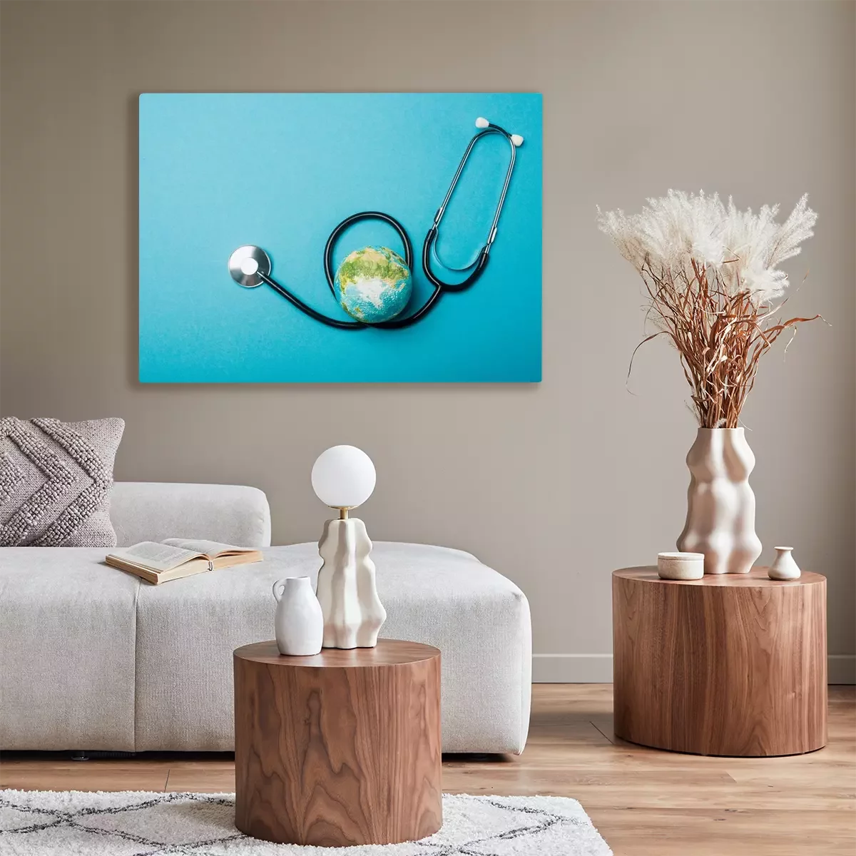 Tableau : Top view of globe and stethoscope on blue background, world health day concept