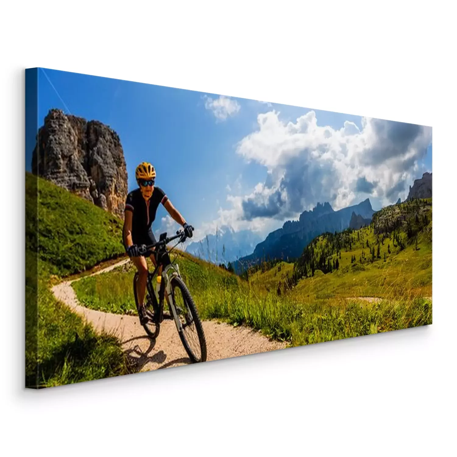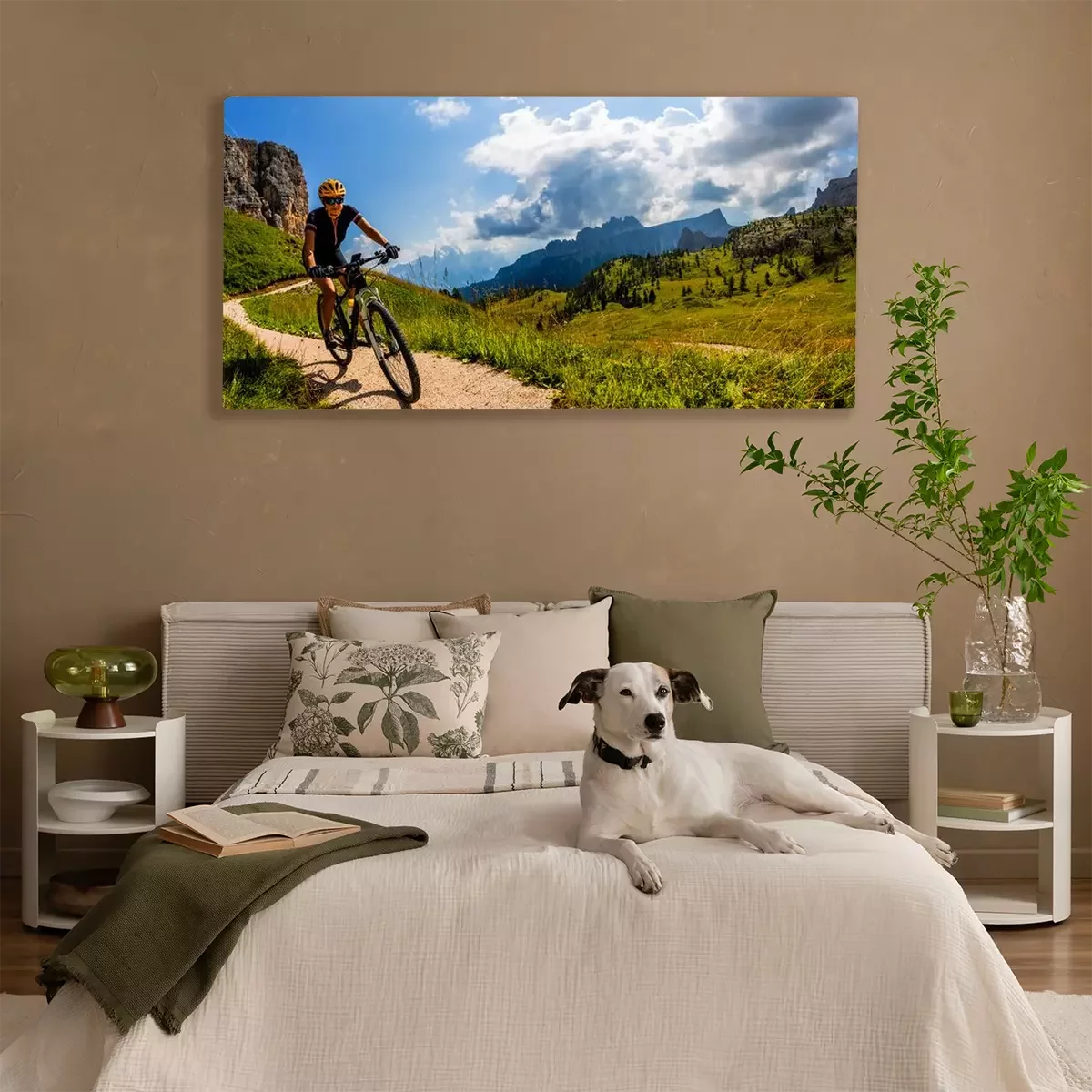 Tableau  Tourist cycling in Cortina d'Ampezzo, stunning Cinque Torri and Tofana in background. Man riding MTB enduro flow trail. South Tyrol province of Italy, Dolomites.