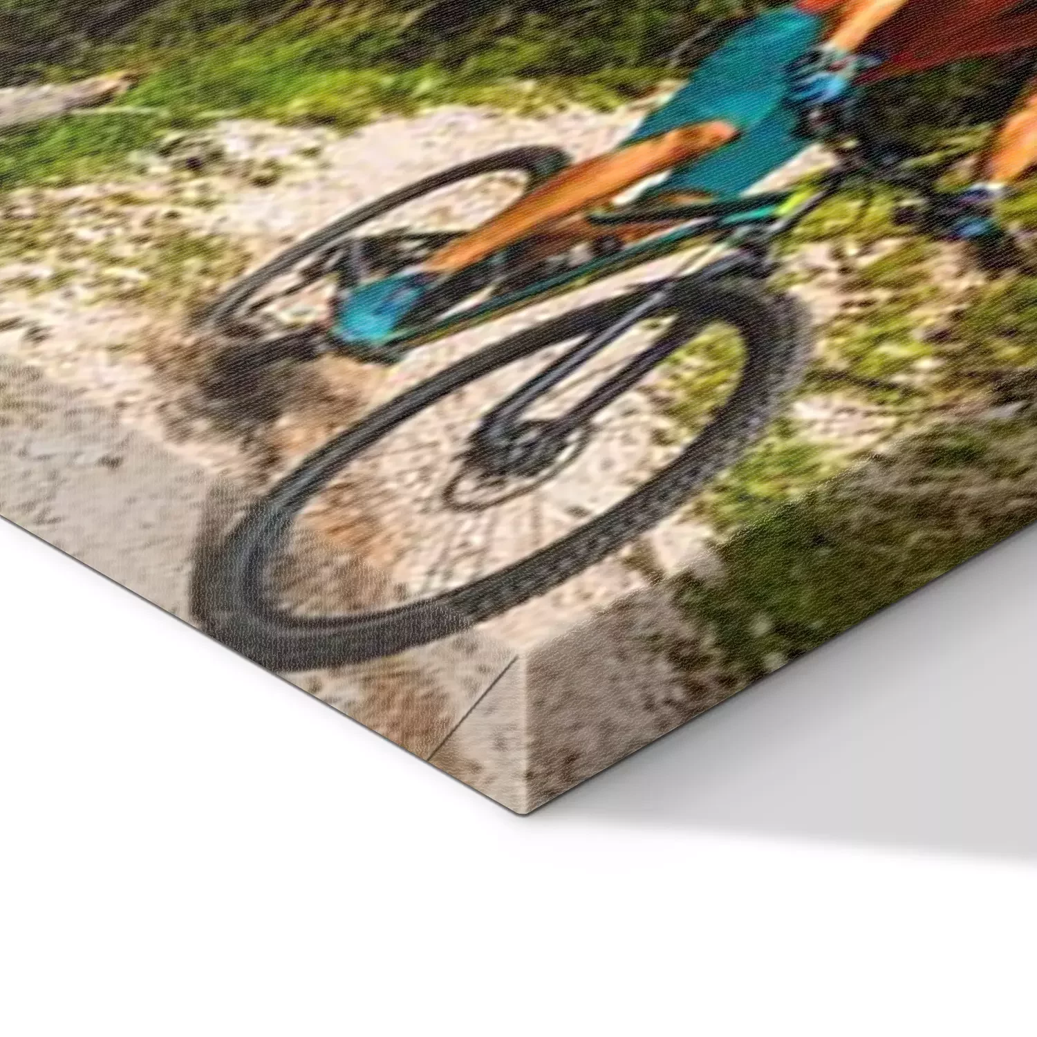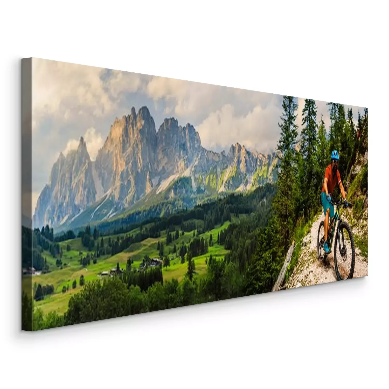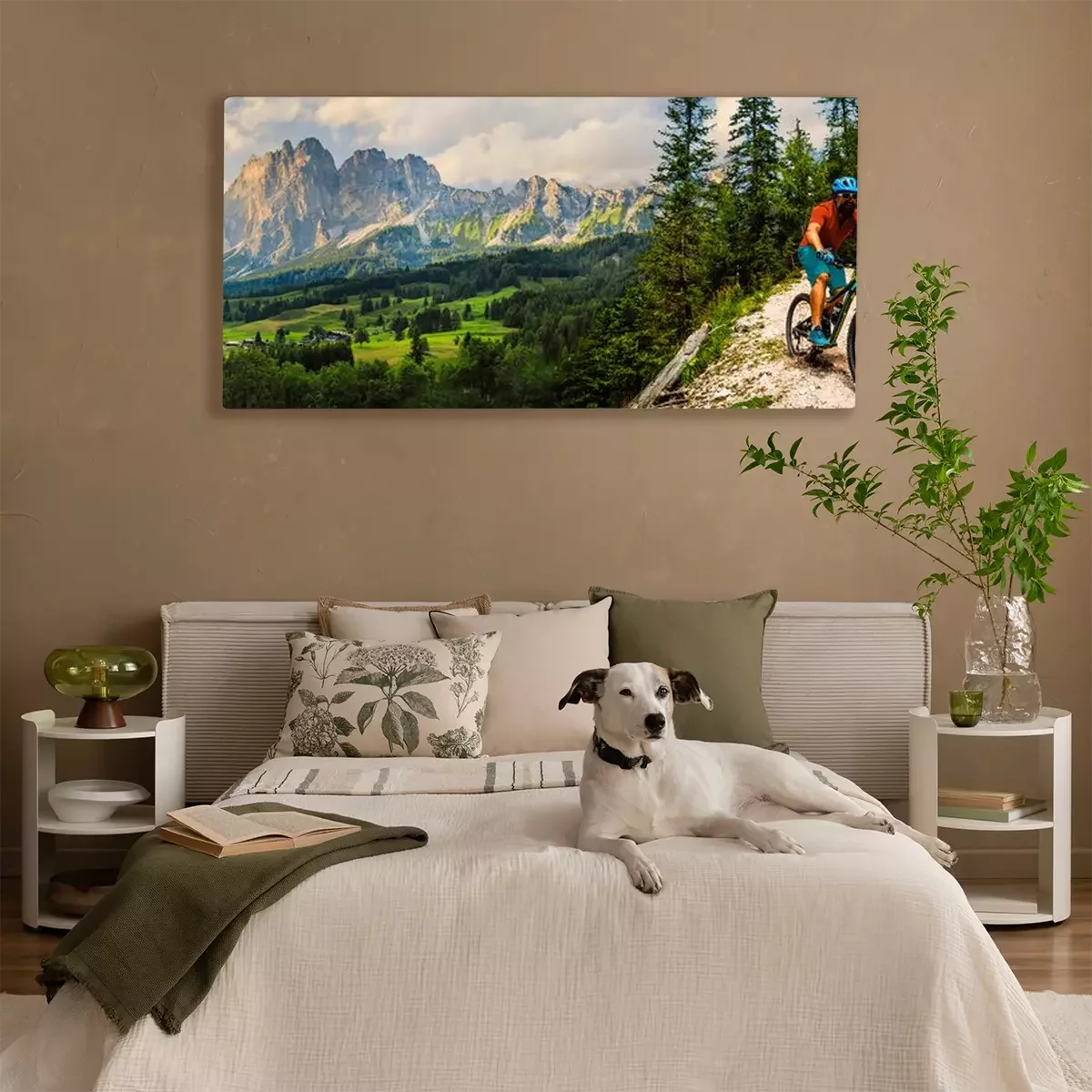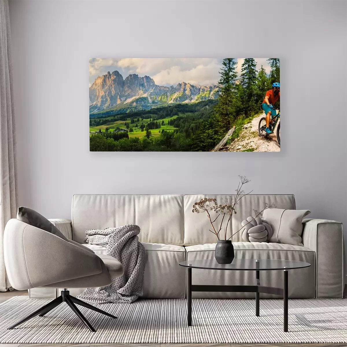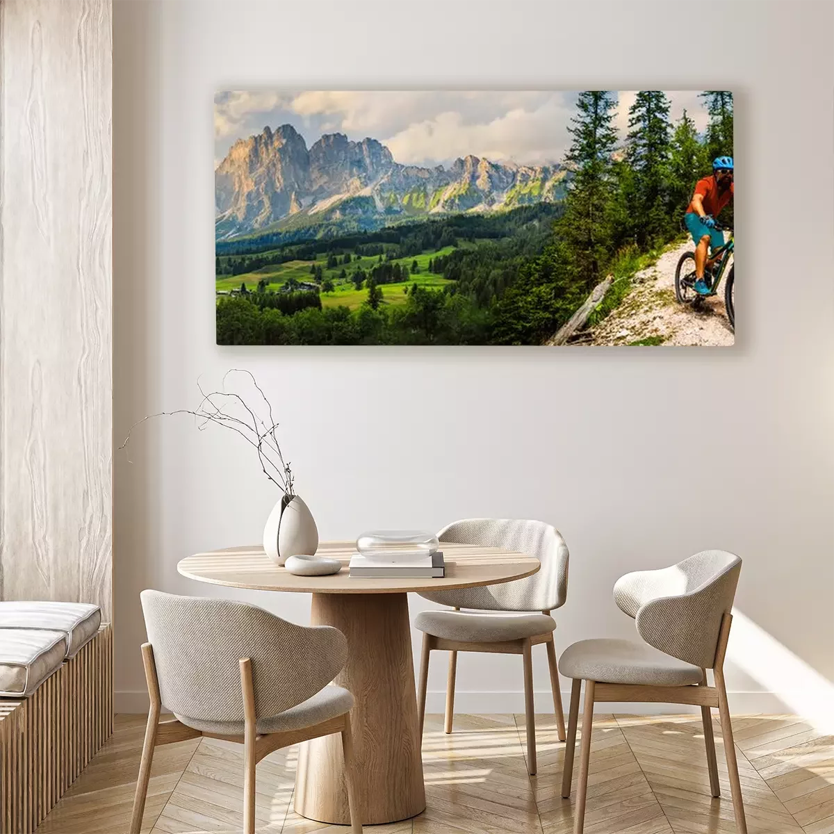 Tableau  Tourist cycling in Cortina d'Ampezzo, stunning rocky mountains on the background. Man riding MTB enduro flow trail. South Tyrol province of Italy, Dolomites.