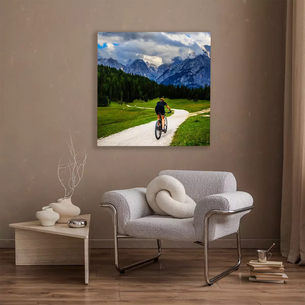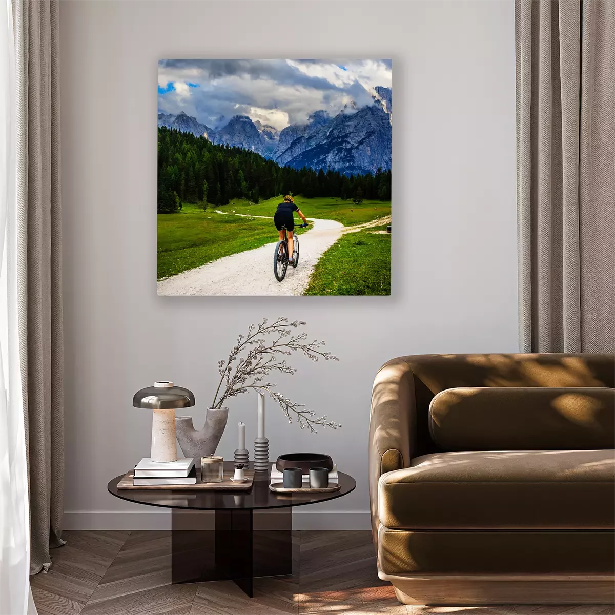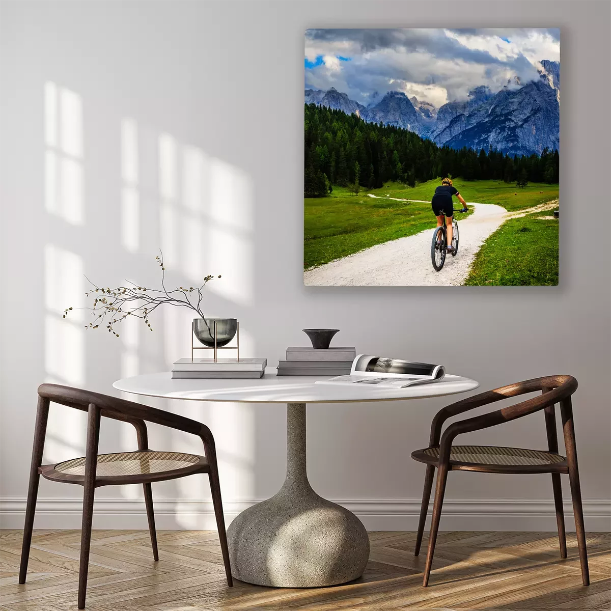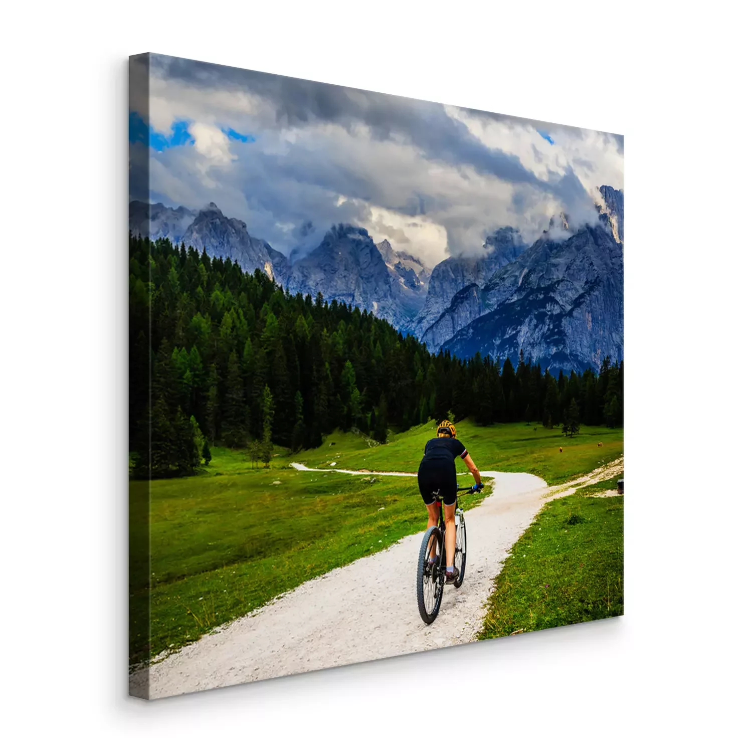 Tableau  Tourist cycling in Cortina d'Ampezzo, stunning rocky mountains on the background. Woman riding MTB enduro flow trail. South Tyrol province of Italy, Dolomites.