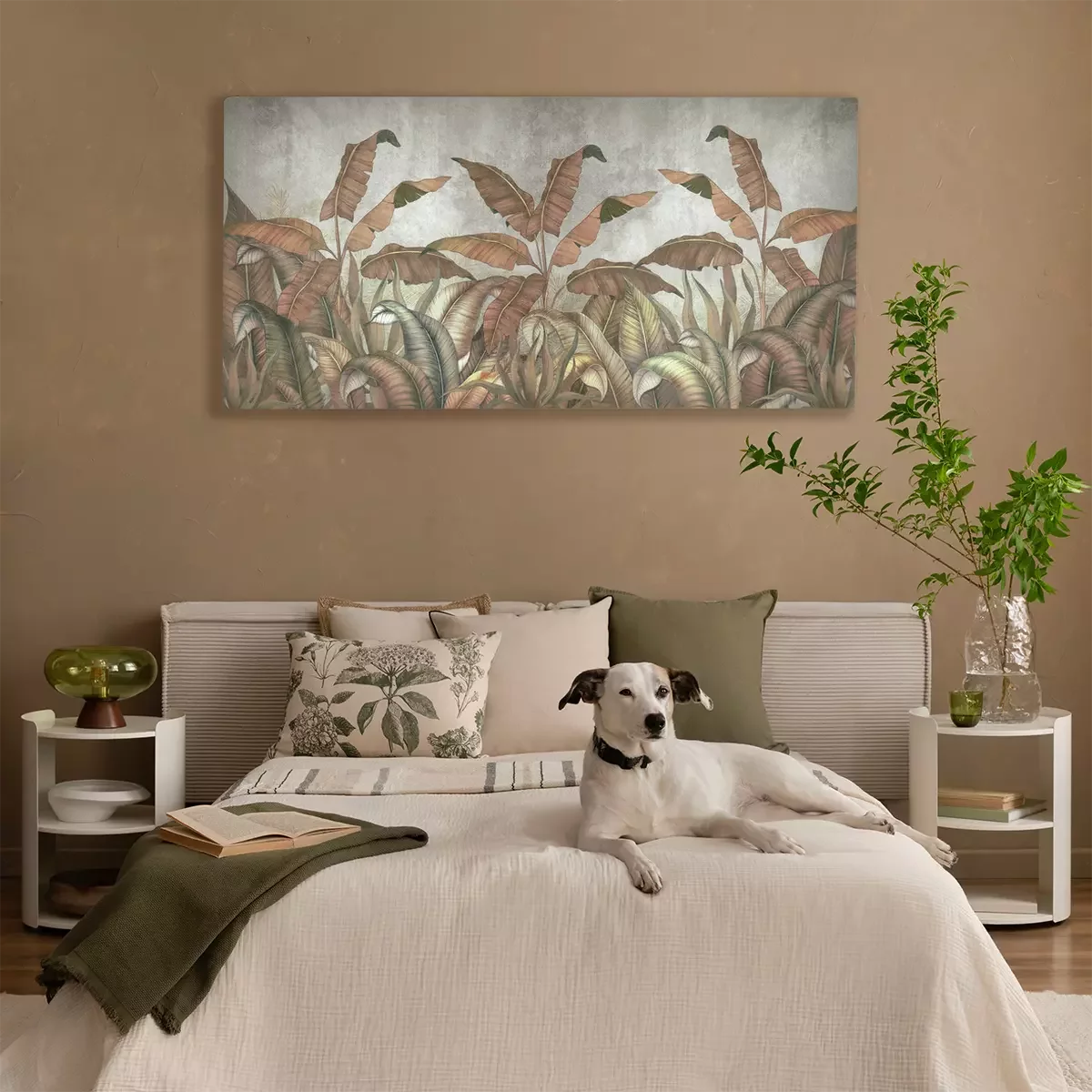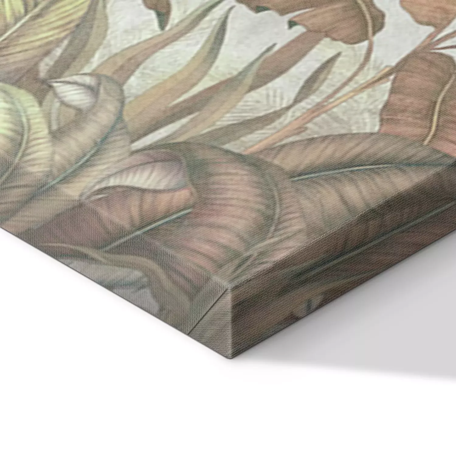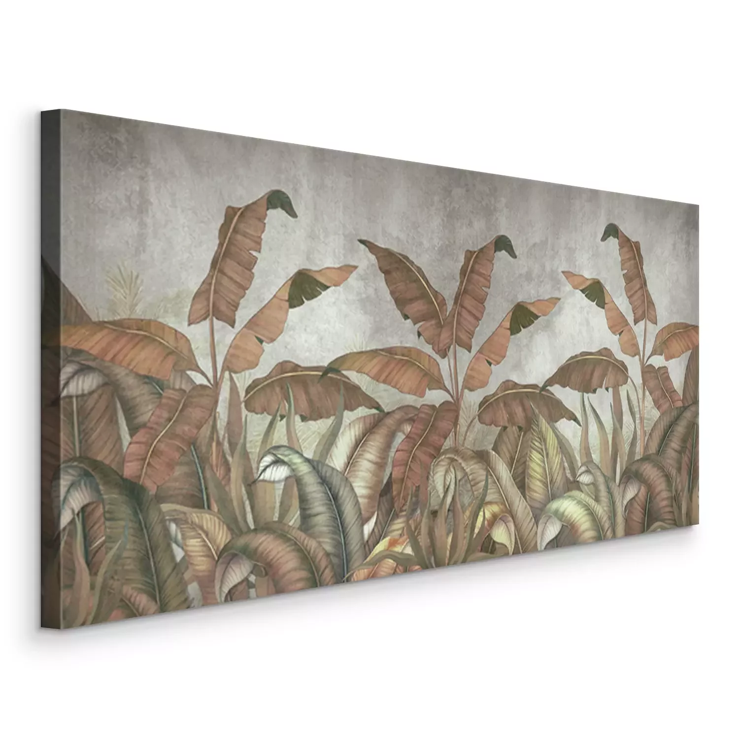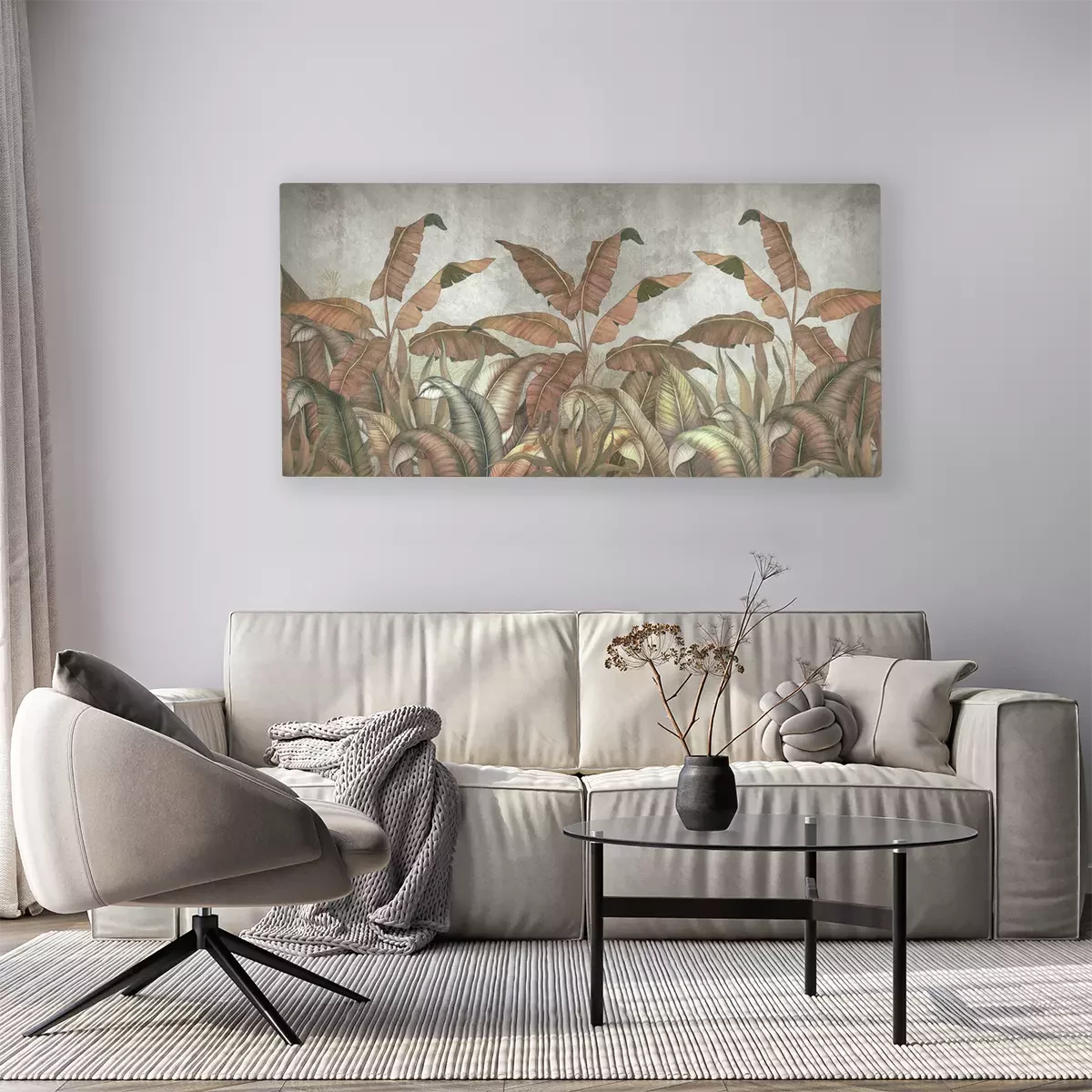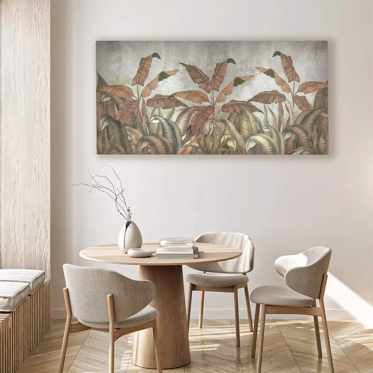 Tableau  Tropical leaves on a gray background. Photo wallpaper with leaves. Fresco for the interior. Wall decor in grunge style. Painted leaves. Photo wallpapers 3d.