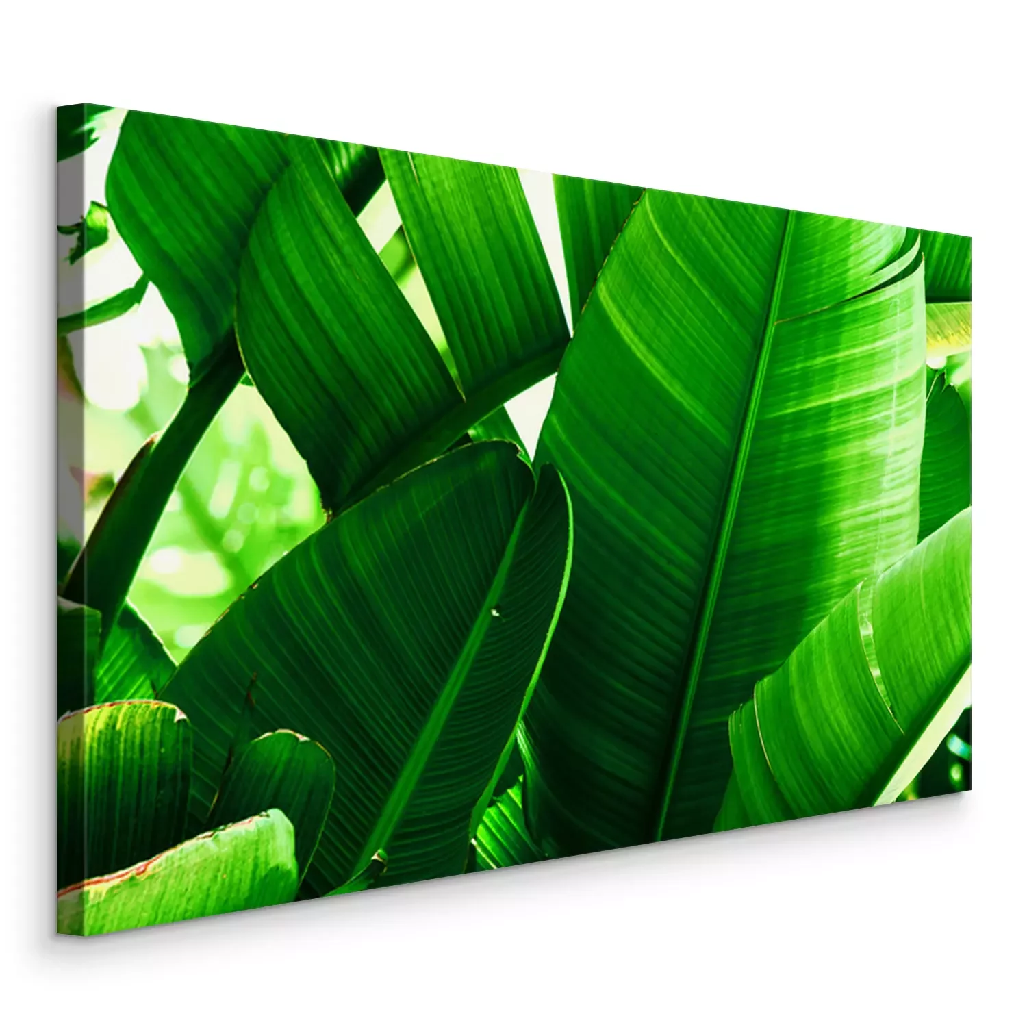 Tableau  Tropical nature greenery background. Thicket of palm trees with big leaves. Saturated vibrant emerald green color. Beautiful botanical backdrop wallpaper pattern. Poster template with copy space