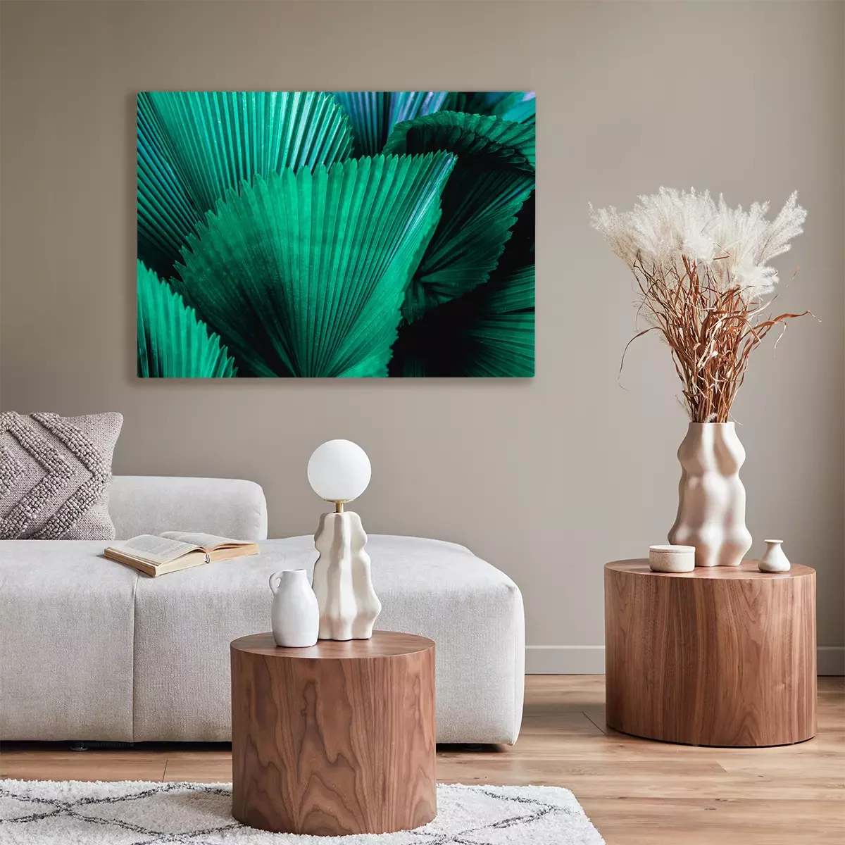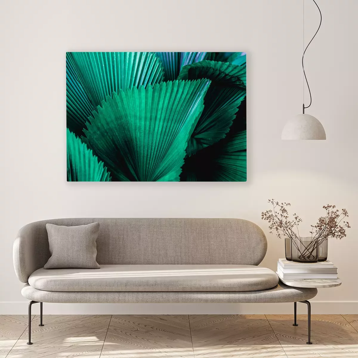 Tableau : Tropical palm leaf and shadow, abstract natural green background, dark blue tone