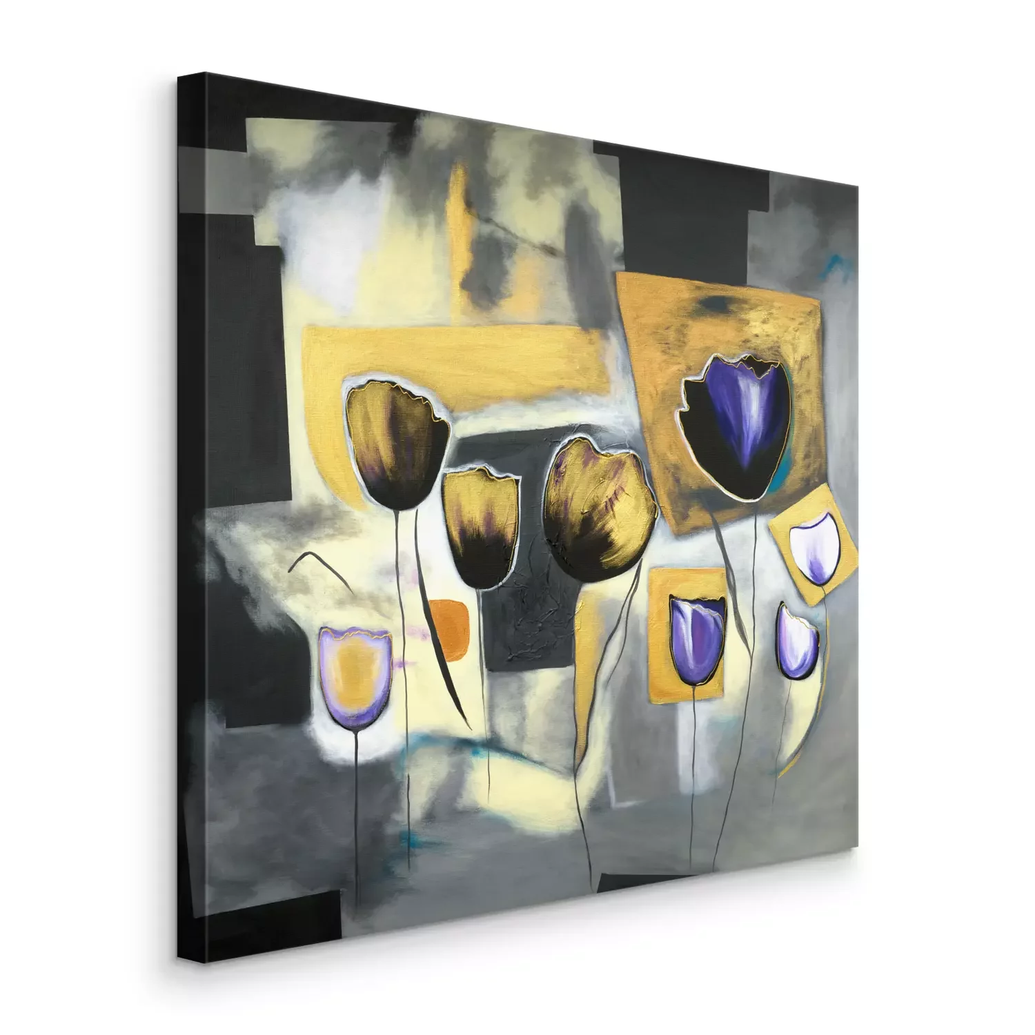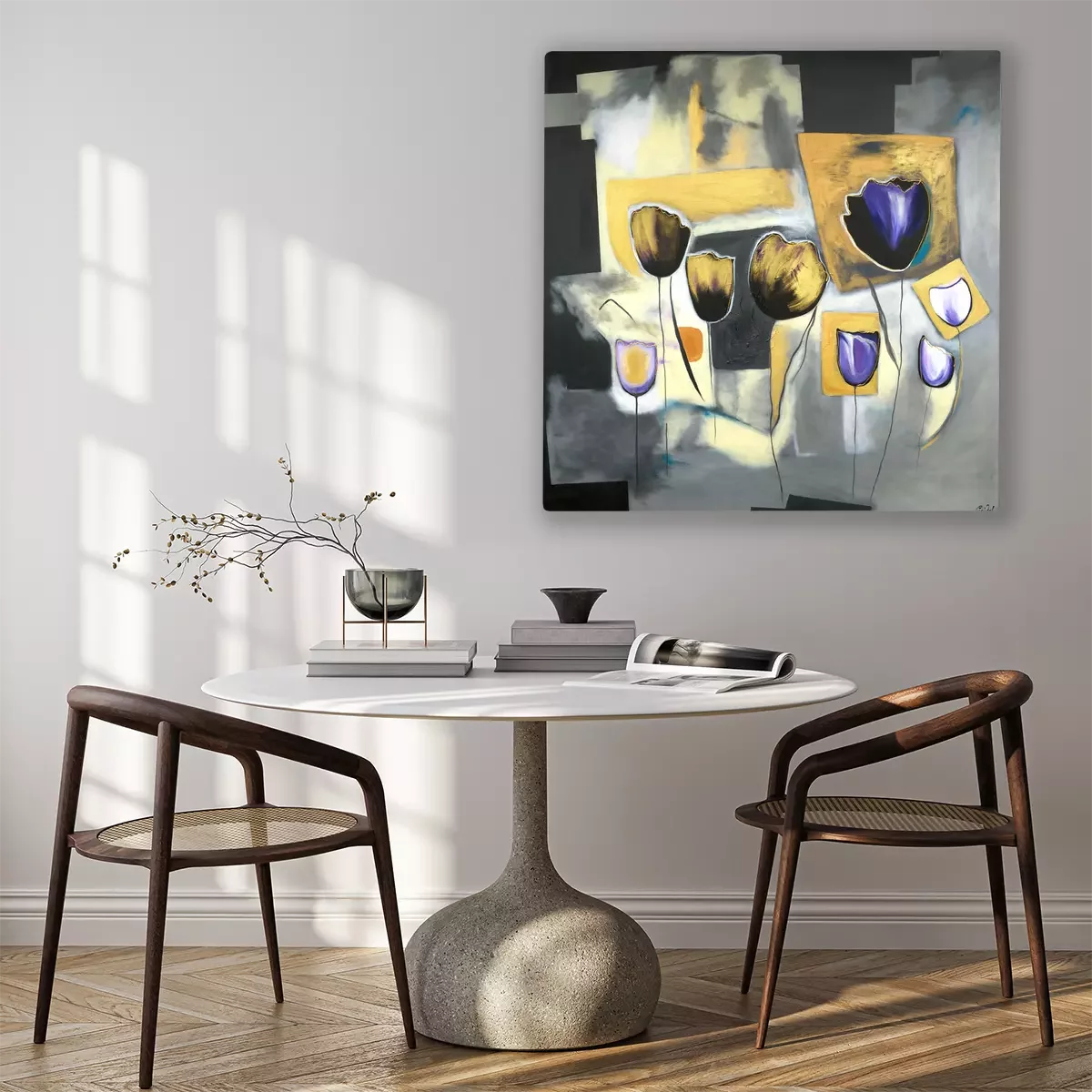 Tulipes abstraites sur un fond gris géométrique
