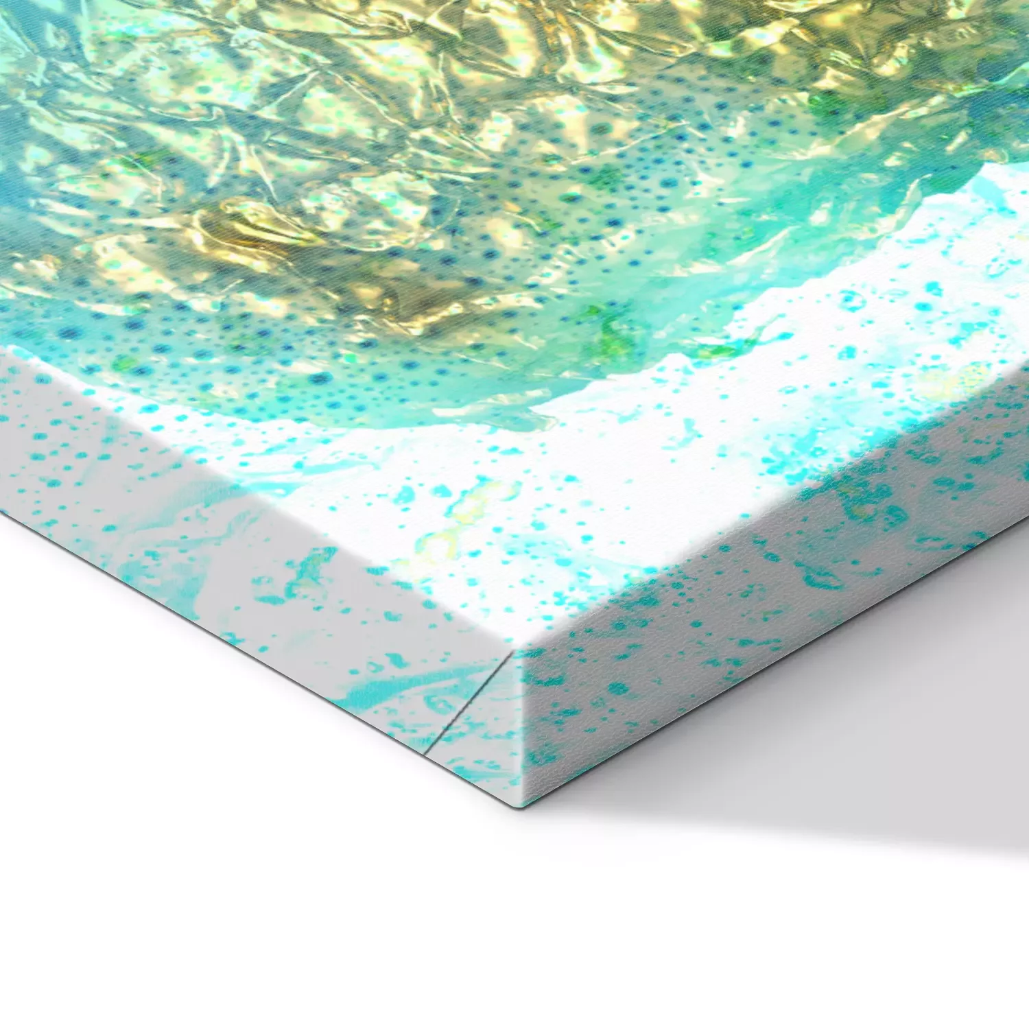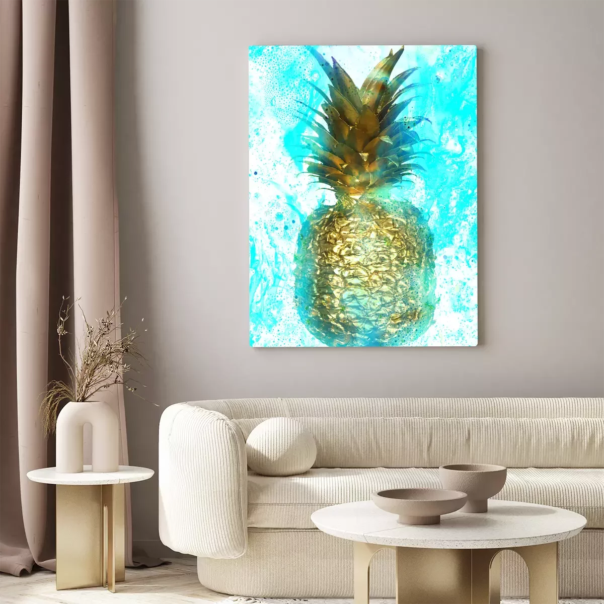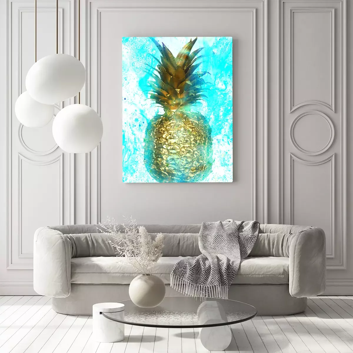 Un ananas doré sur un fond d'éclaboussures turquoise