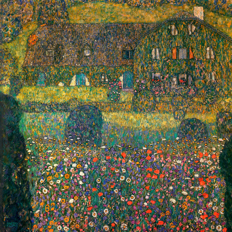 Tableau : Un chalet rustique surplombant les eaux calmes du lac Attersee