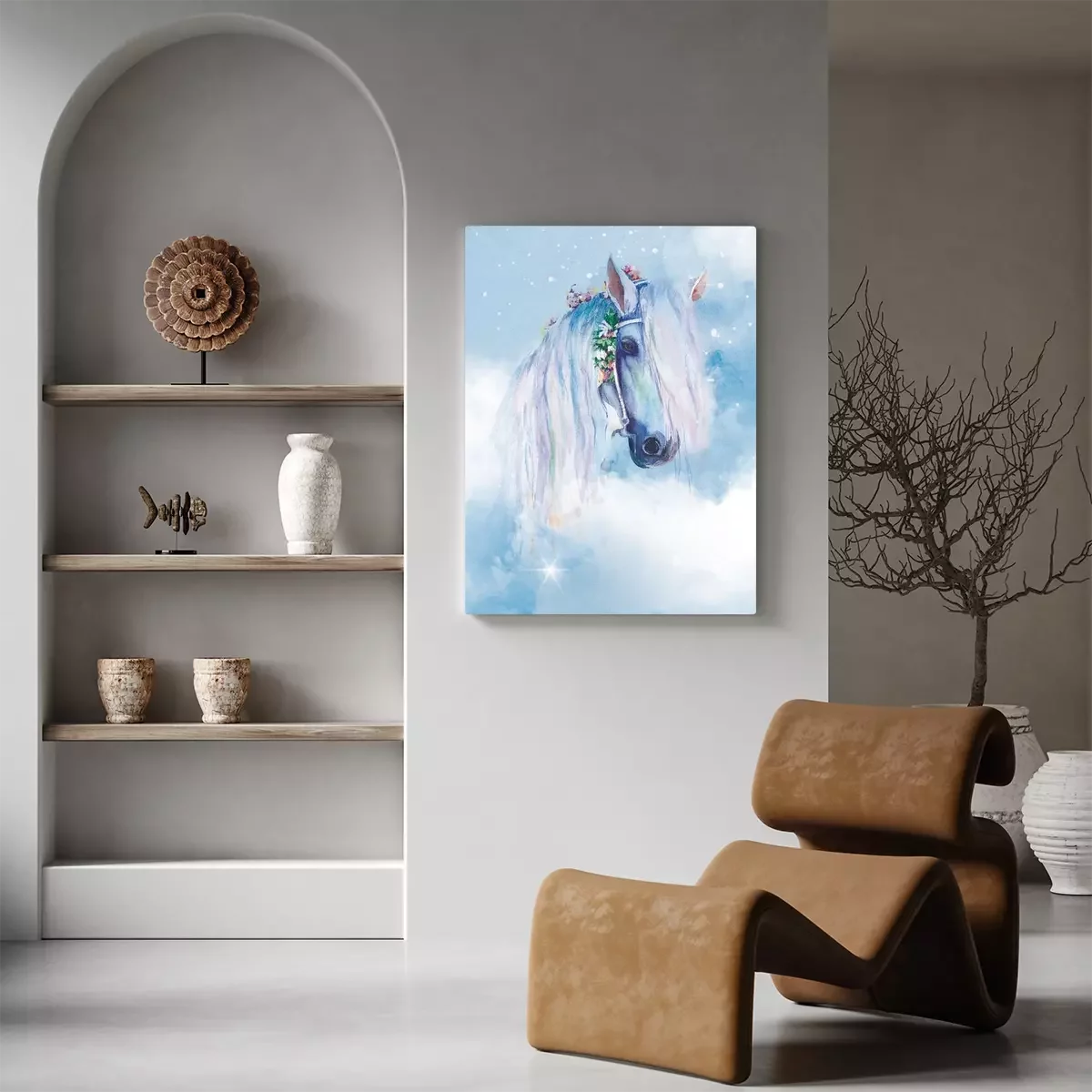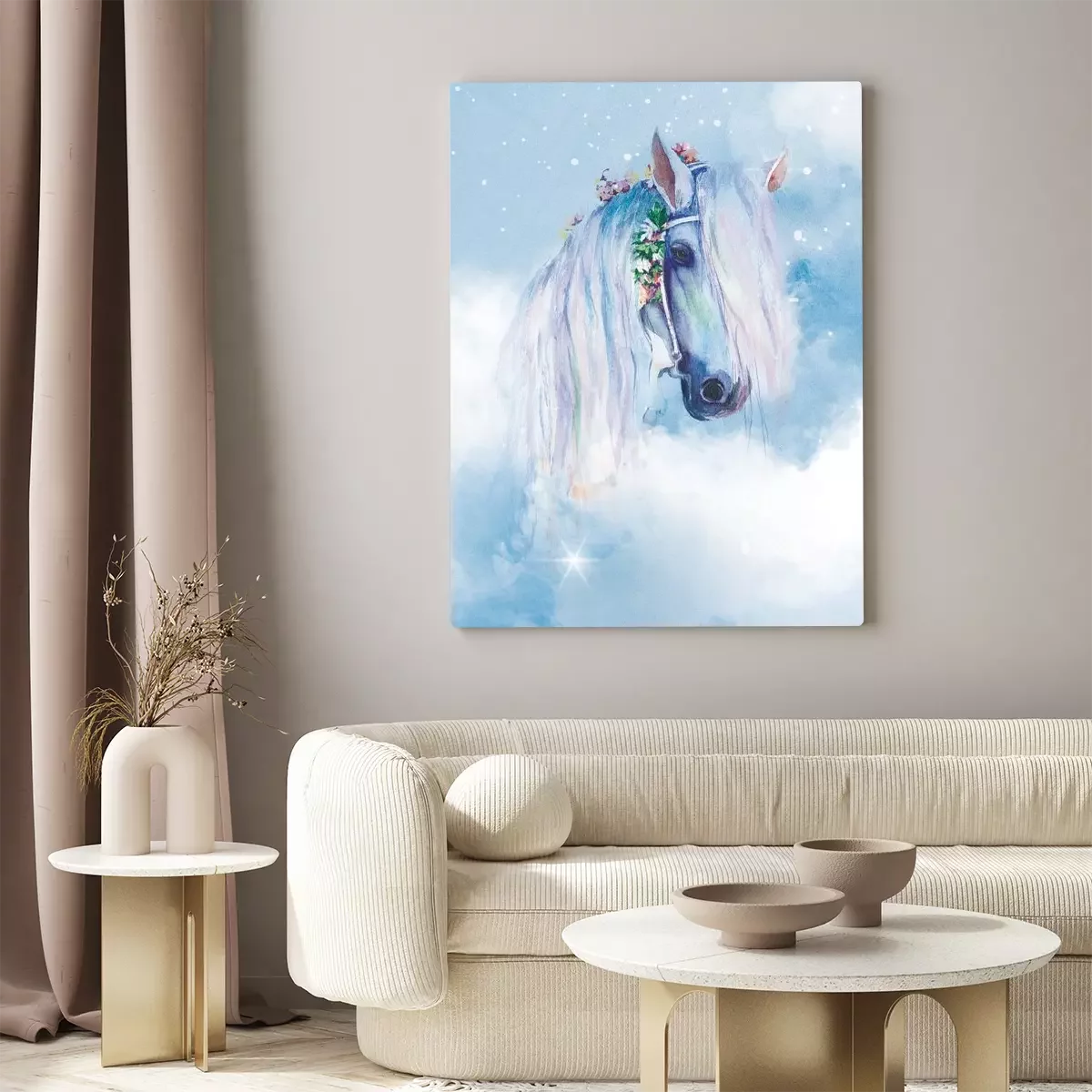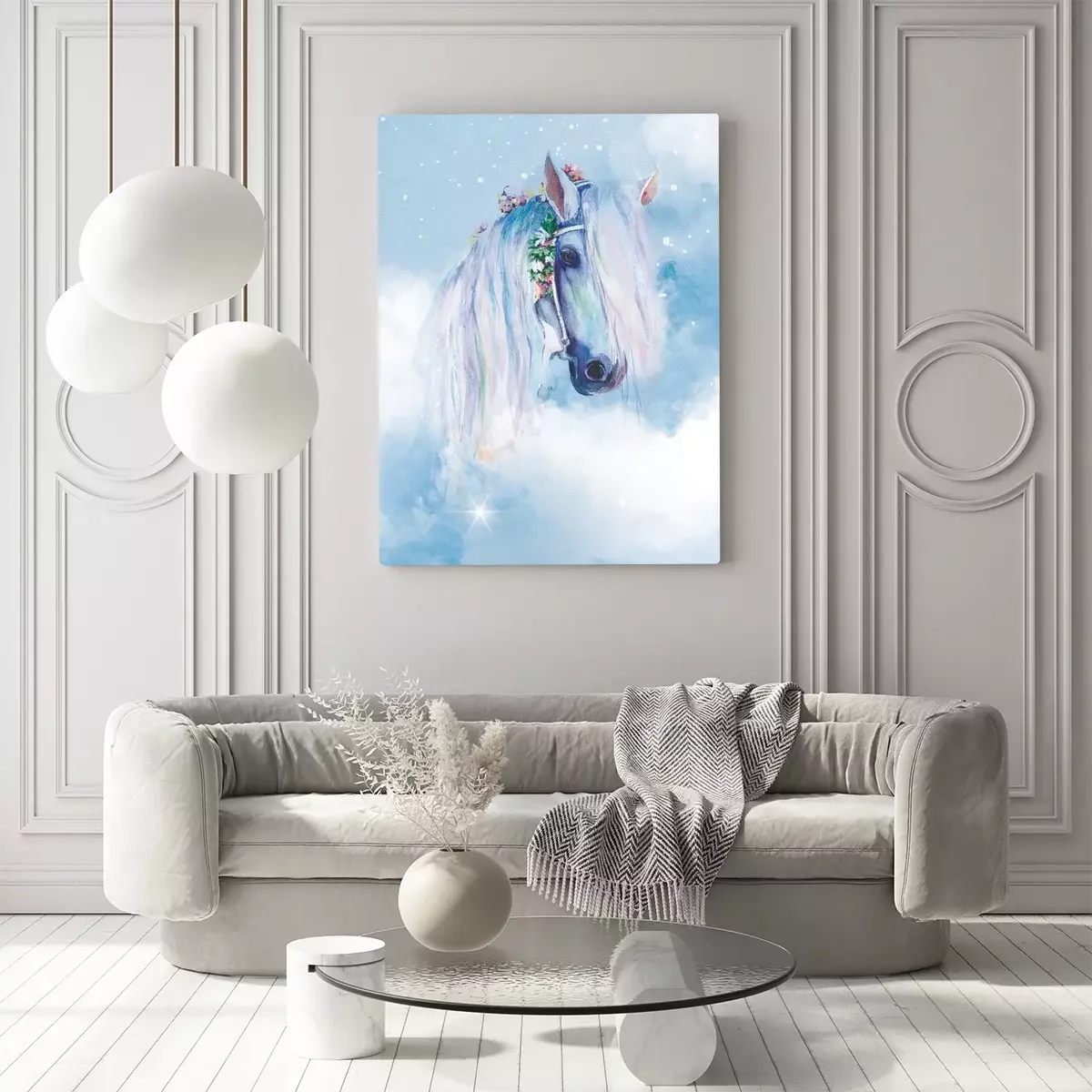 Un cheval blanc orné d'une couronne de fleurs se détachant sur un fond de nuages légers.