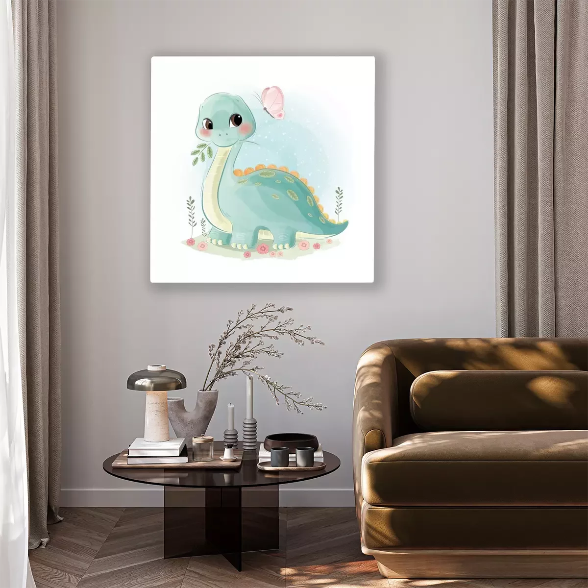 Tableau : Un dinosaure regardant un papillon