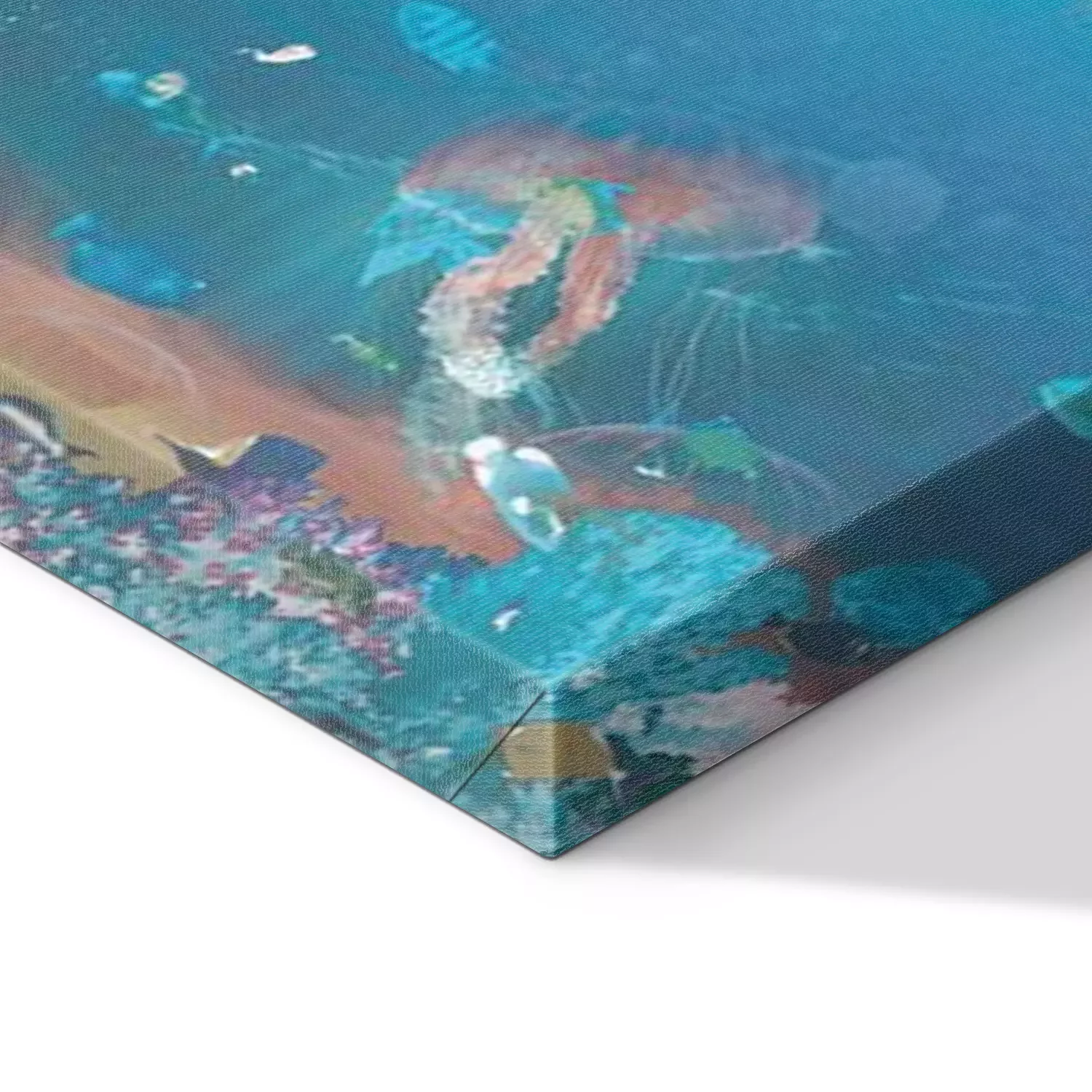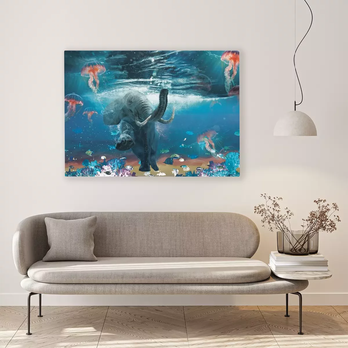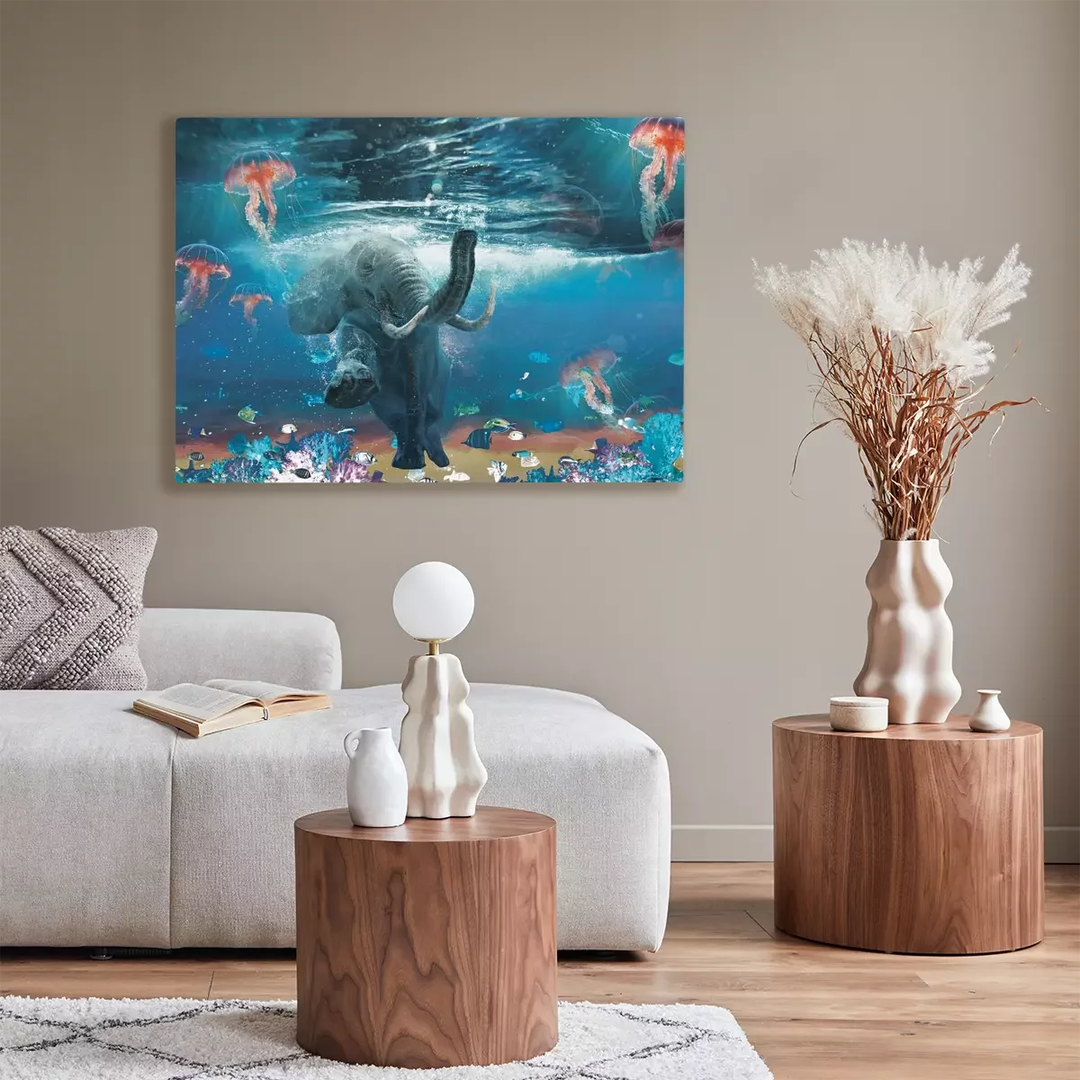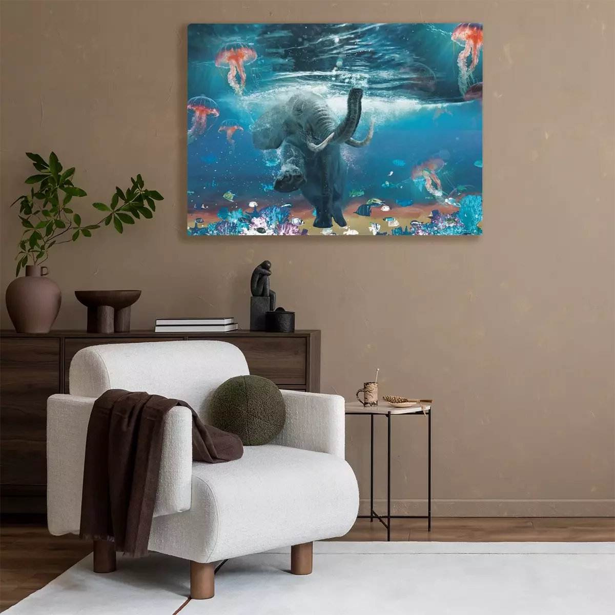 Un éléphant dans un océan tropical parmi des récifs colorés