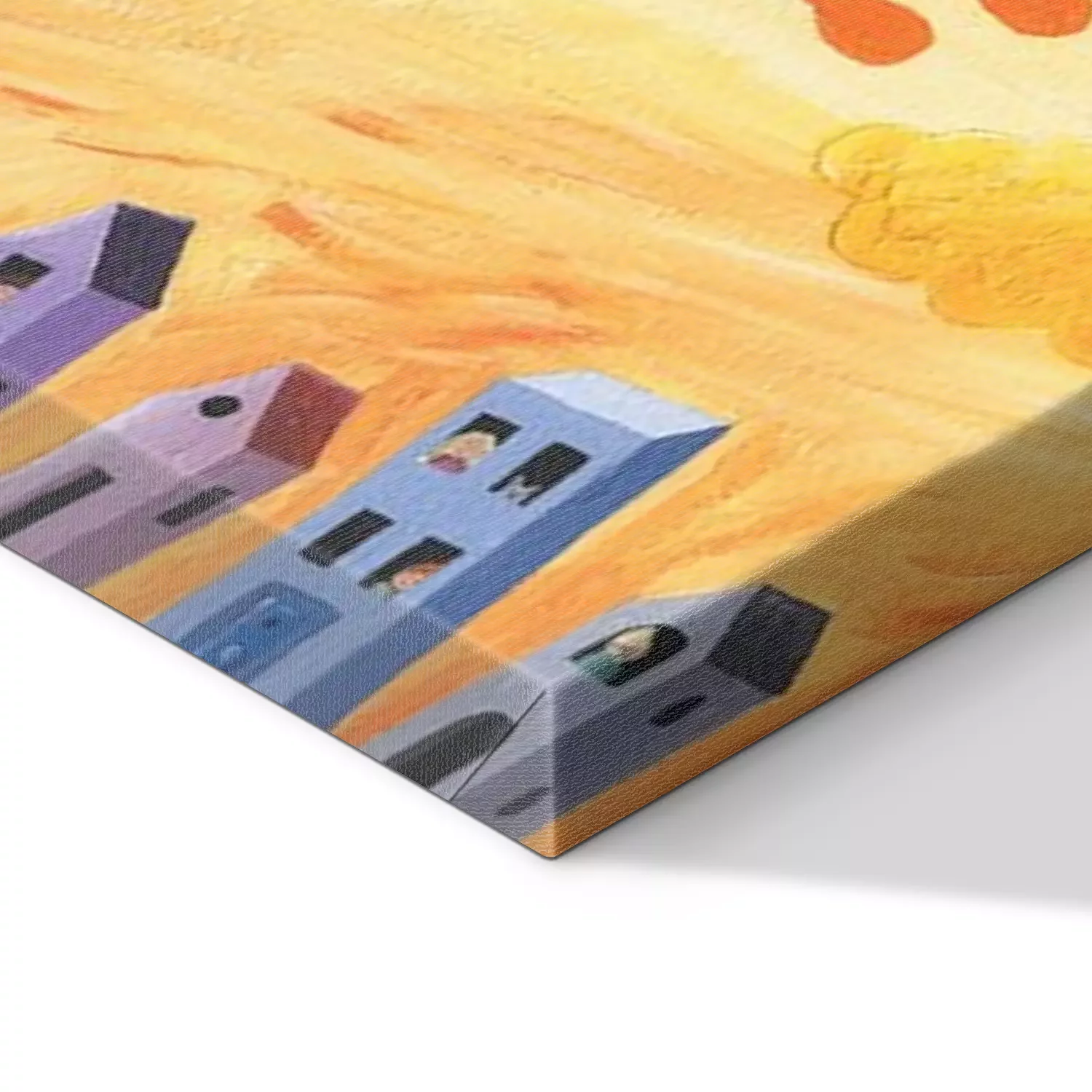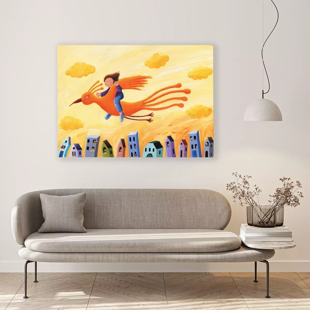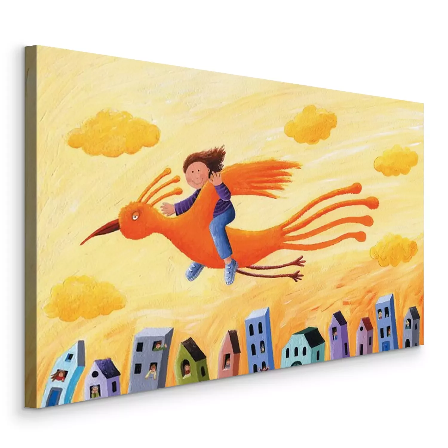 Tableau  Un garçon survolant un village sur un oiseau orange