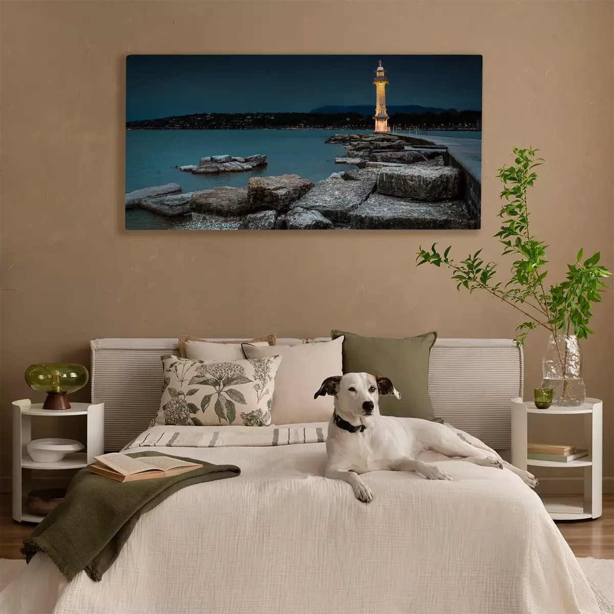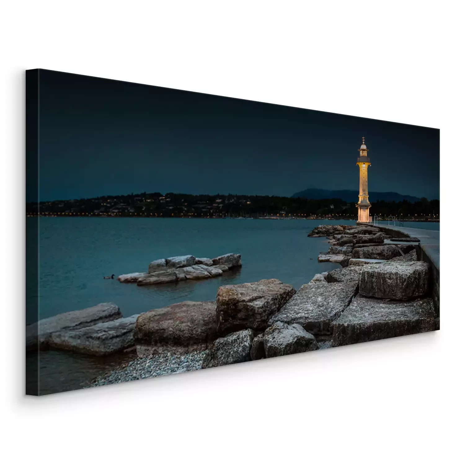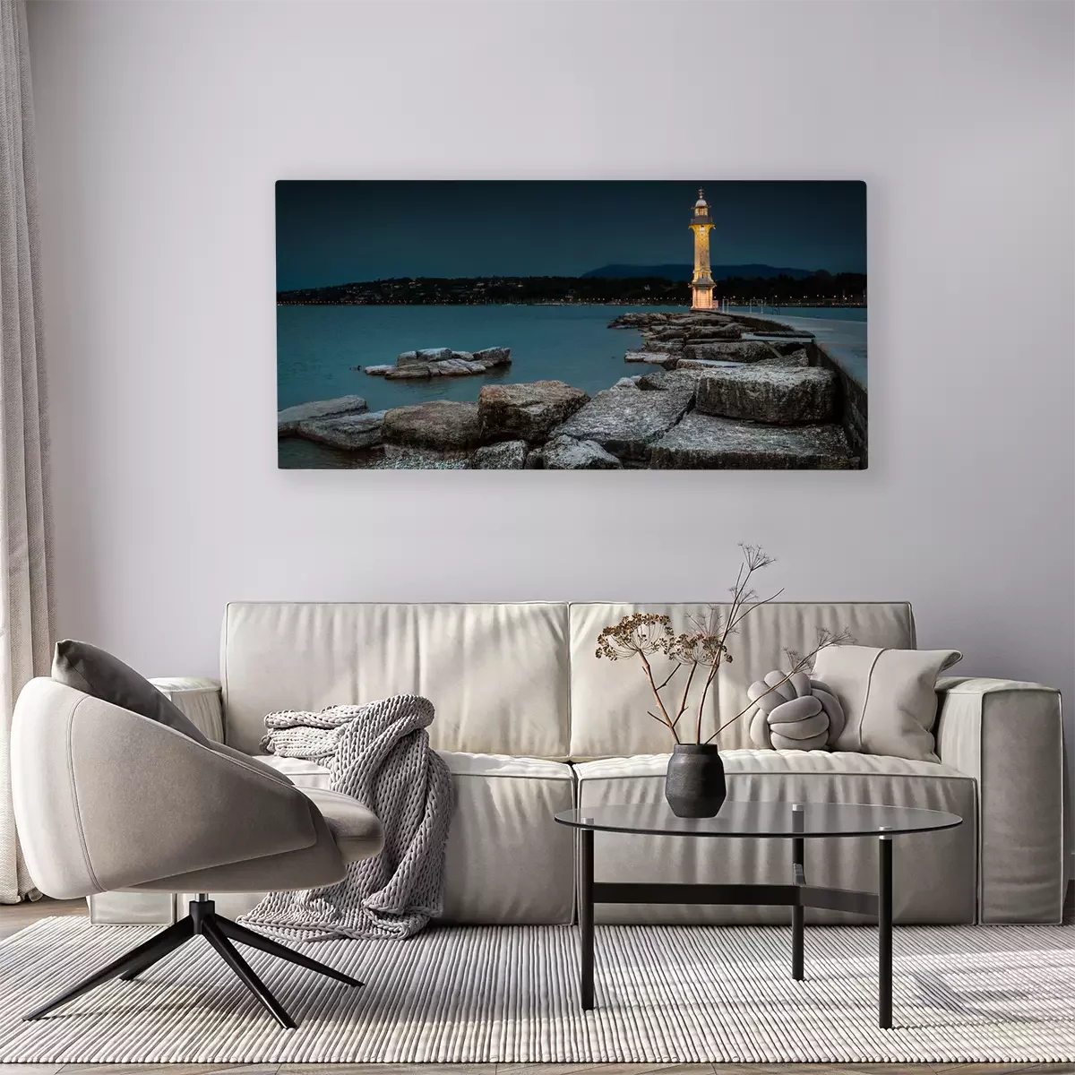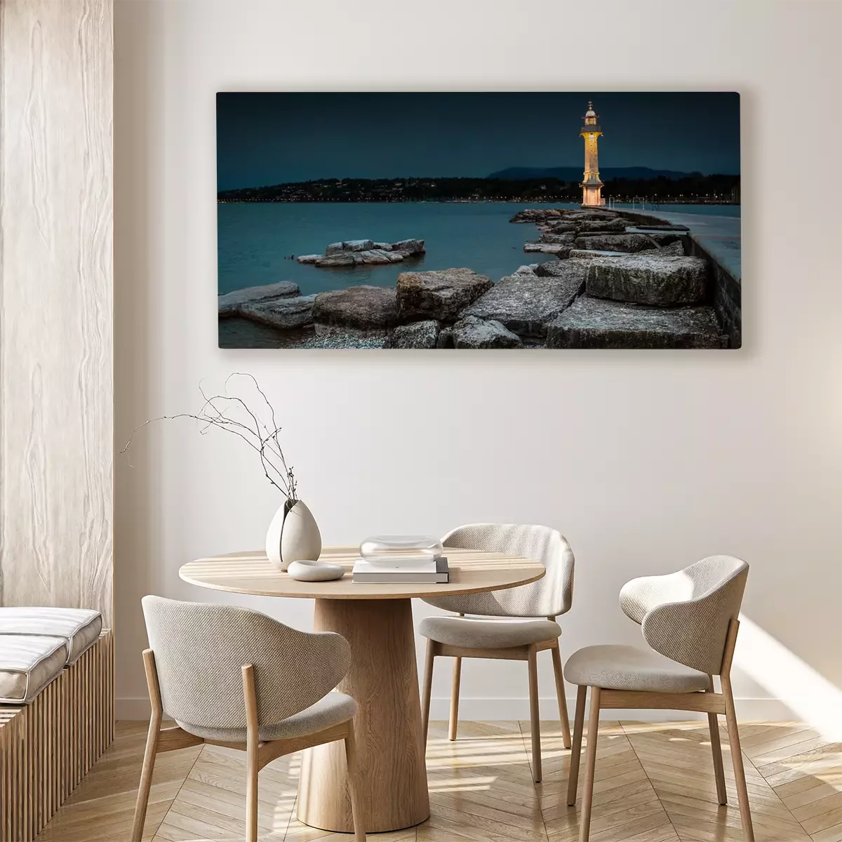 Tableau  Un grand angle d'un phare allumé au lac Léman, en Suisse, en début de soirée