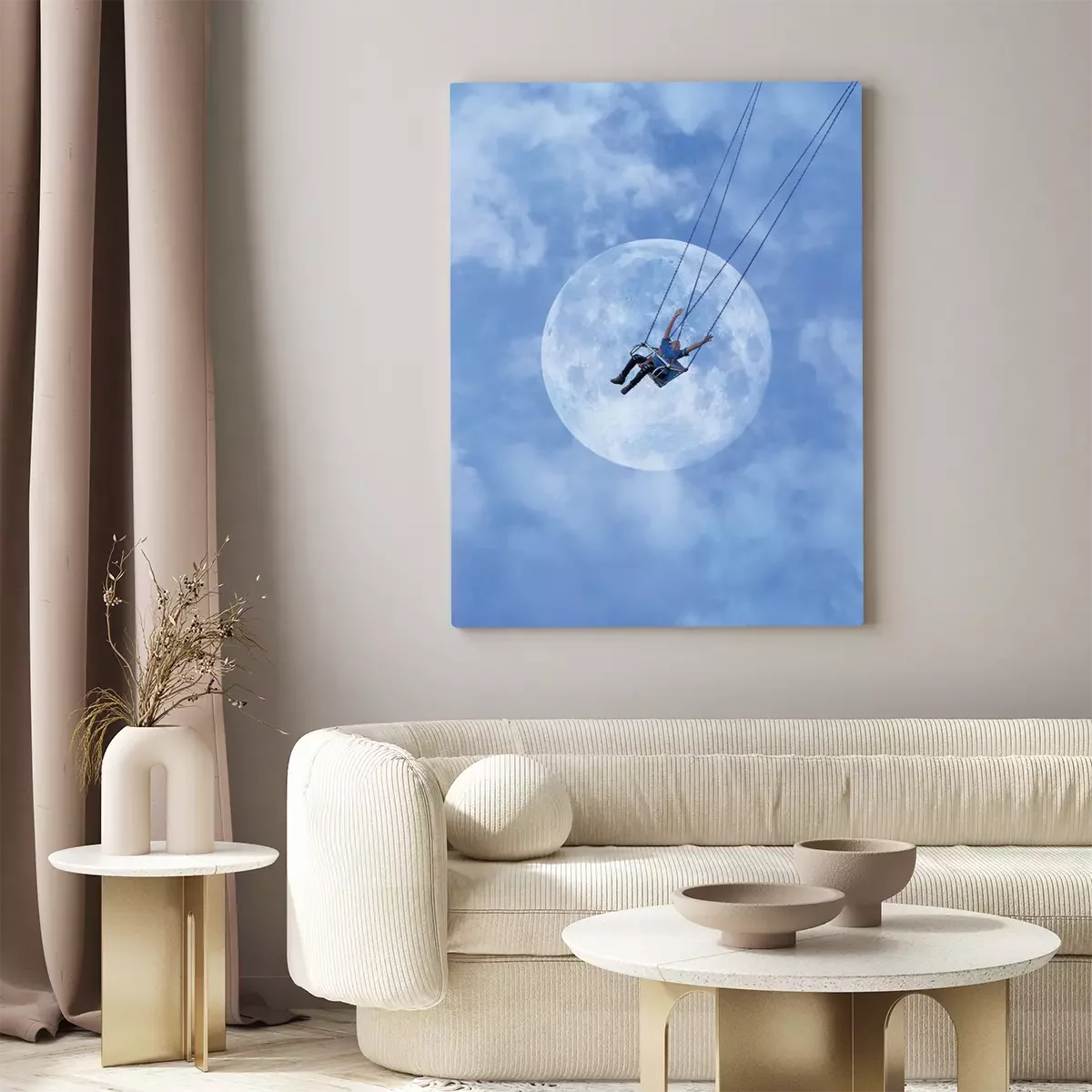 Un homme sur une balançoire devant un ciel bleu avec la lune
