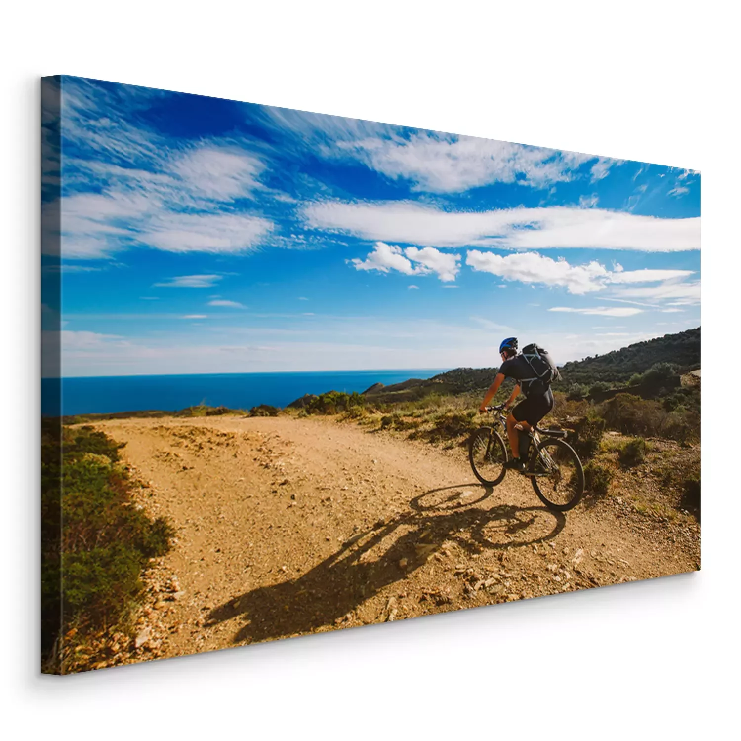 Tableau  un jeune mec monté sur un vélo de montagne sur une route cyclable en Espagne sur la route dans le contexte de la mer Méditerranée. Habillé dans un casque, un noir et un sac à dos noir