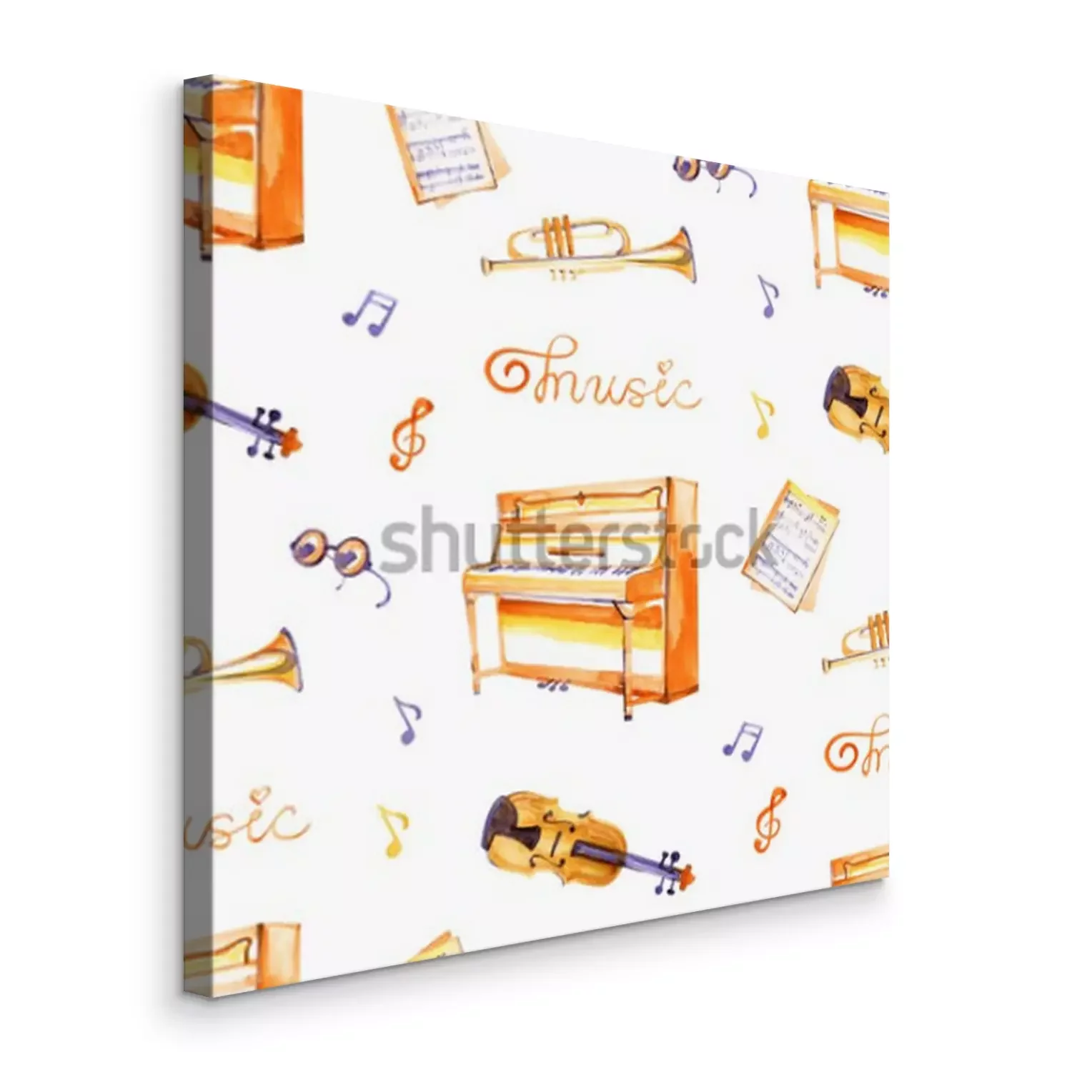 Tableau : Un modèle sans couture avec des instruments de musique dessinés à la main sur une texture de fond aquarelle.
