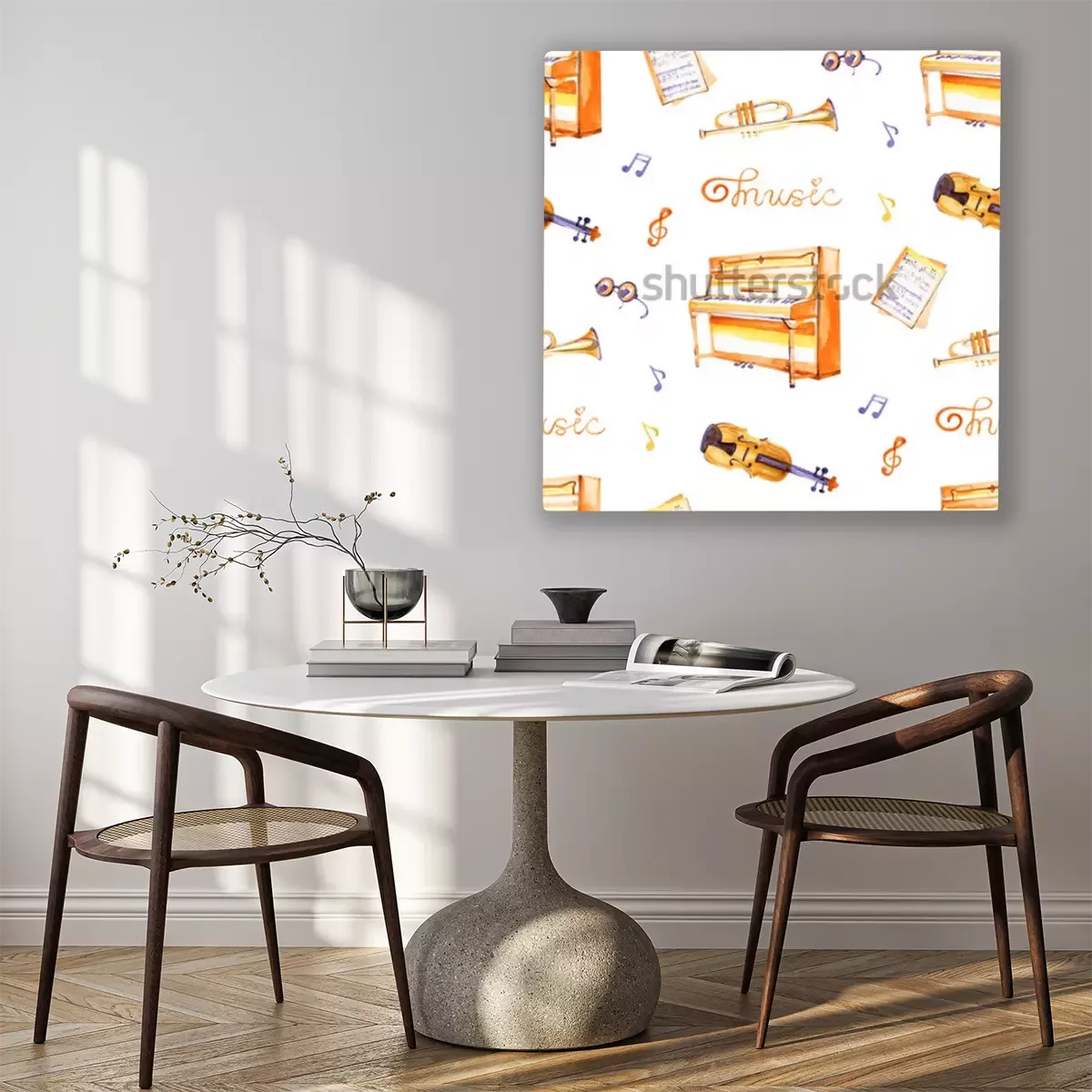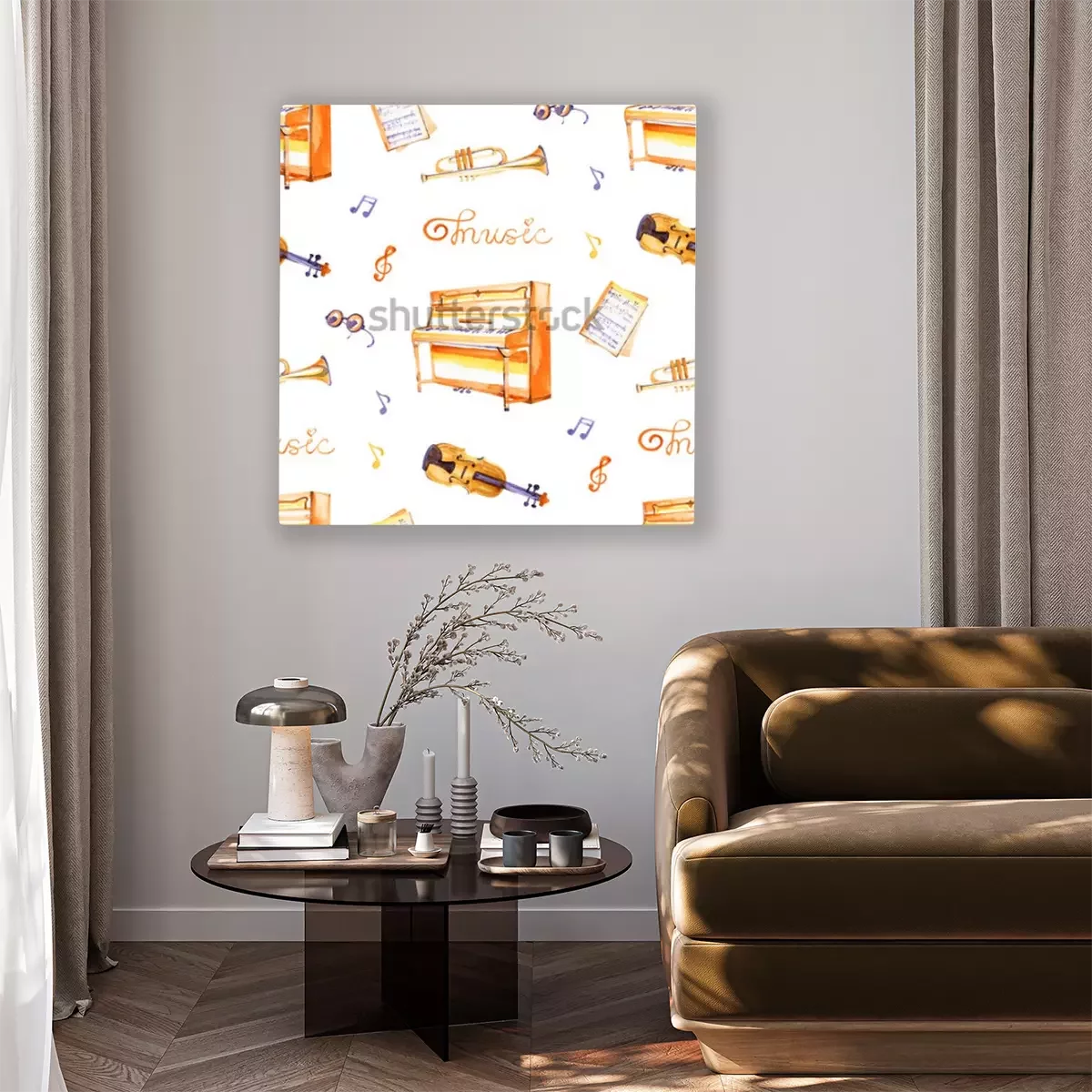 Tableau  Un modèle sans couture avec des instruments de musique dessinés à la main sur une texture de fond aquarelle.
