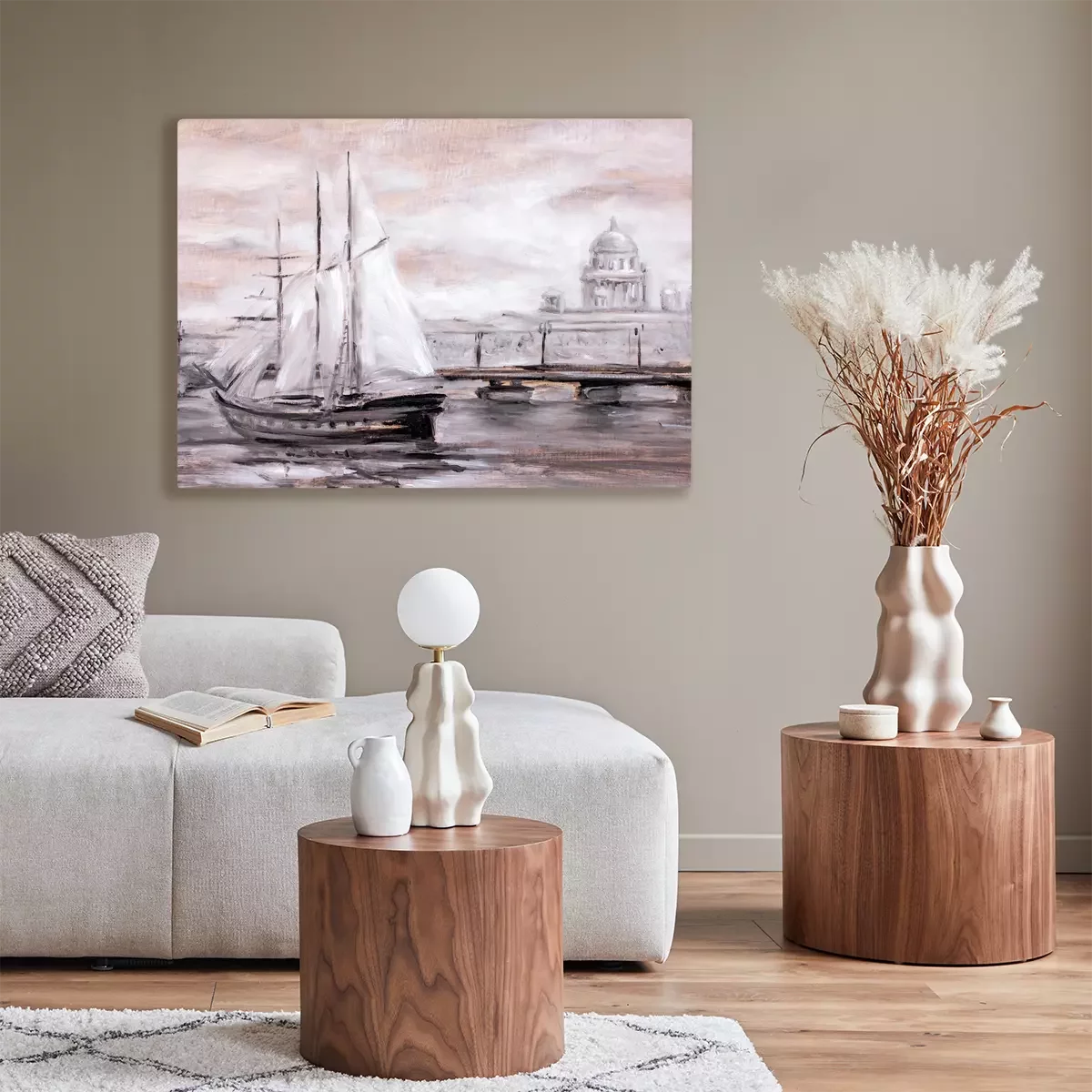 Un navire peint avec un panorama urbain en arrière-plan