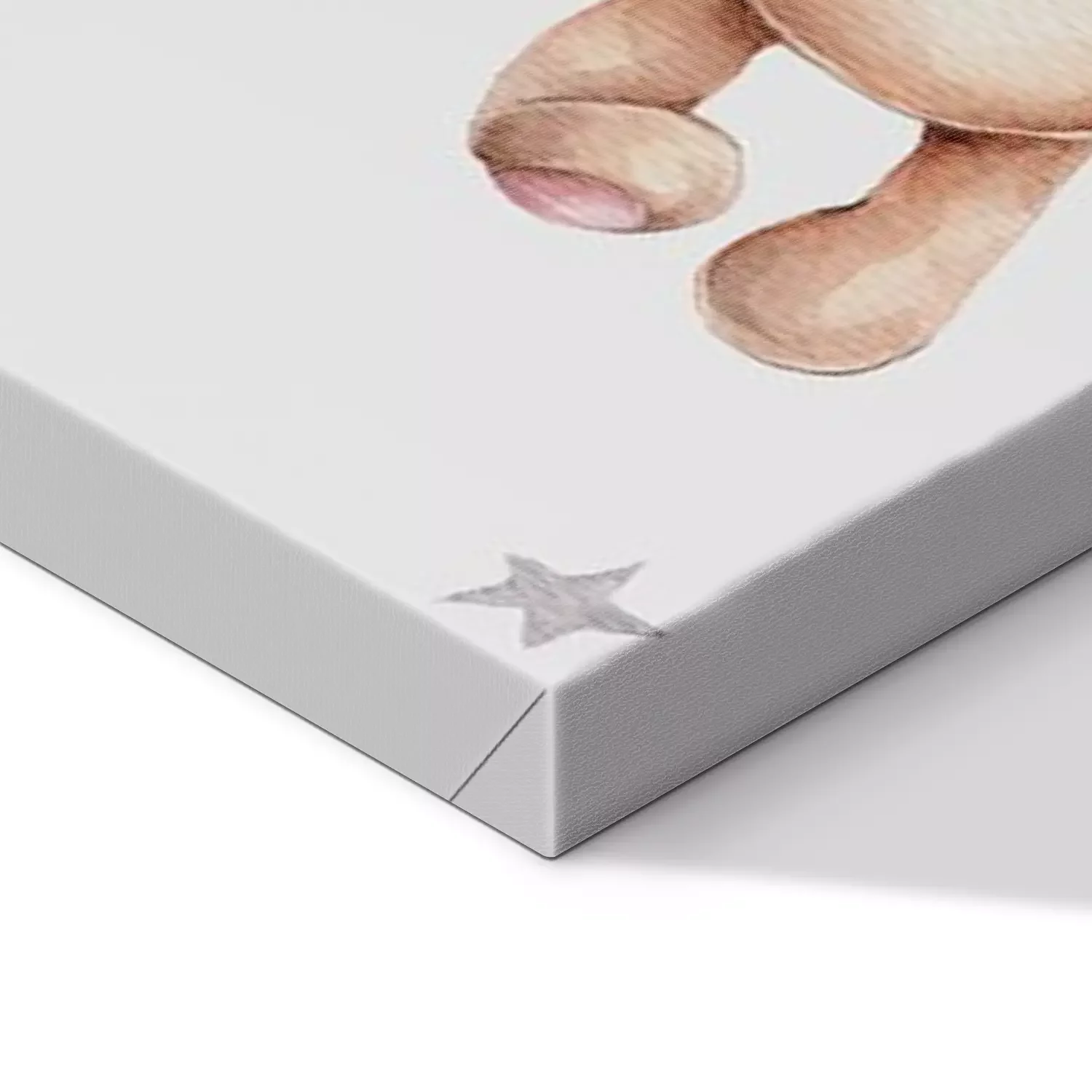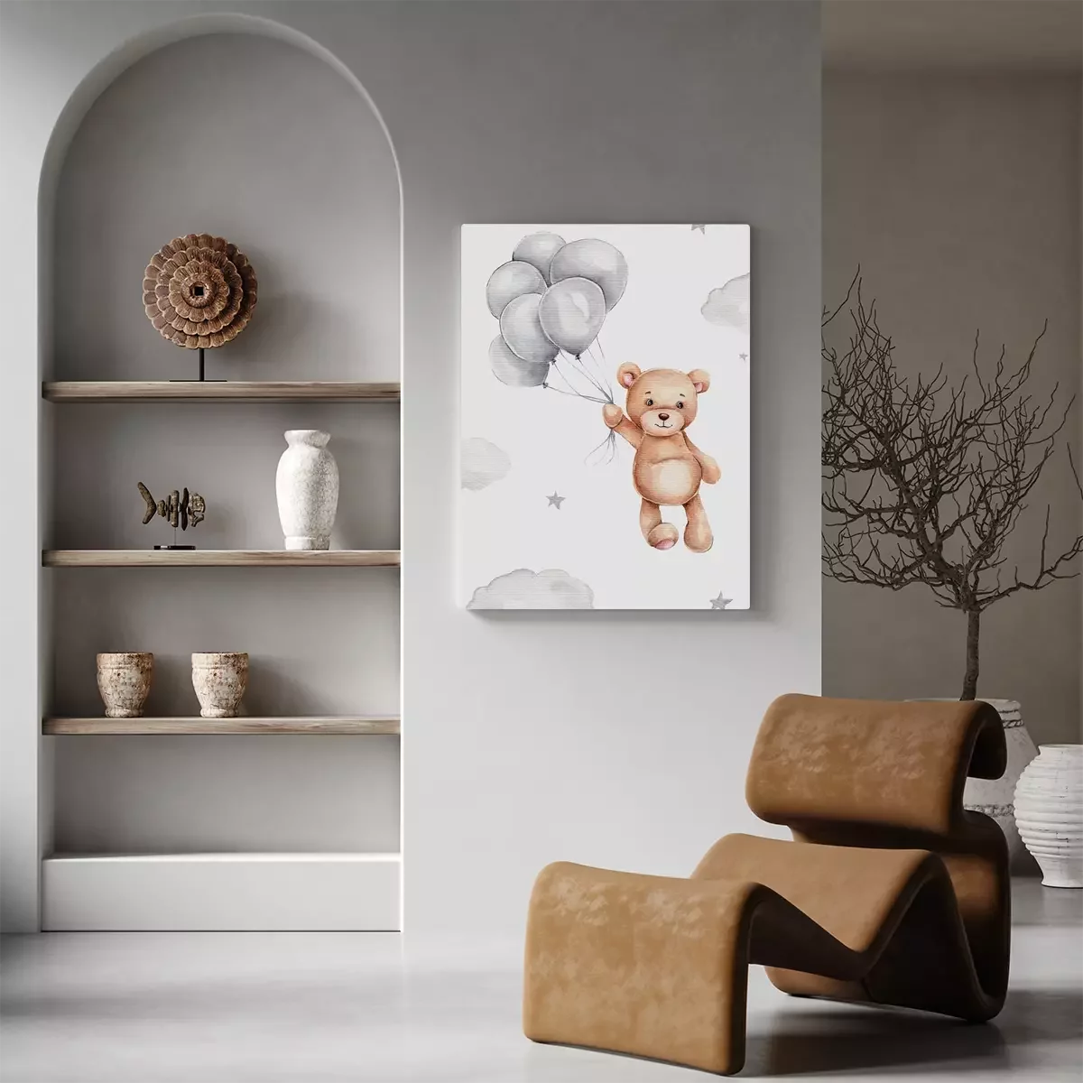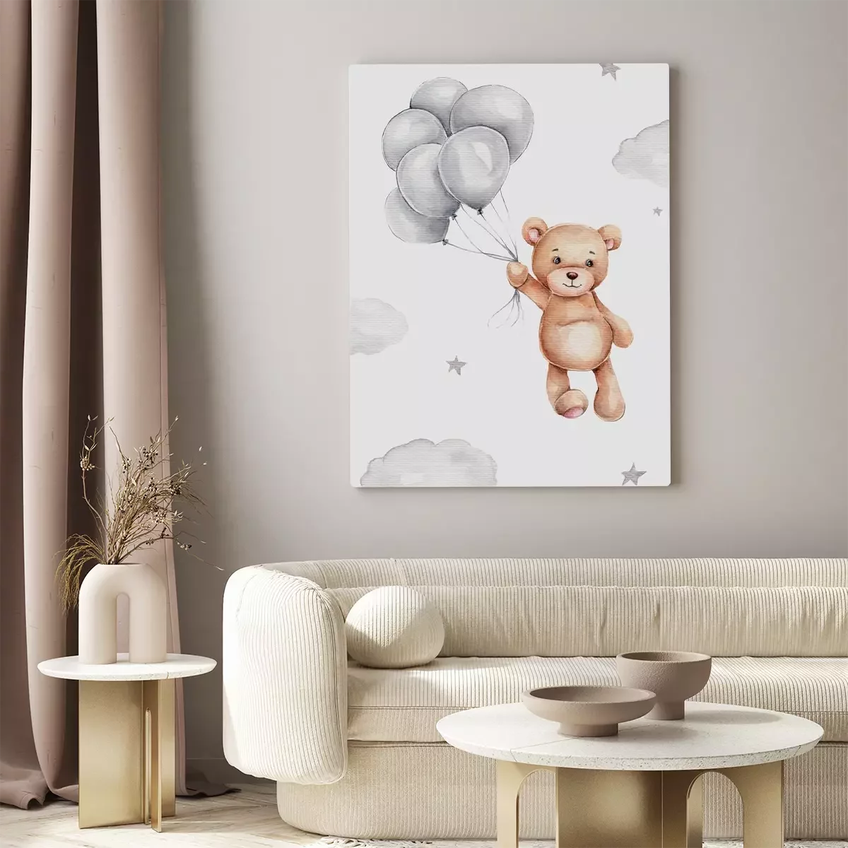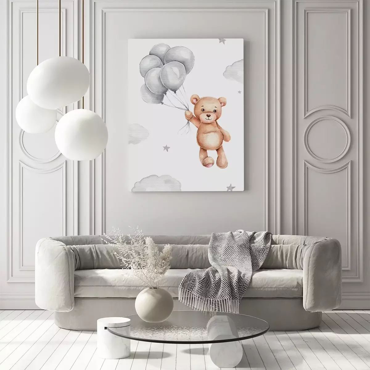 Un ours en peluche flottant parmi les nuages, tenant des ballons.