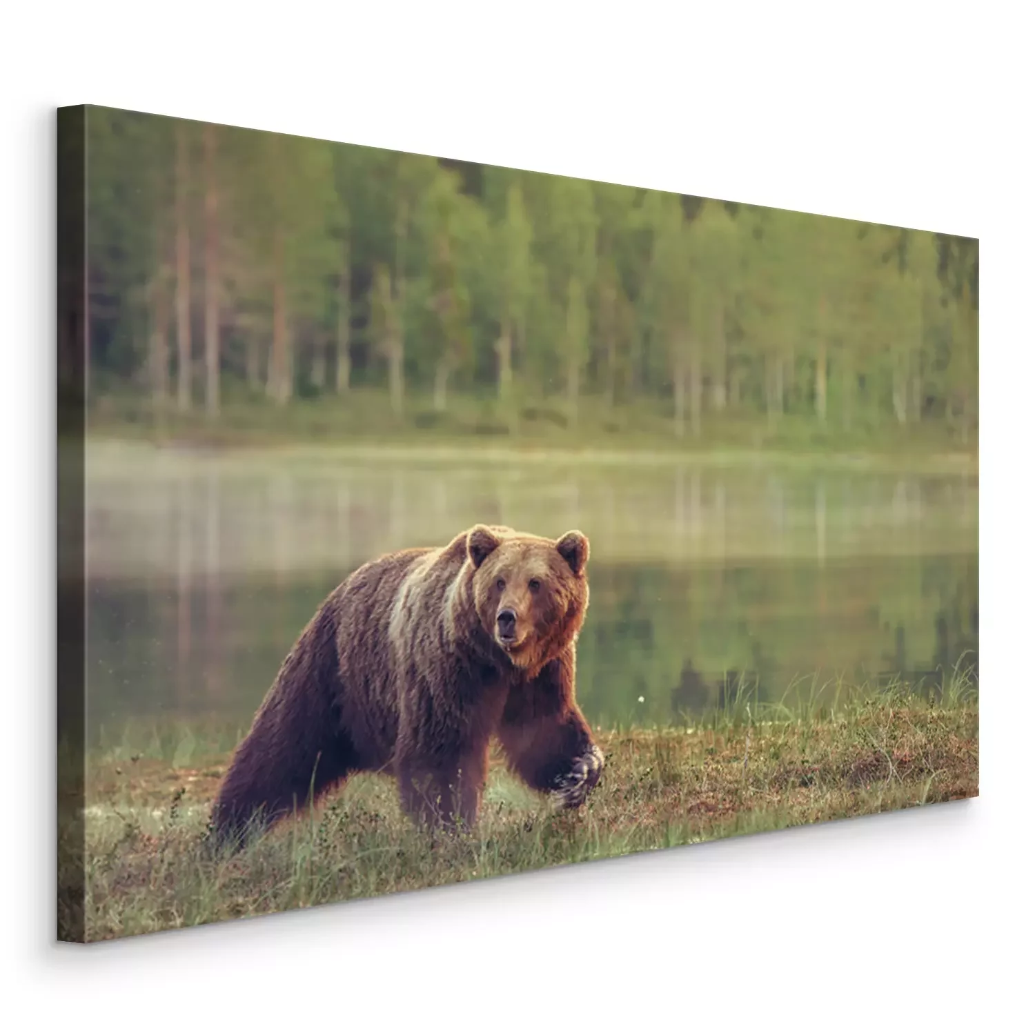 Tableau : Un ours sur fond de lac et de paysage forestier