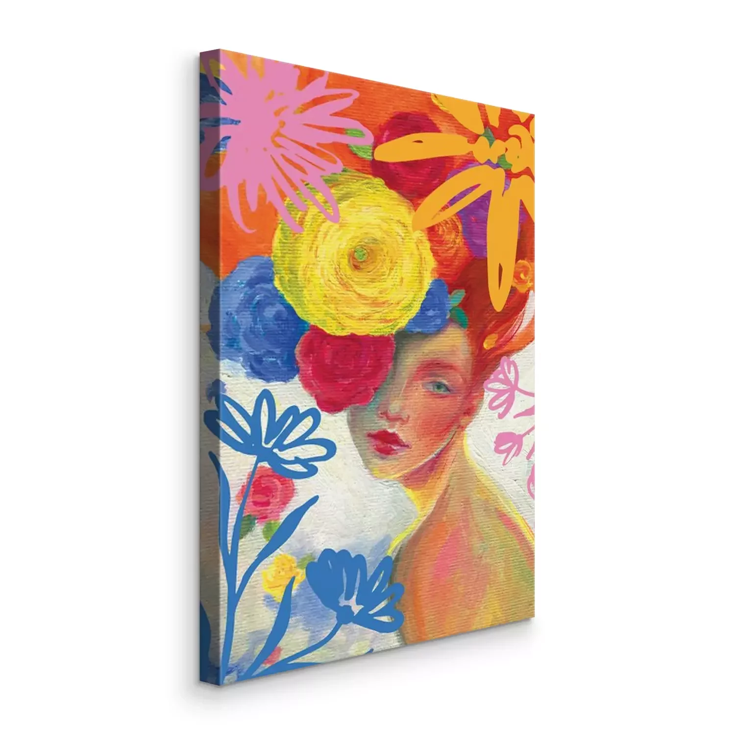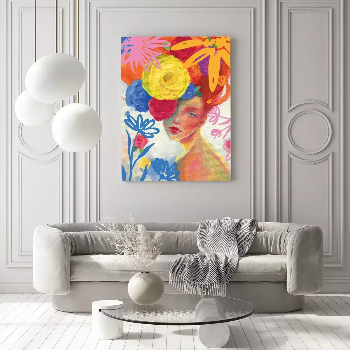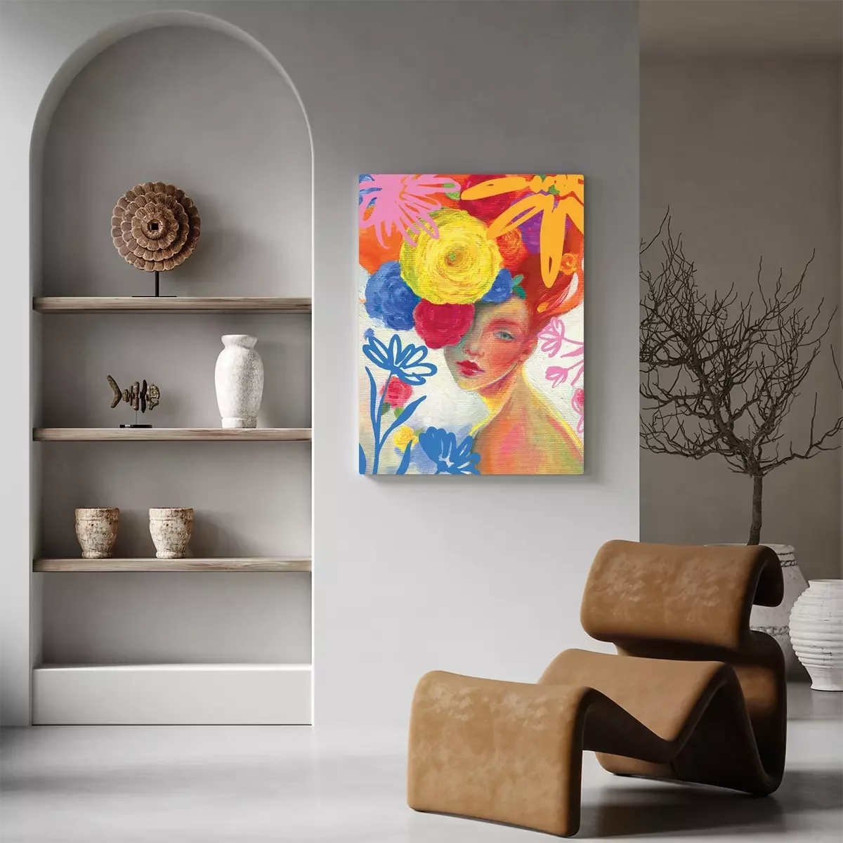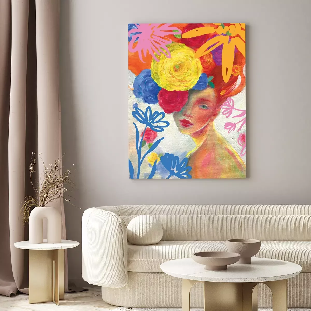 Tableau : Un portrait subtil d'une femme entourée de fleurs colorées