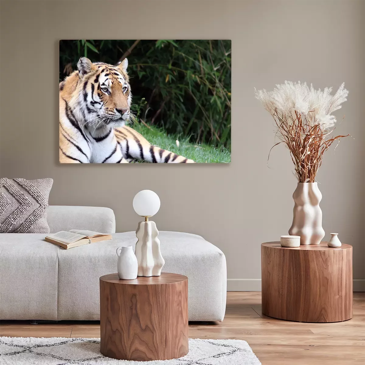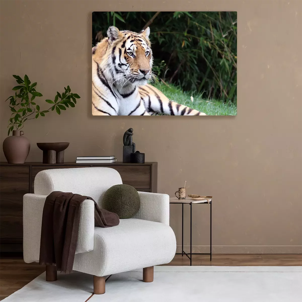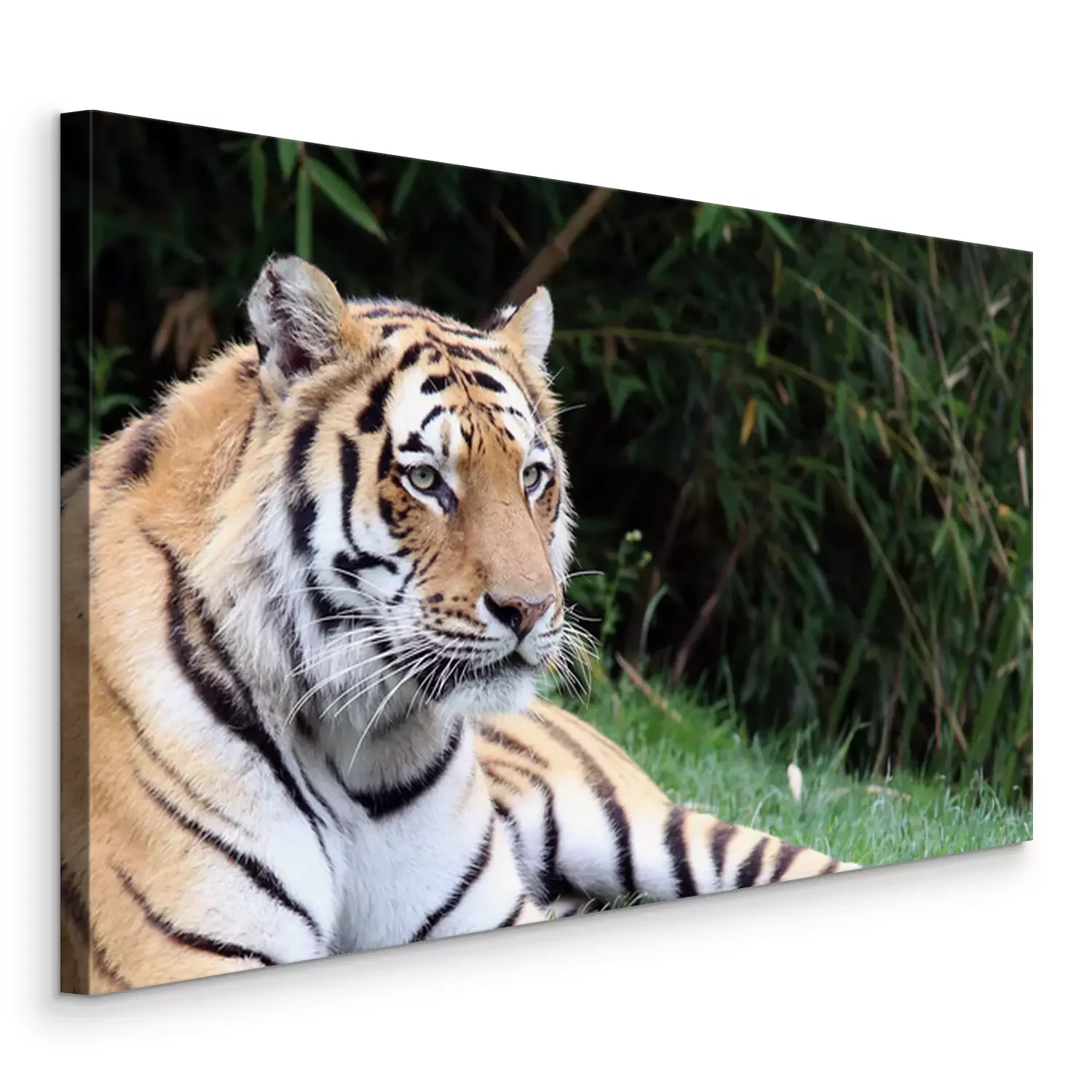 Tableau : Un tigre allongé sur l'herbe