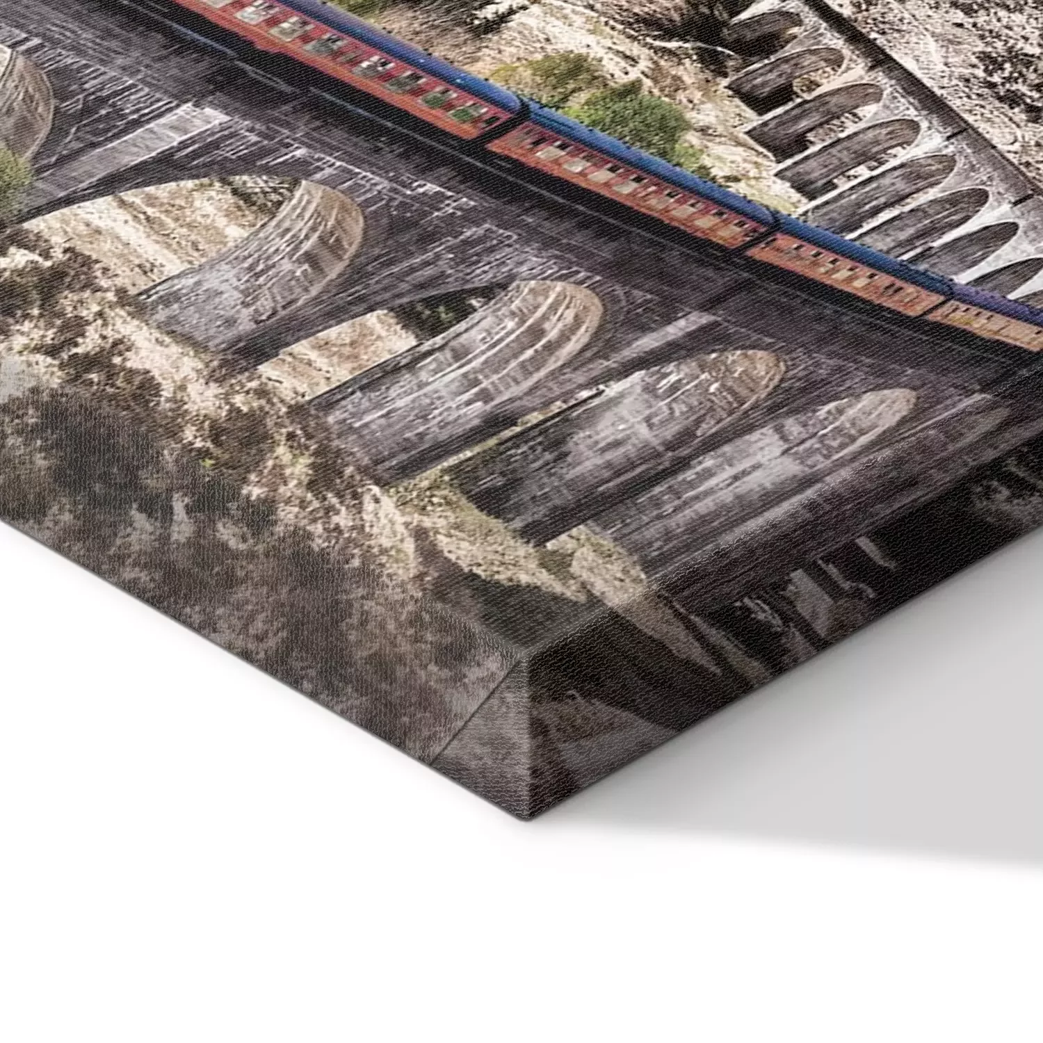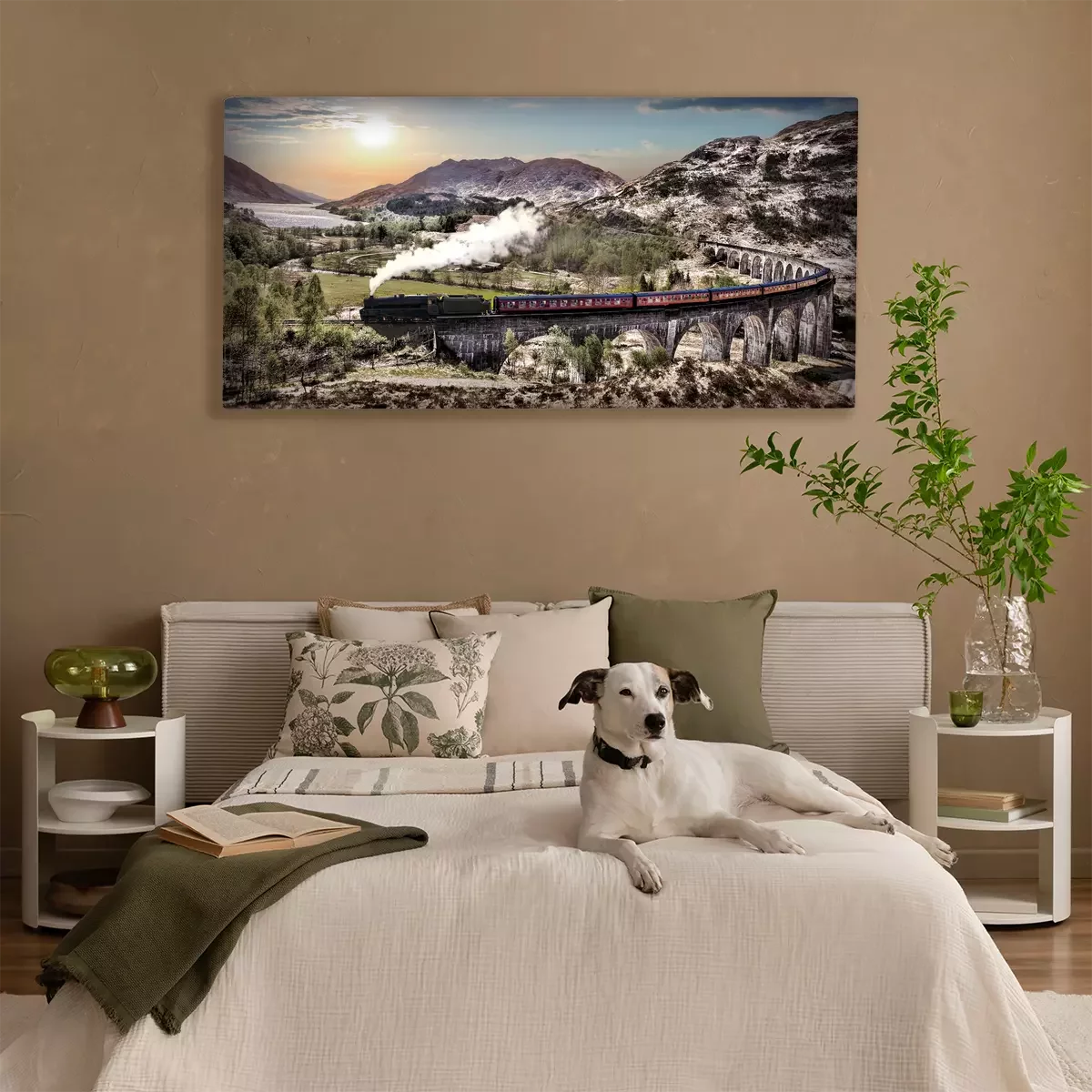 Un train au milieu des montagnes et des lacs au coucher du soleil
