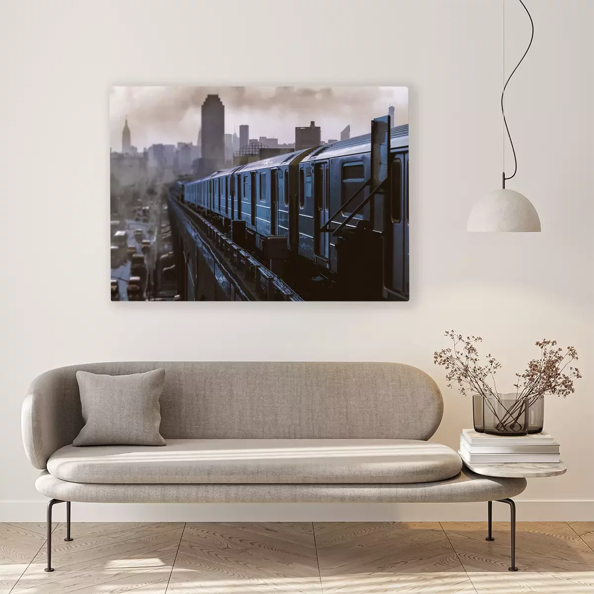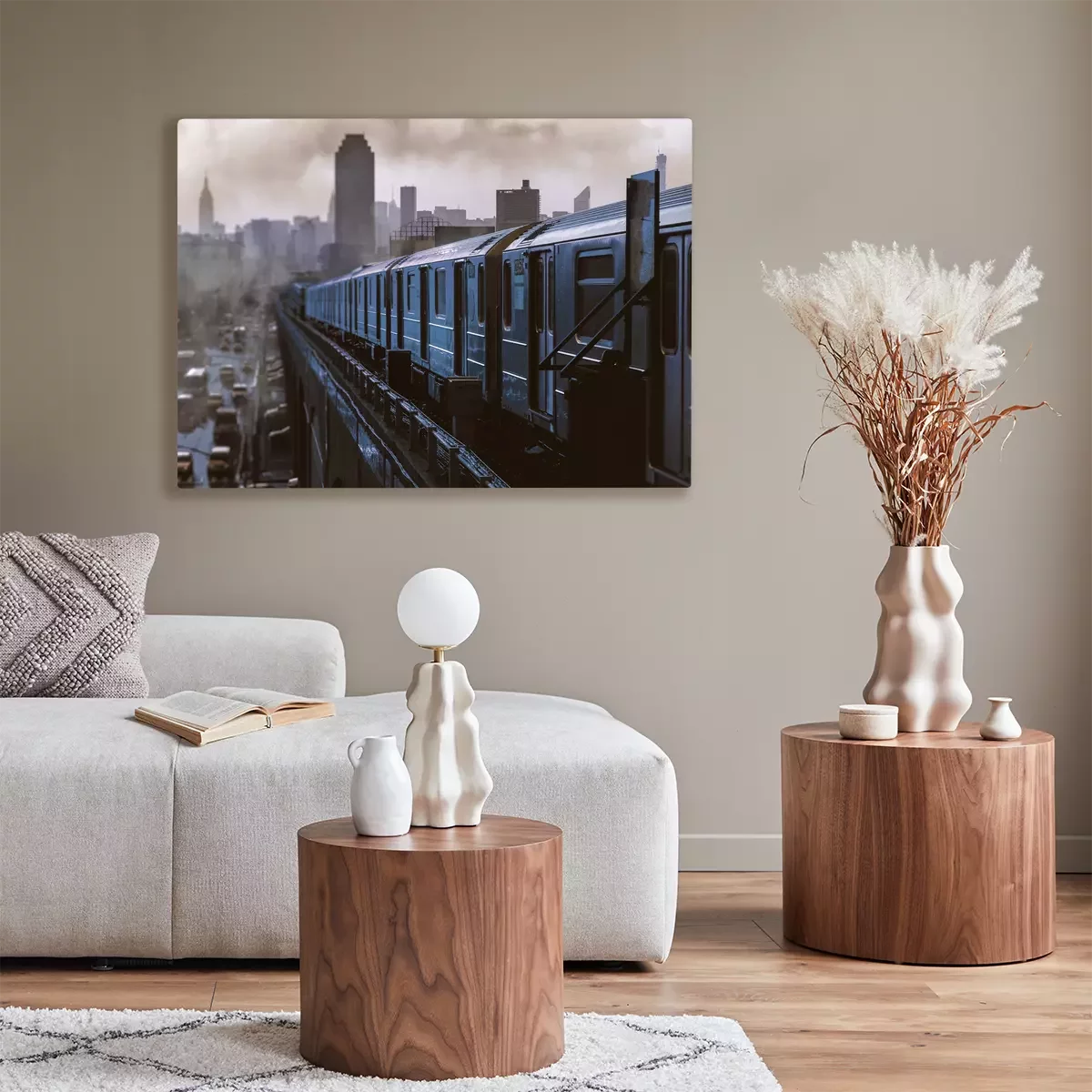 Un train avec un panorama de gratte-ciel en arrière-plan