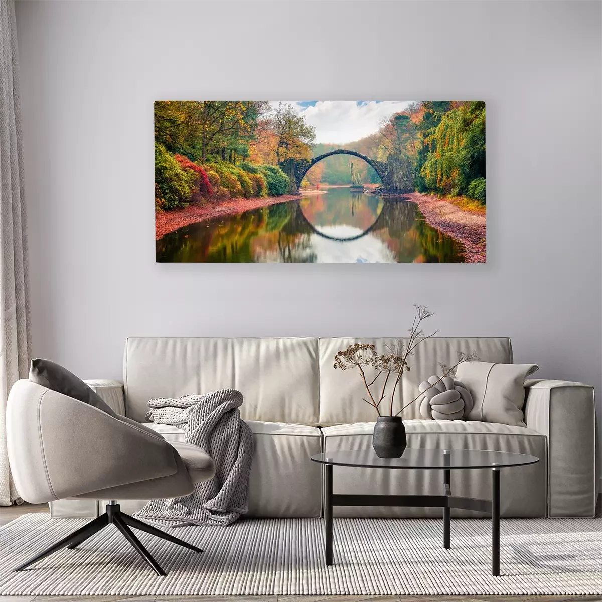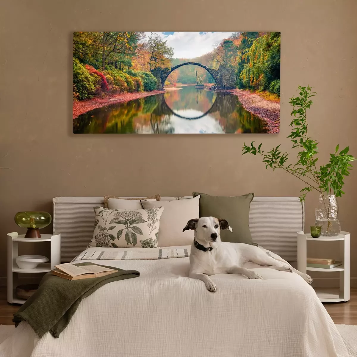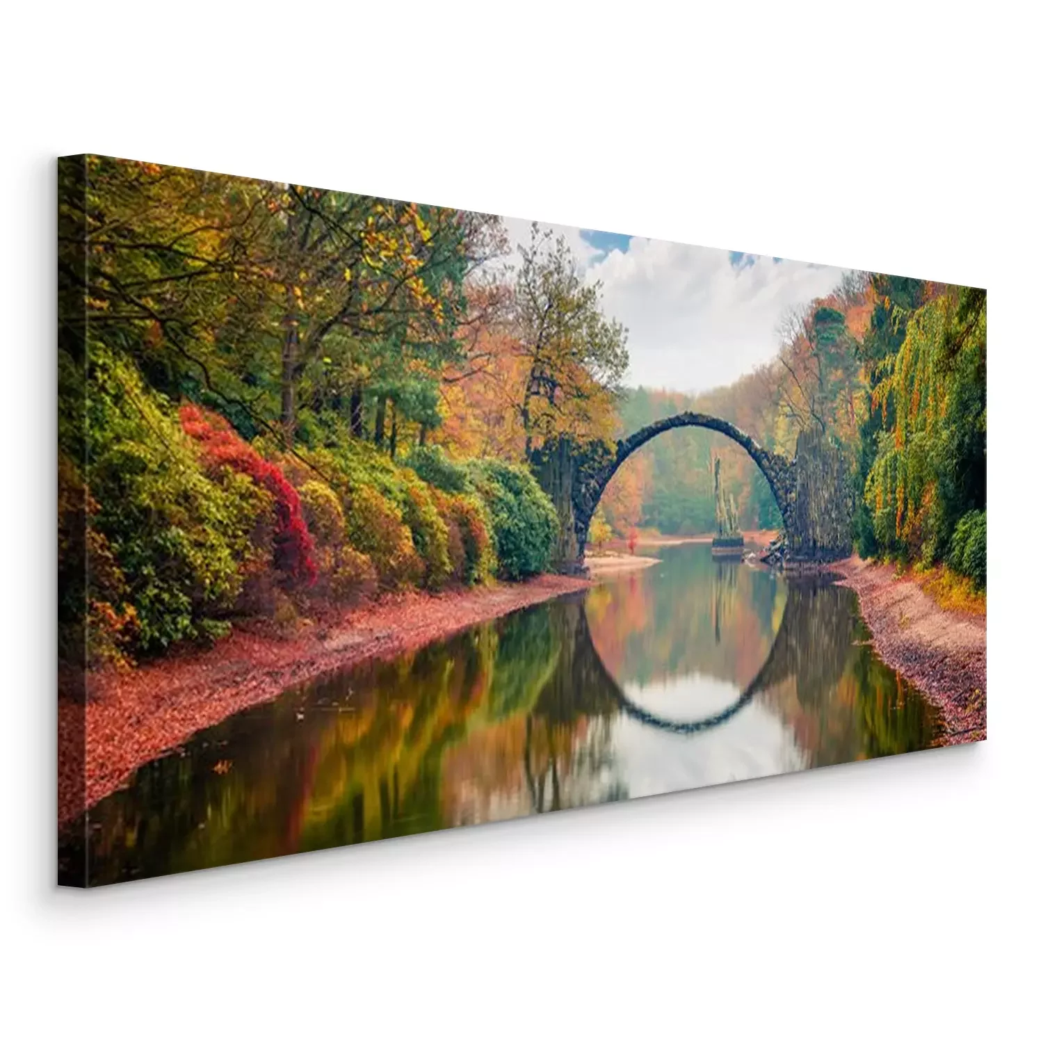 Tableau  Unbelievable morning scene of Azalea and Rhododendron Park Kromlau, Germany, Europe. Great autumn panorama of Rakotz Bridge (Rakotzbrucke, Devil's Bridge). Traveling concept background.