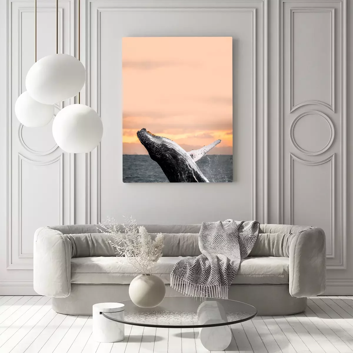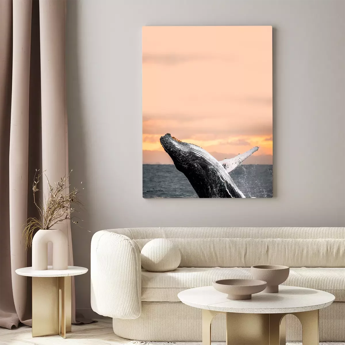 Une baleine bondit dans l'eau au coucher du soleil