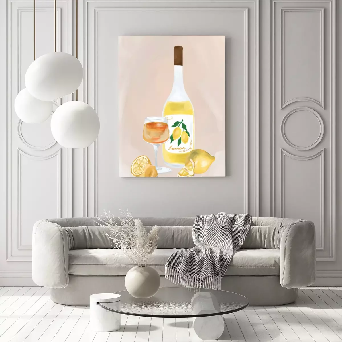 Tableau : Une bouteille de vin au citron avec un verre sur la table
