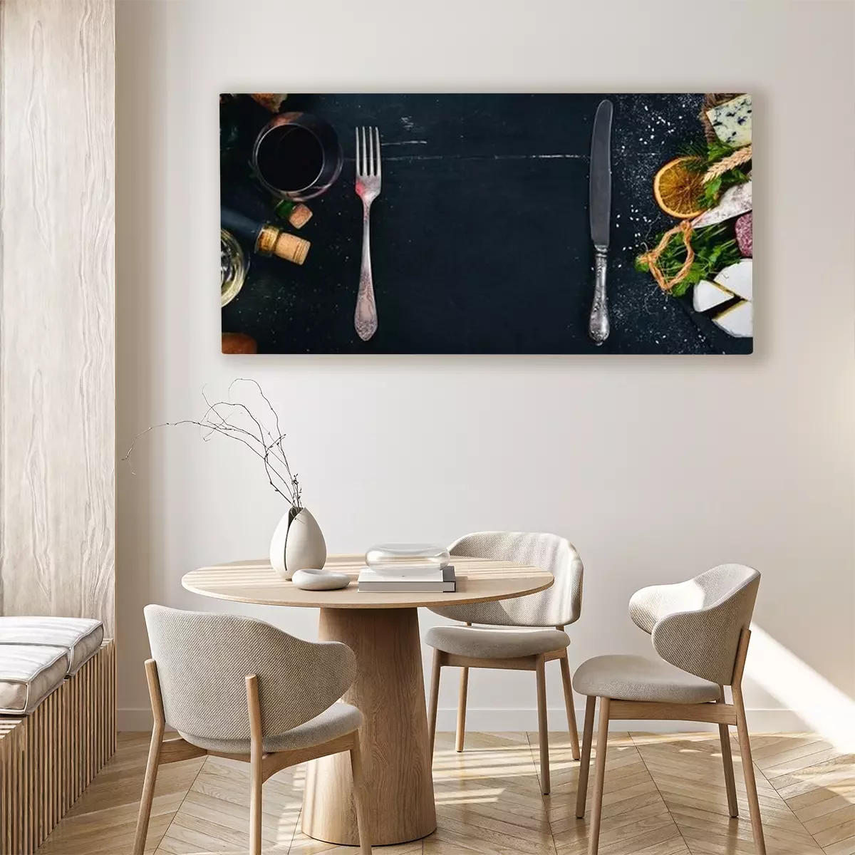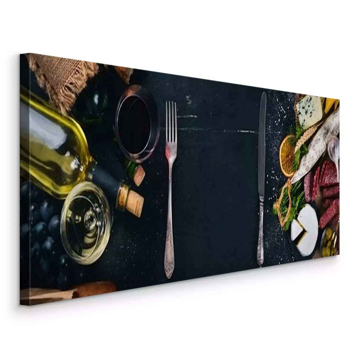Tableau  Une bouteille de vin, des fromages et des saucisses traditionnelles sur un fond en bois. Brie, fromage bleu, gorgonzola, fuete, salami. Espace libre pour le texte. Vue de dessus
