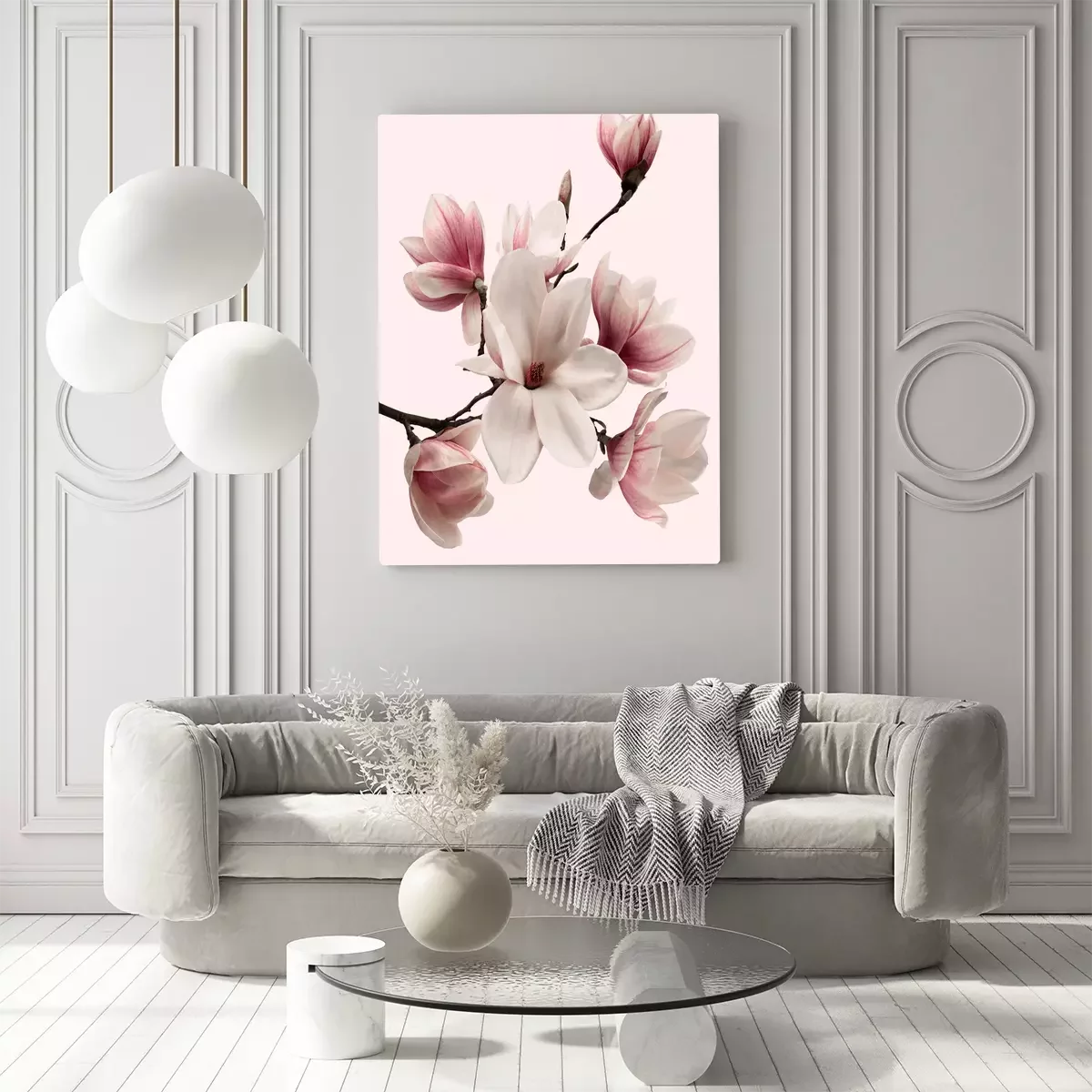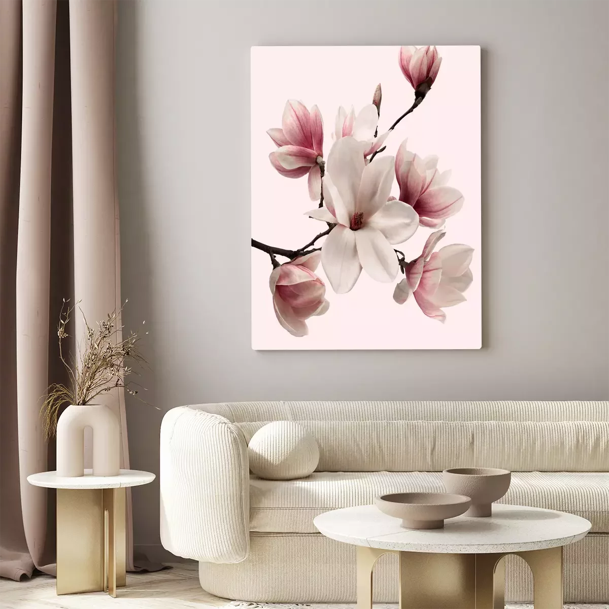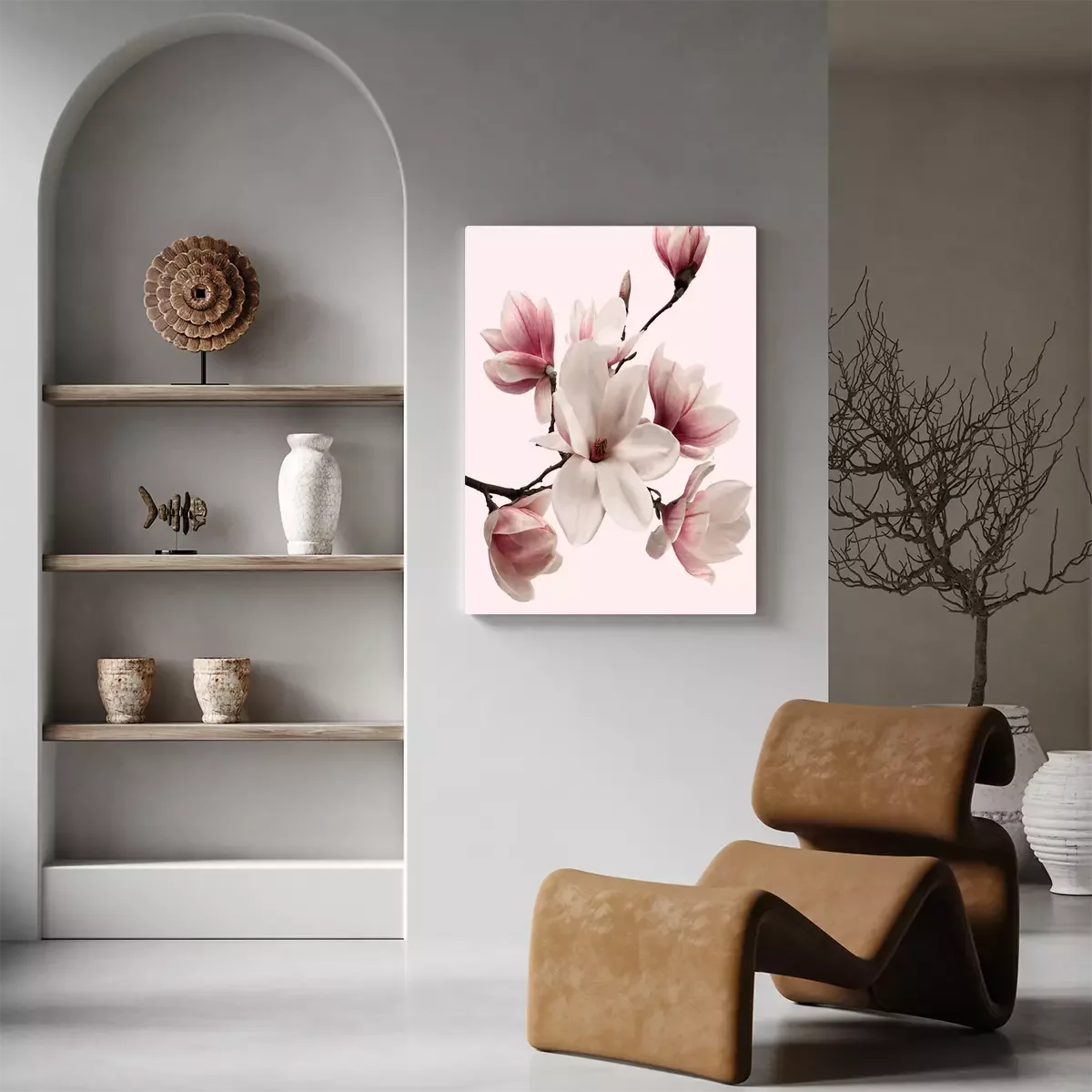 Une branche de magnolia en fleurs, d'un rose délicat.